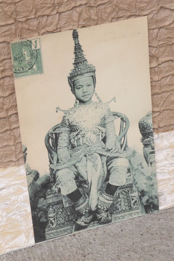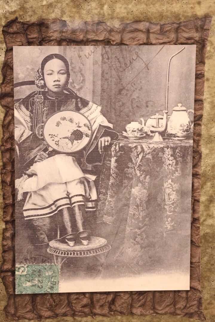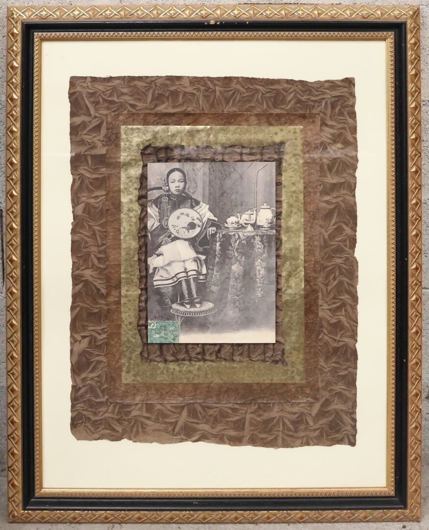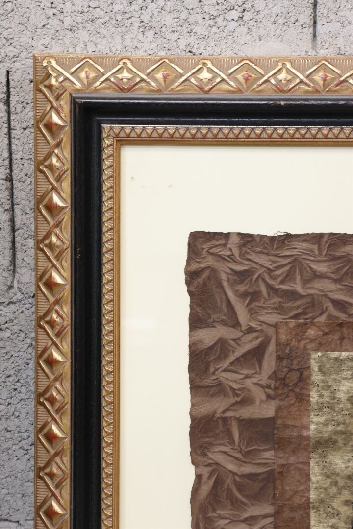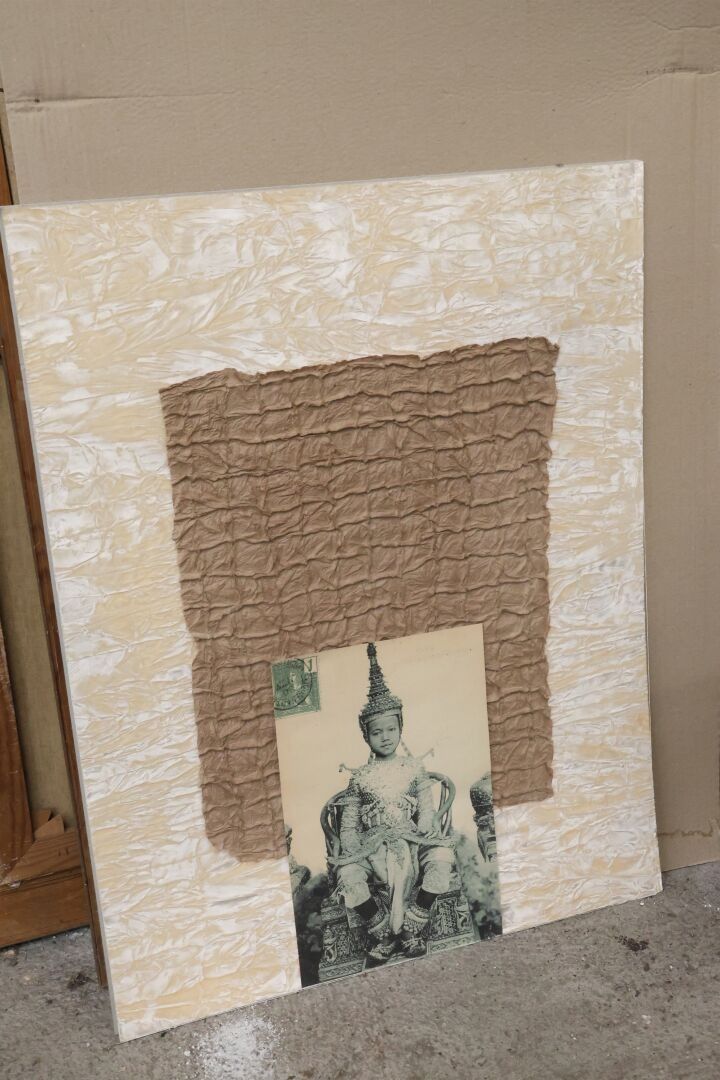 Colour reproduction of a postcard embellished with fabric and pleated paper, modern frame. Damage 100 x 80 cm (framed) + 1 unframed