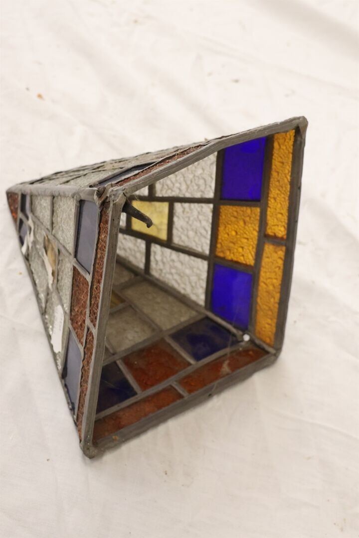 Hanging lamp in stained glass, coloured granite glass and pewter. 24 x 18 x 18 cm