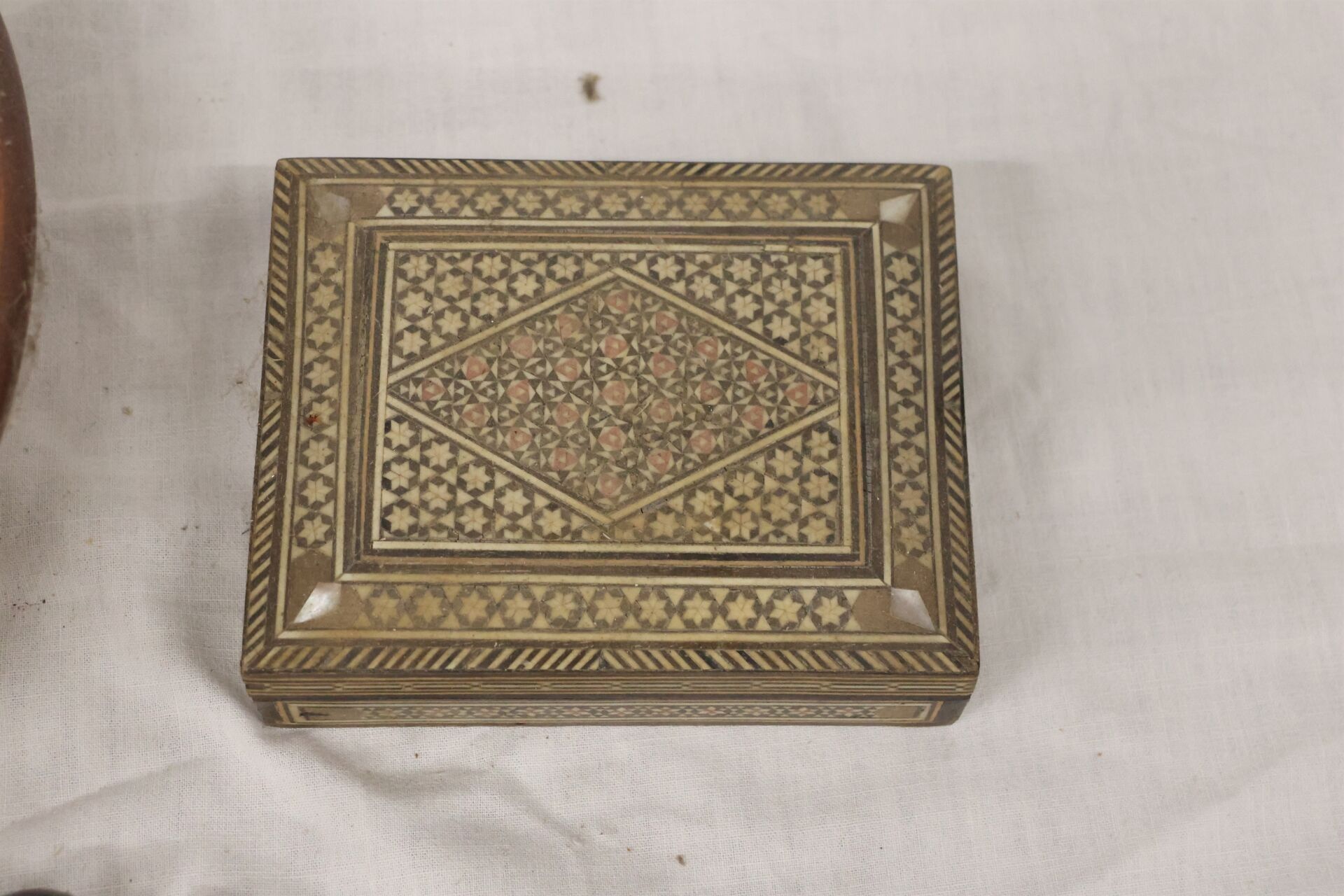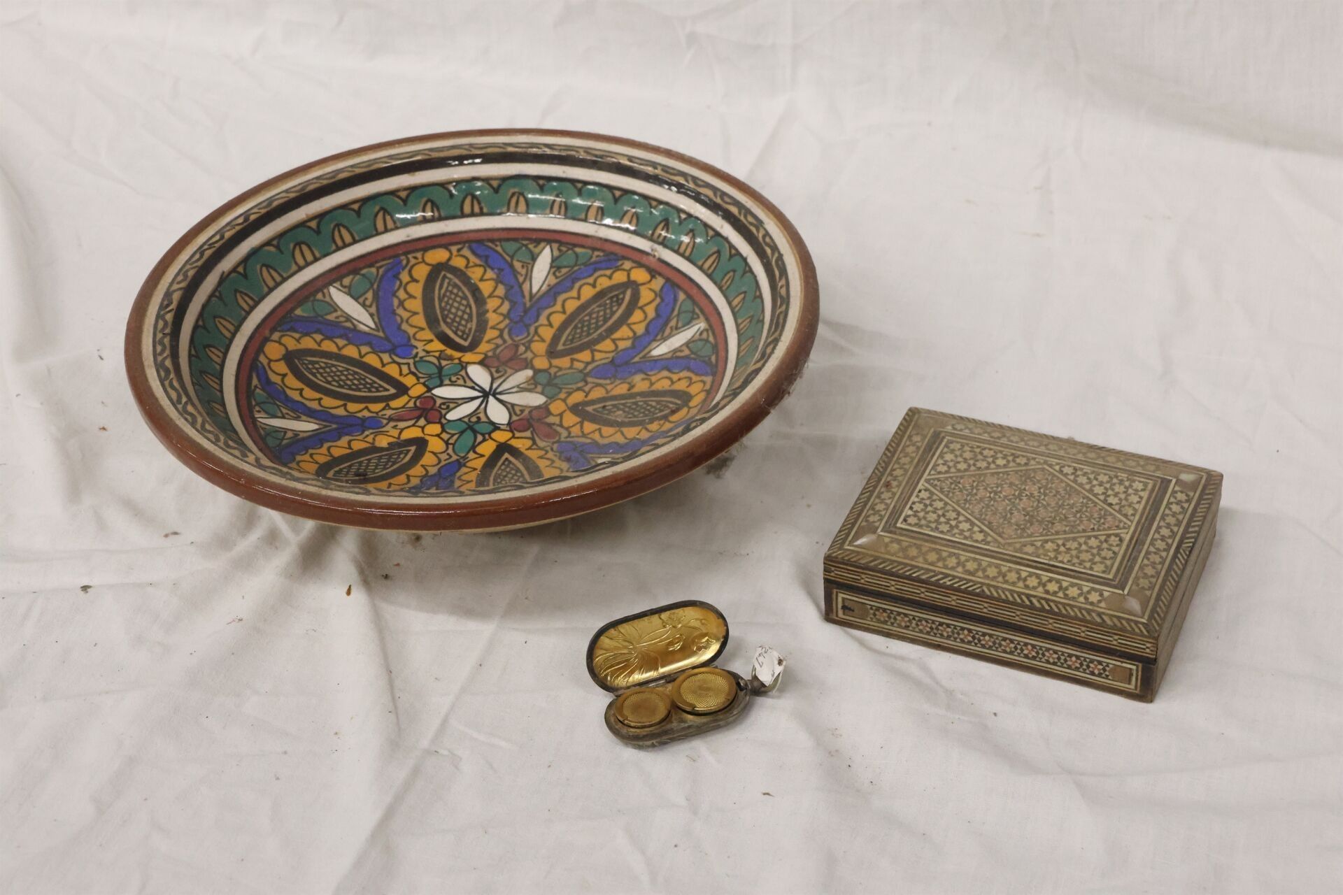 Moroccan polychrome glazed earthenware bowl + oriental marquetry box + Art Nouveau style silver-plated metal louis holder