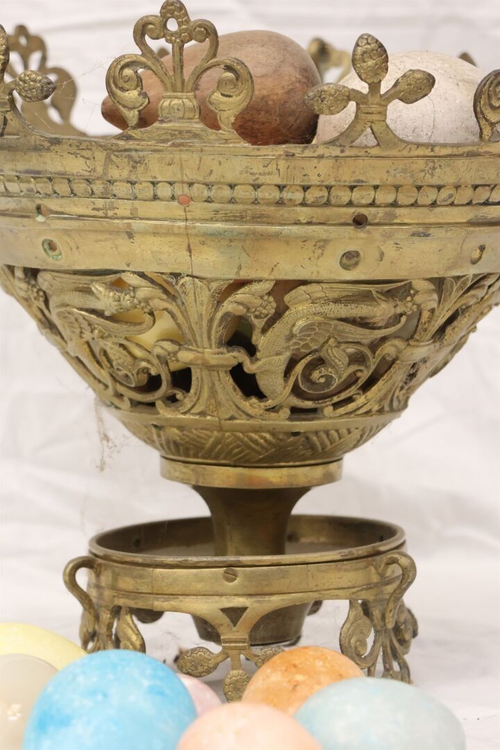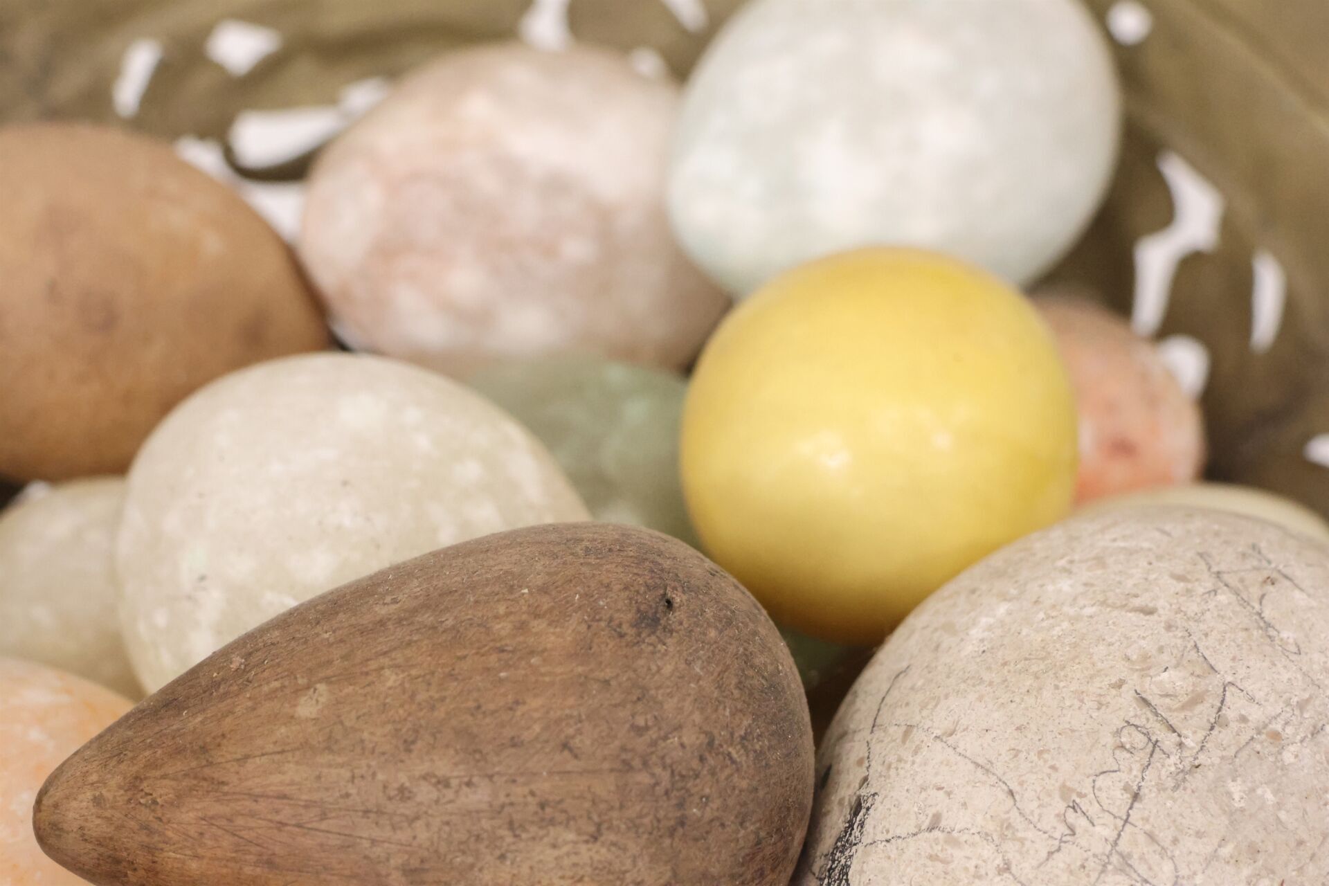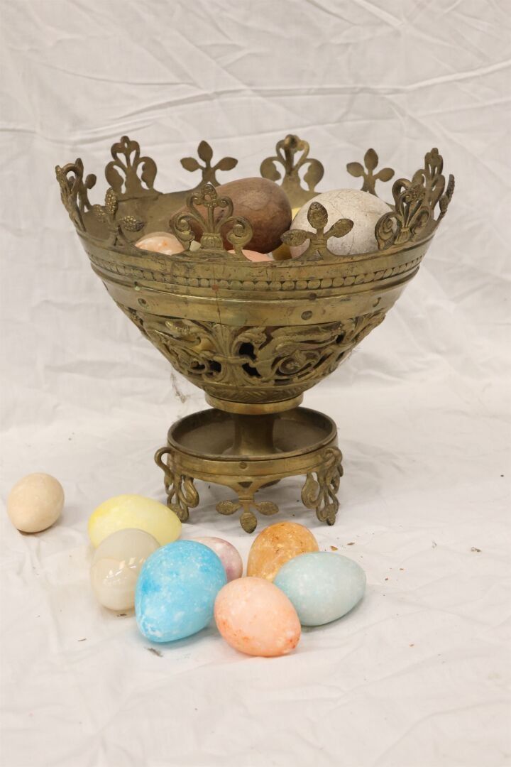 Set of hard stone eggs and adjoining Renaissance-style brozne bowl. Height 26 diam 28 cm for the bowl
