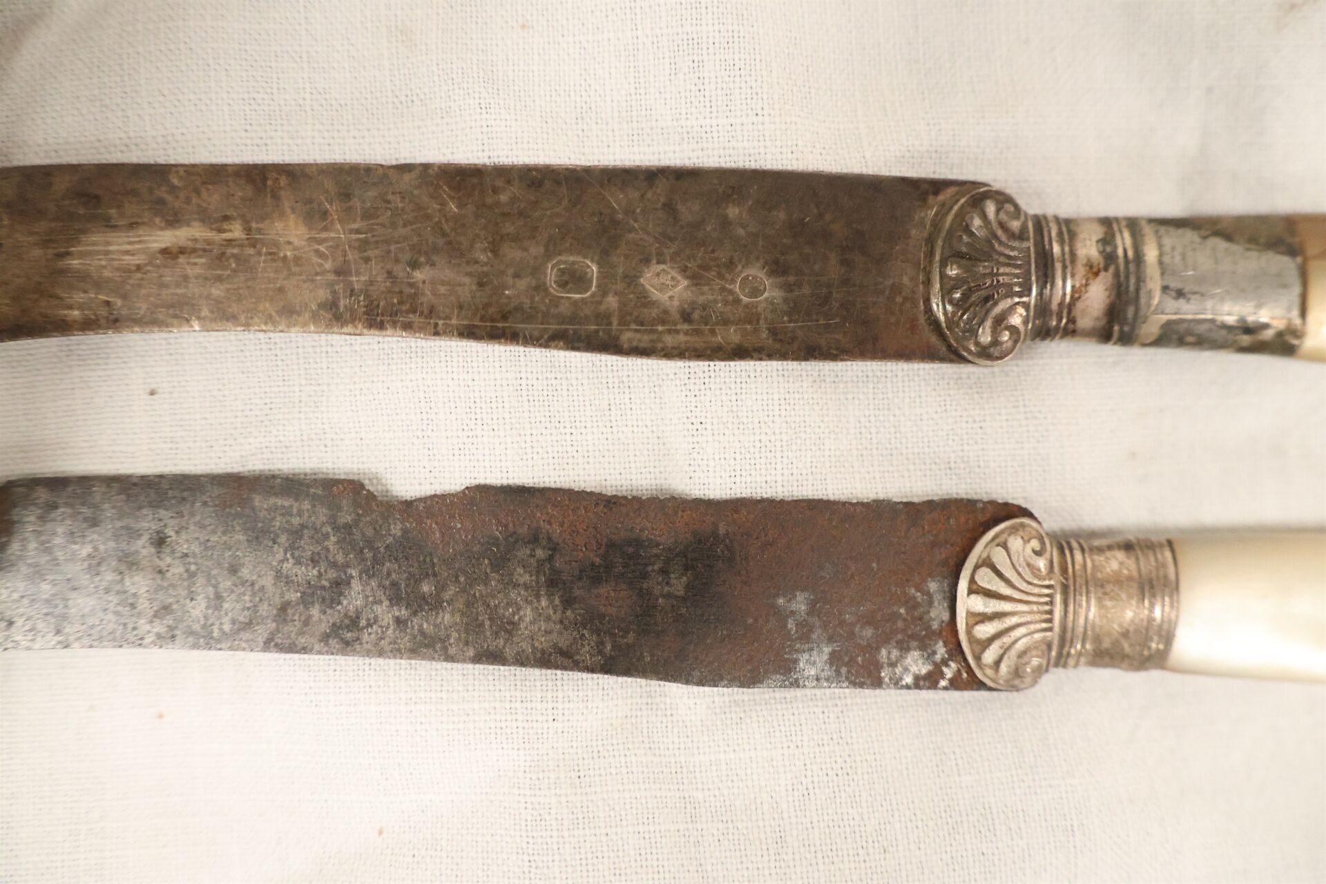 Silver ladle, sugar tongs and salt shovel weight: 269 grs + two knives with mother-of-pearl handles and non-weighable silver ferrules
