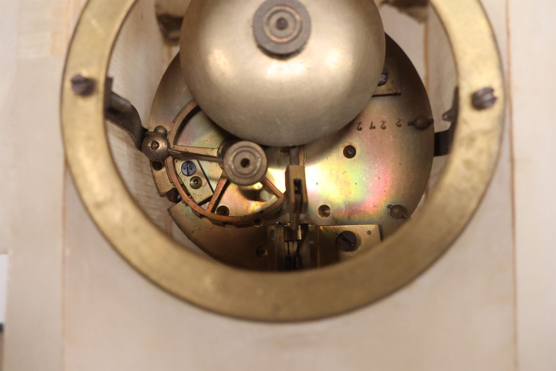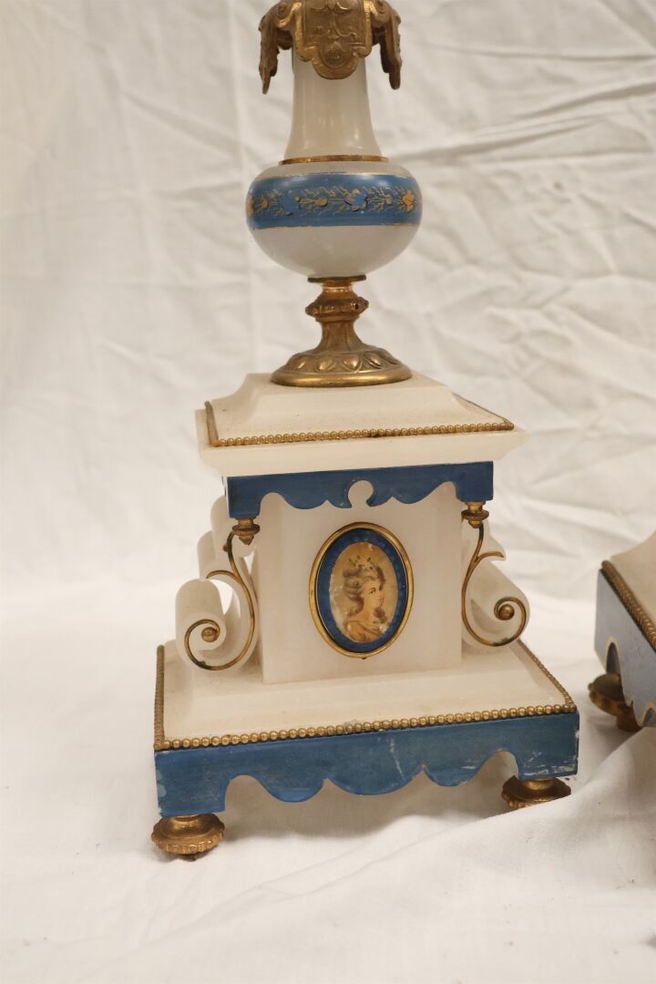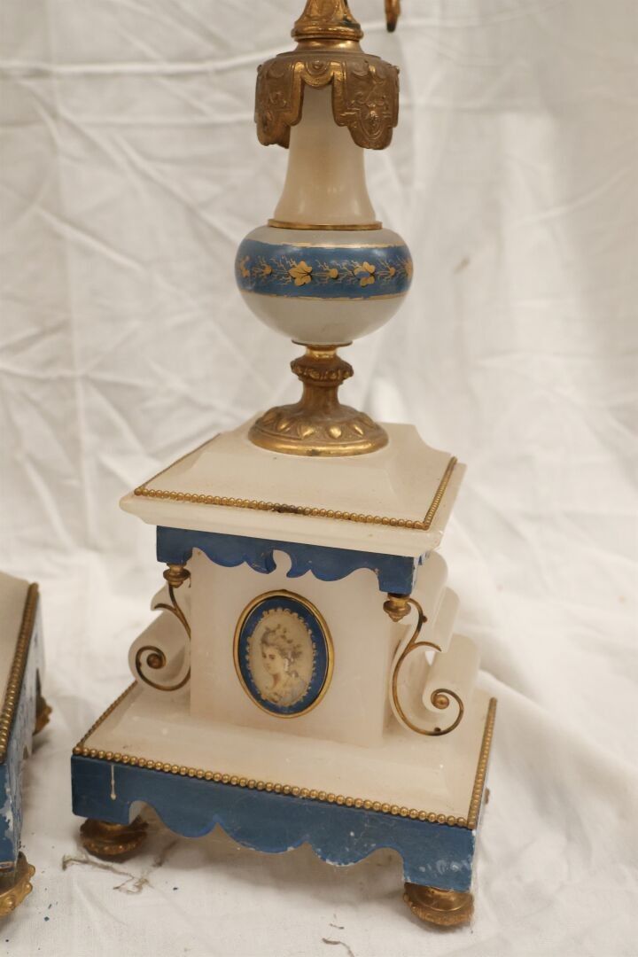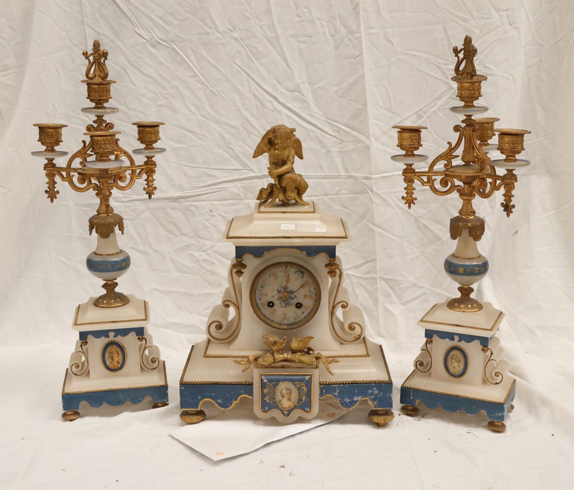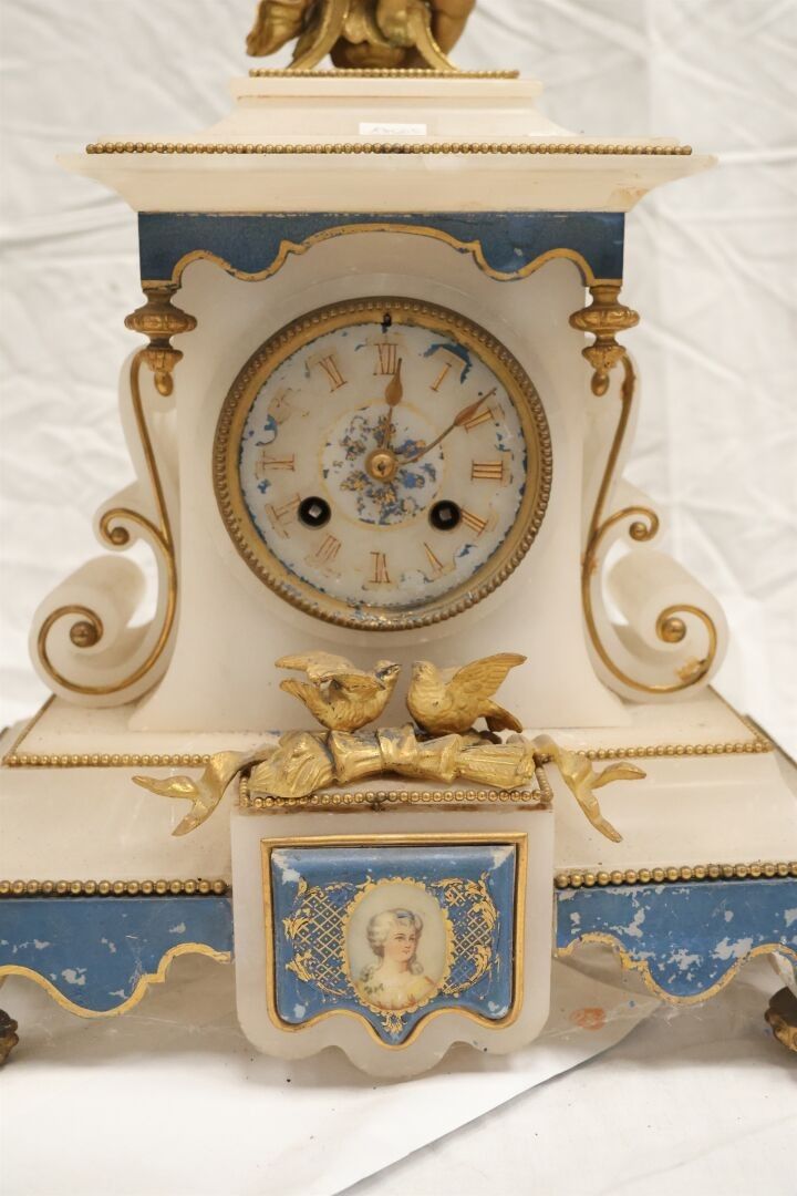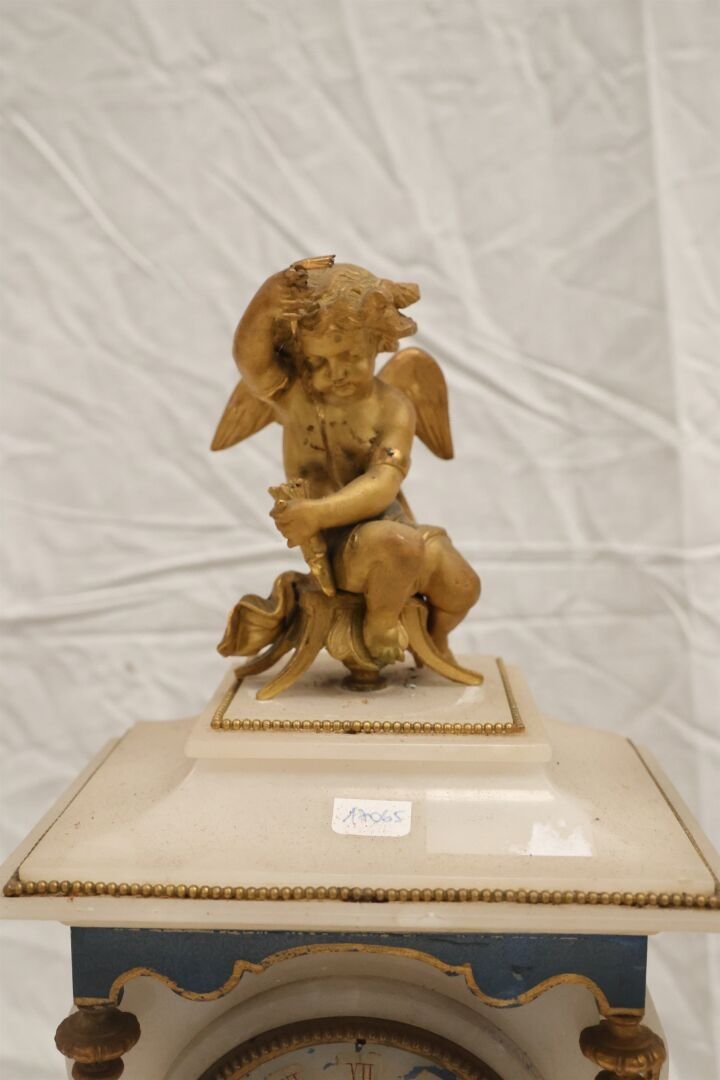 Alabaster and bronze mantel adorned with a winged cherub. Late 19th century. Height: 52 cm candelabra. Height: 42 cm Accidents