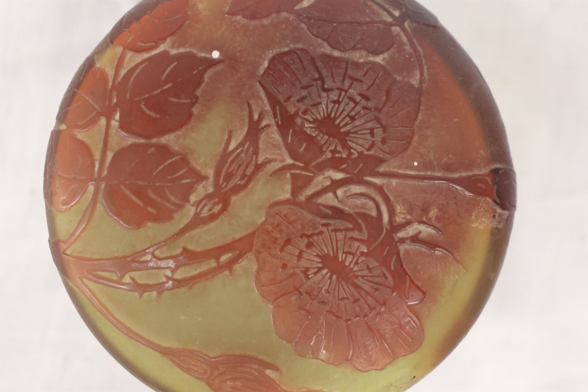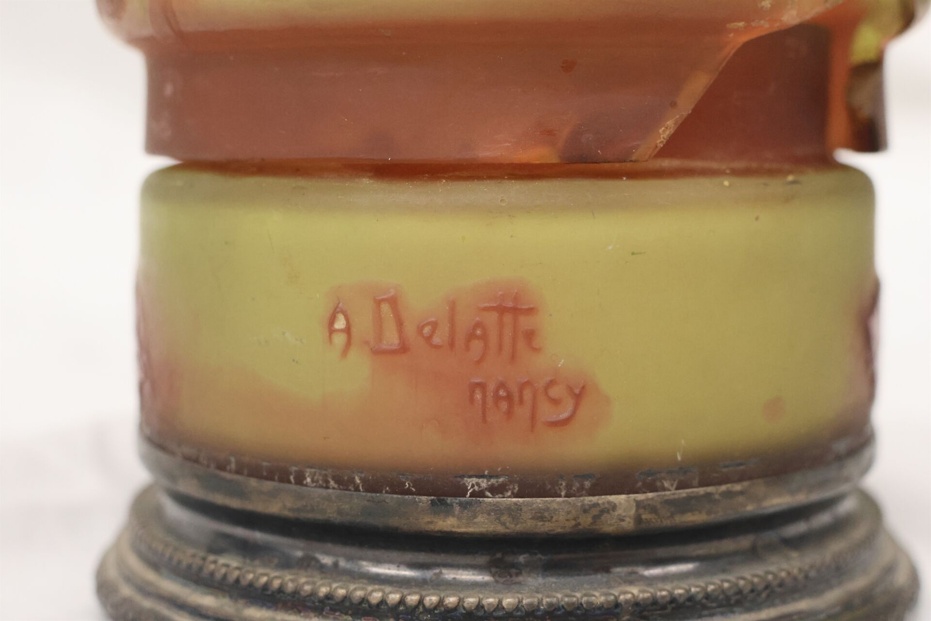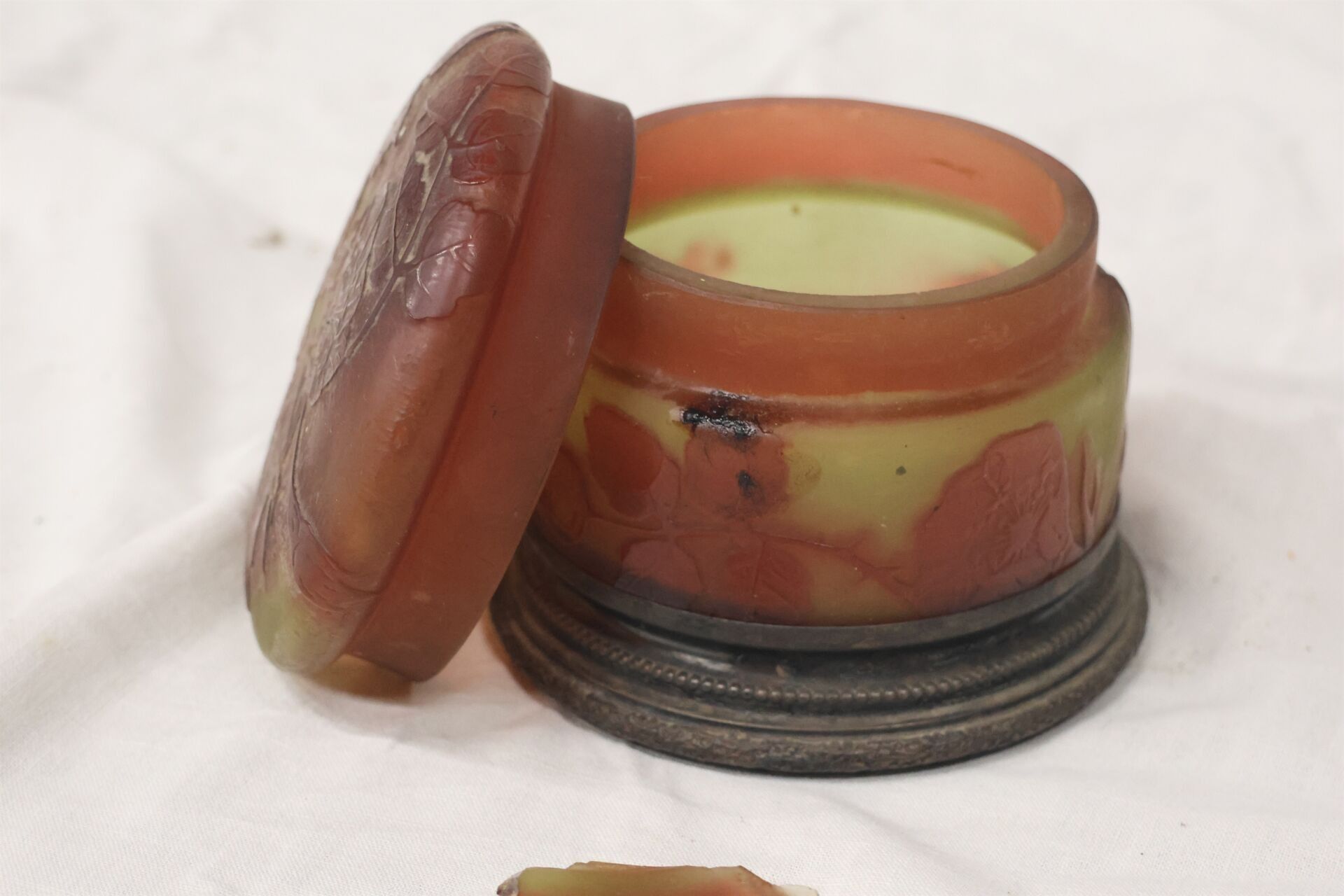 DELATTE A NANCY Acid-etched multi-layered glass box with a floral design. Damage. 6 x 10 cm Solid silver base, Minerve hallmark. 25.3 g .