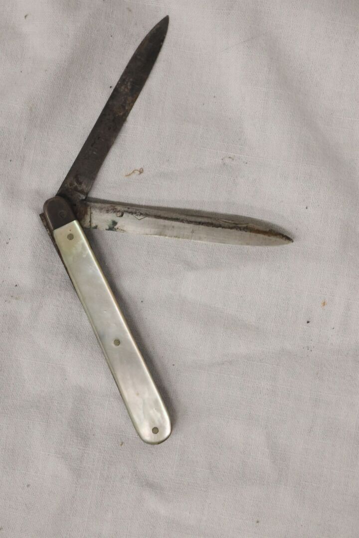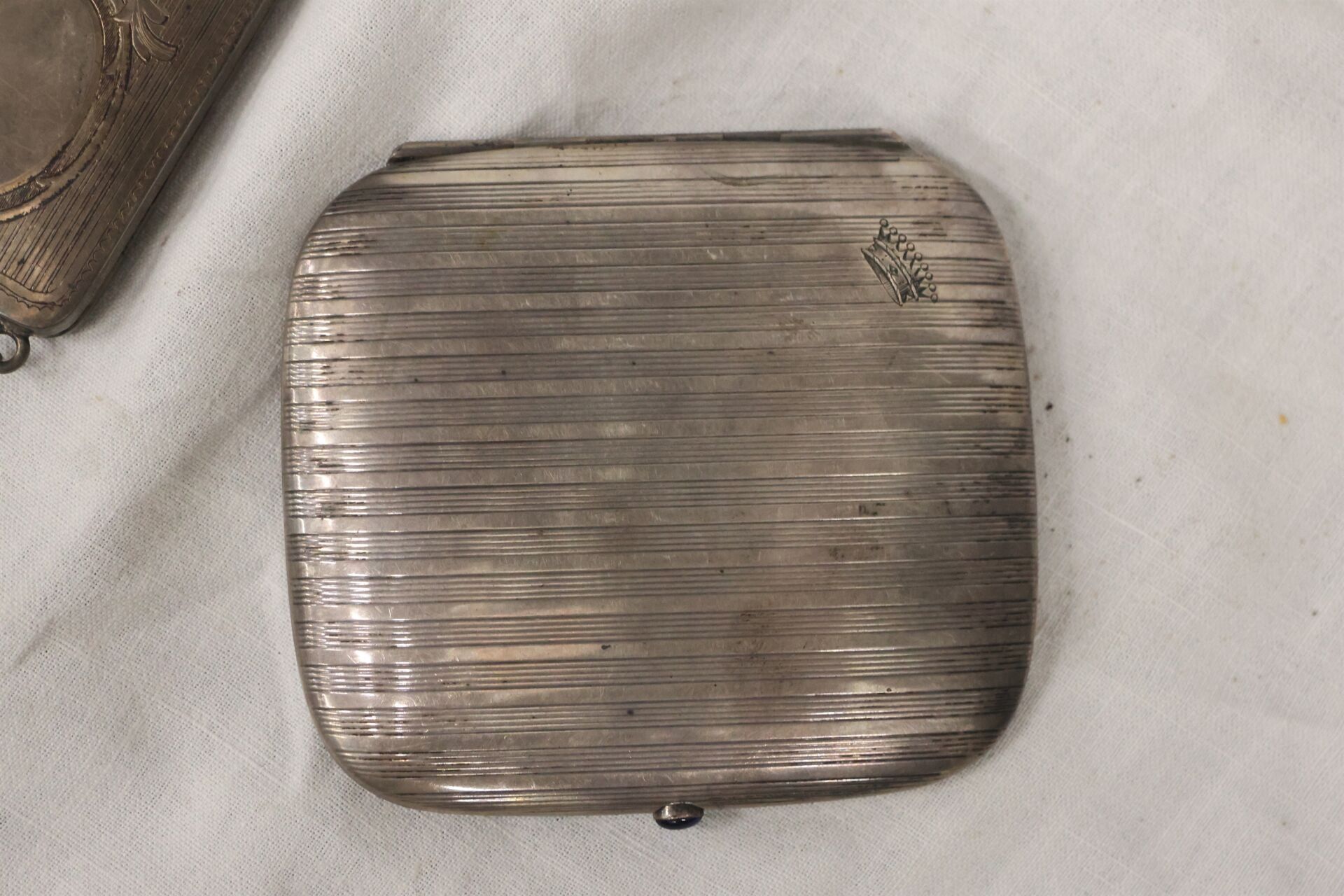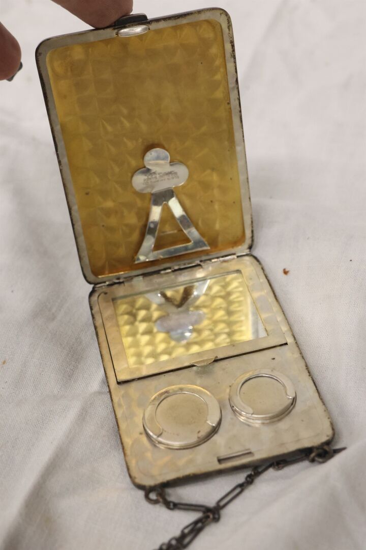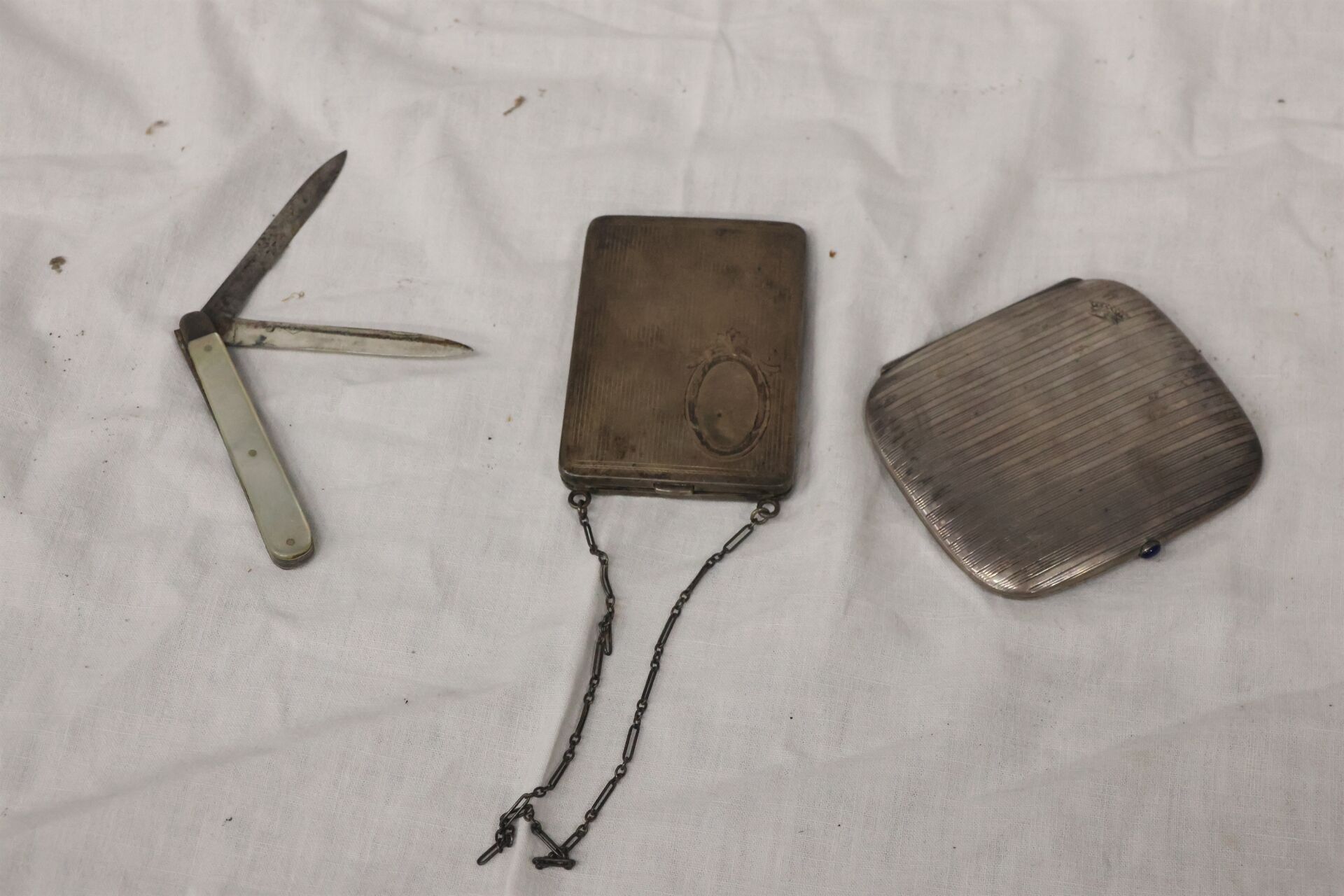 Cigarette case in silver 900/00 with blue stone cabochon 96.7 grs + folding knife with two blades, one of which is silver Minerve hallmarked, not weighable + folding box in silver-plated metal forming a banknote holder, louis holder and compact.