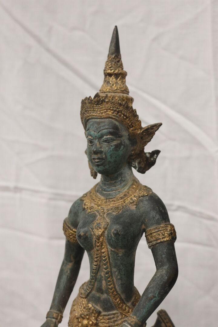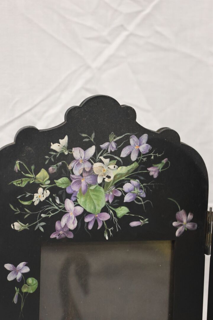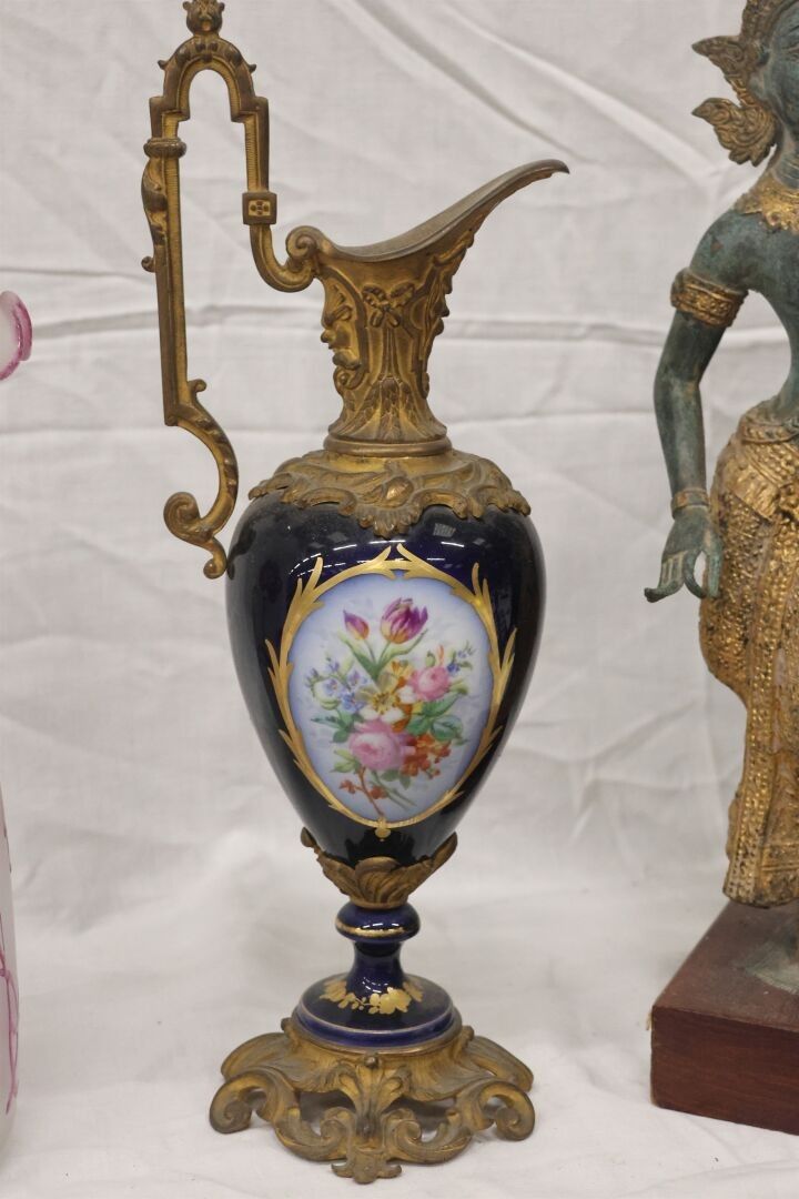 Lot including a glass vase decorated with pink flowers XX° - a porcelain ewer and bronze watch - Indian or Vietnamese statuette in lacquered metal - Paravet two leaves photo holder in lacquered wood - oval tray lacquered red and polychrome flowers - brass swan. Indian statuette 37 cm approx.