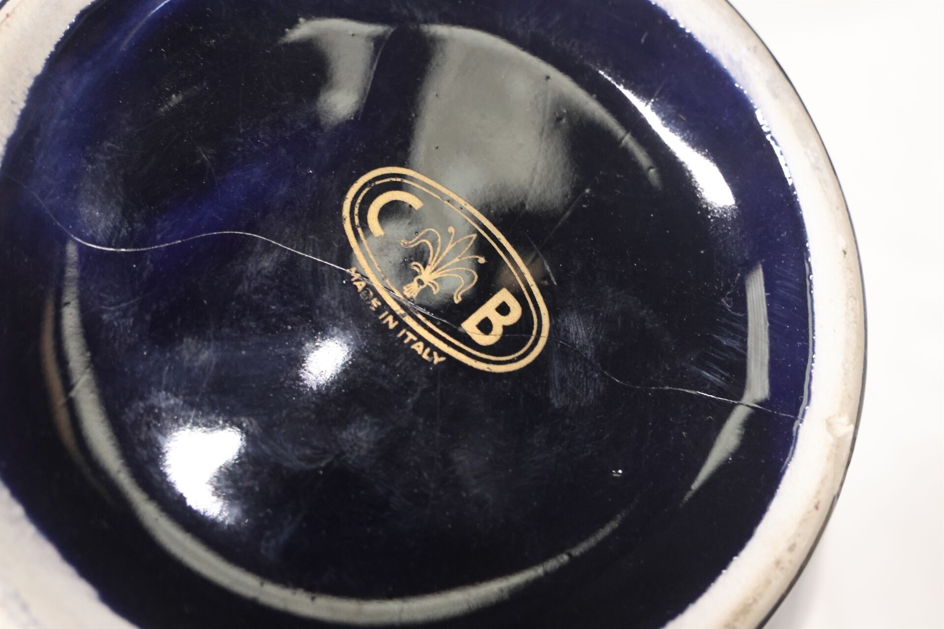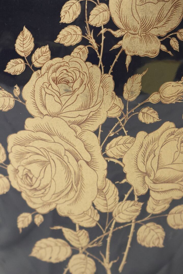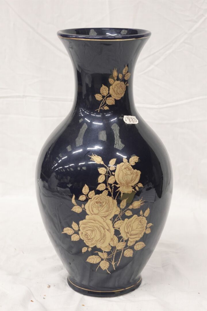 Porcelain vase with blue background and rose decoration in gold highlights. Damage 37 cm high