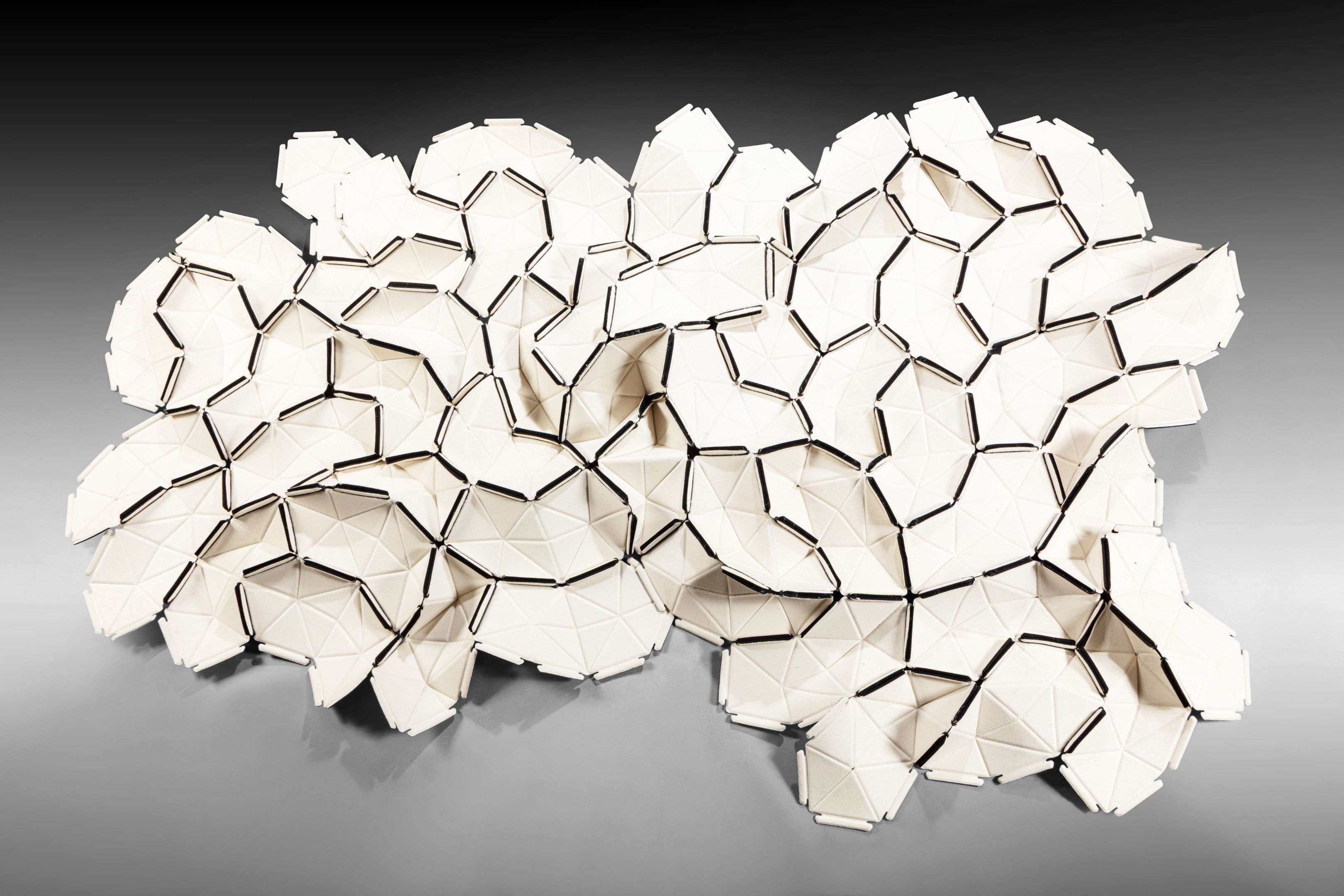 Clouds" wall or ceiling hanging ornament, model created circa 2009, in black and white fabric tiles, articulated and adjustable, interwoven by an elastic ribbon system.