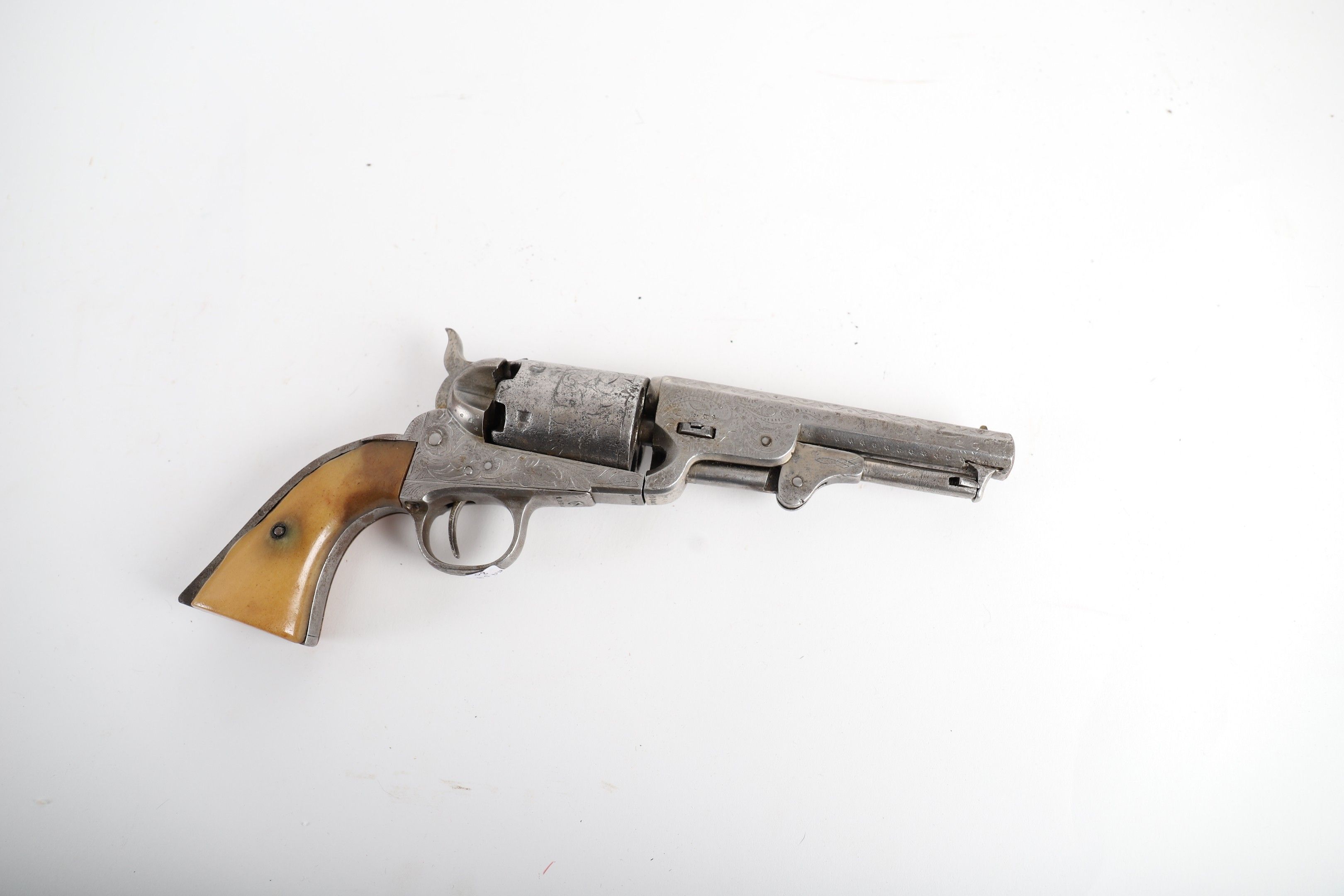 Open steel frame engraved with scrolls. Engraved six-chamber cylinder.