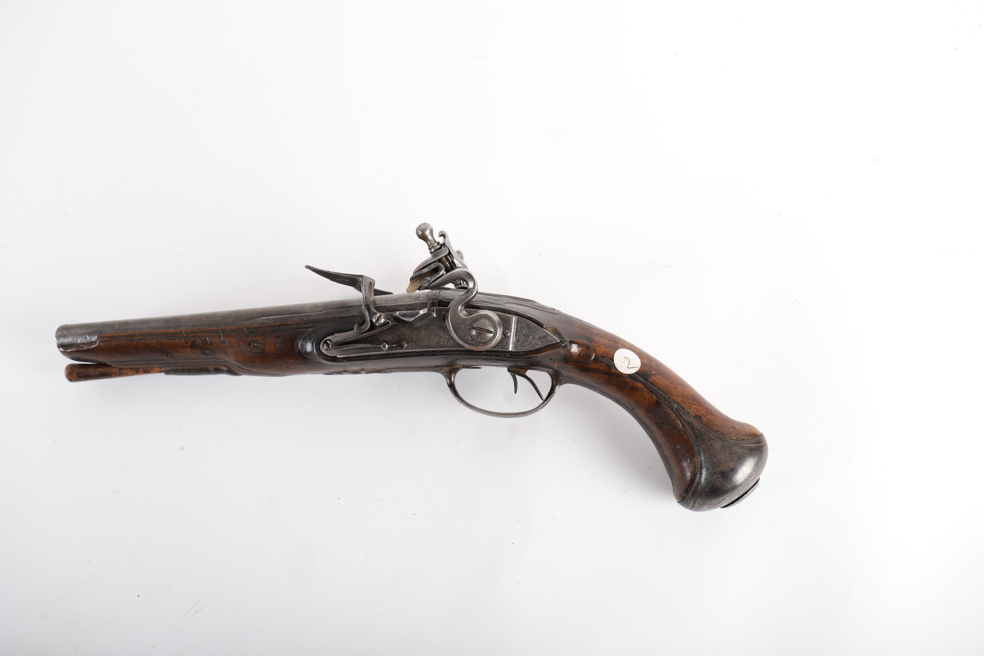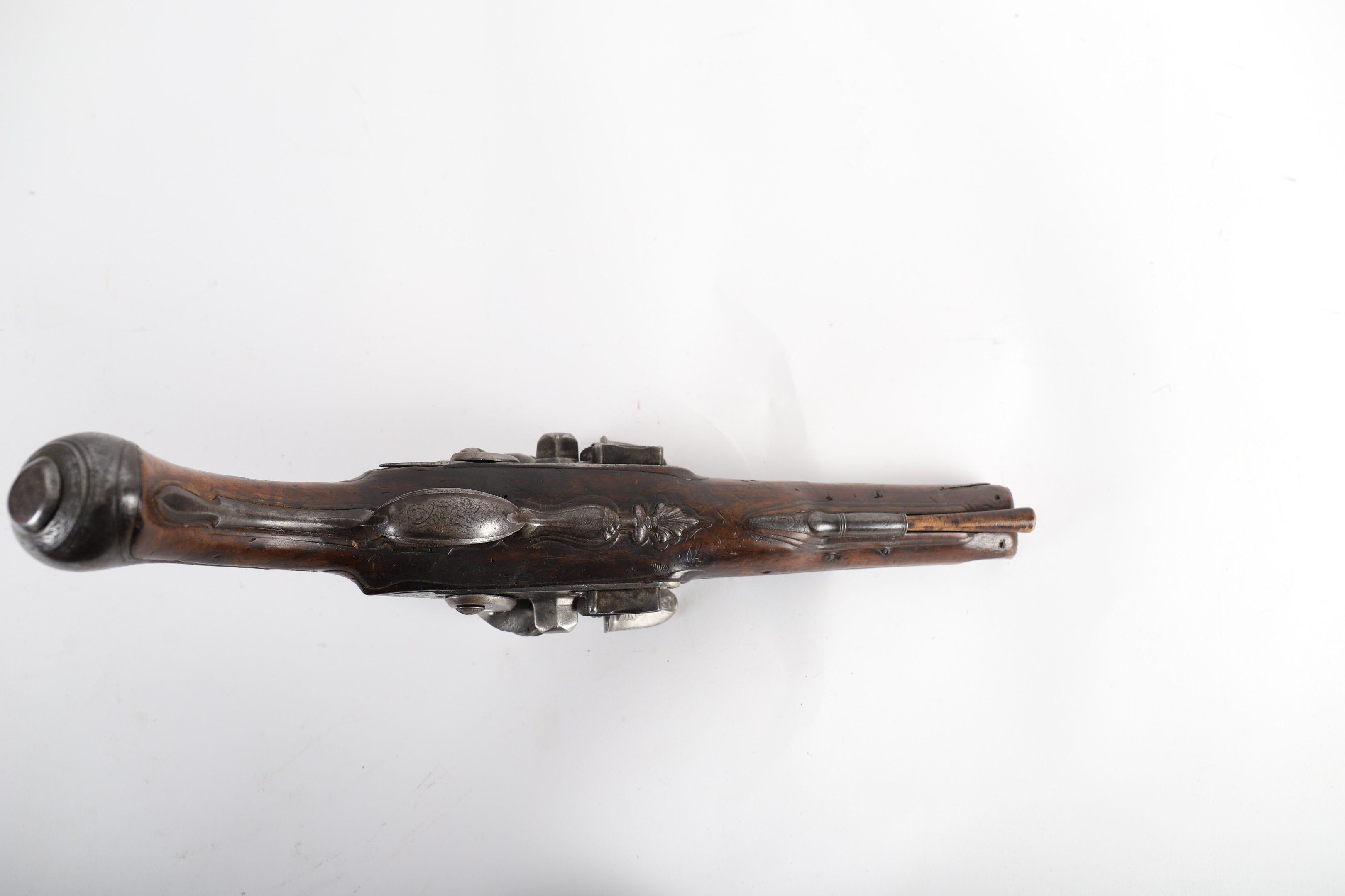 Round barrels, lock signed "LUTANDU A MONLUCON" (active circa 1760-1770); flat-bodied hammer engraved with rocailles. Chased iron fittings decorated en suite. Walnut stock (small chips). Wooden ramrod.
