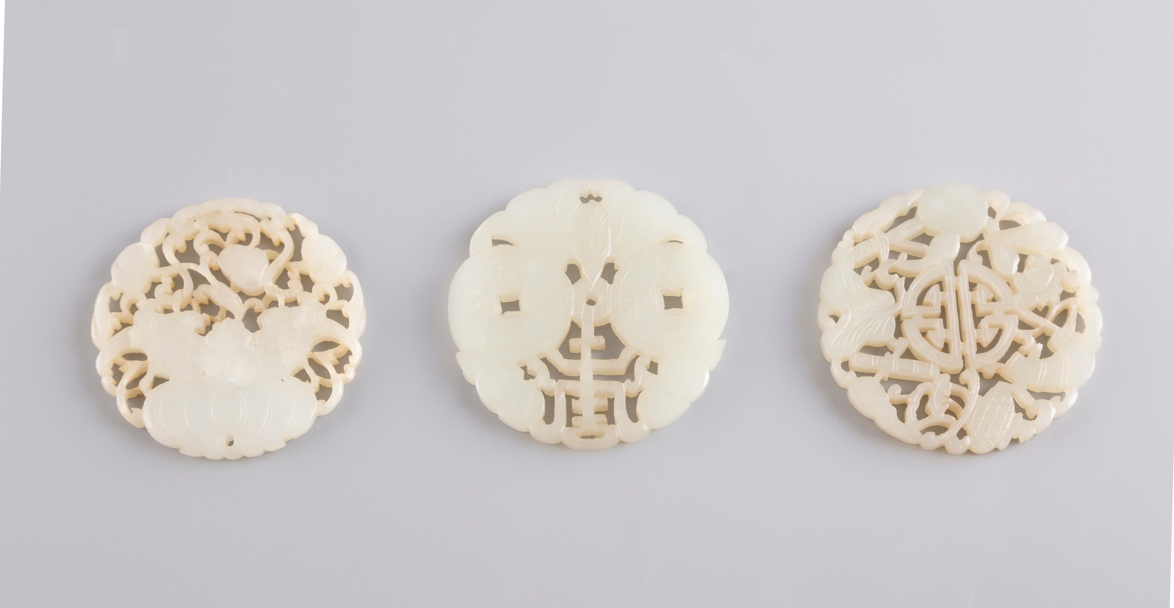 CHINA - Circa 1900. Three round celadon jade (nephrite) medallions with openwork decoration, one of a bat and a melon, the second of a bat and two sapèques, the third decorated with the eight attributes of the immortals. Diameters: 5.3 and 5.5 and 5.5 cm. Expert : Cabinet Portier, Paris.