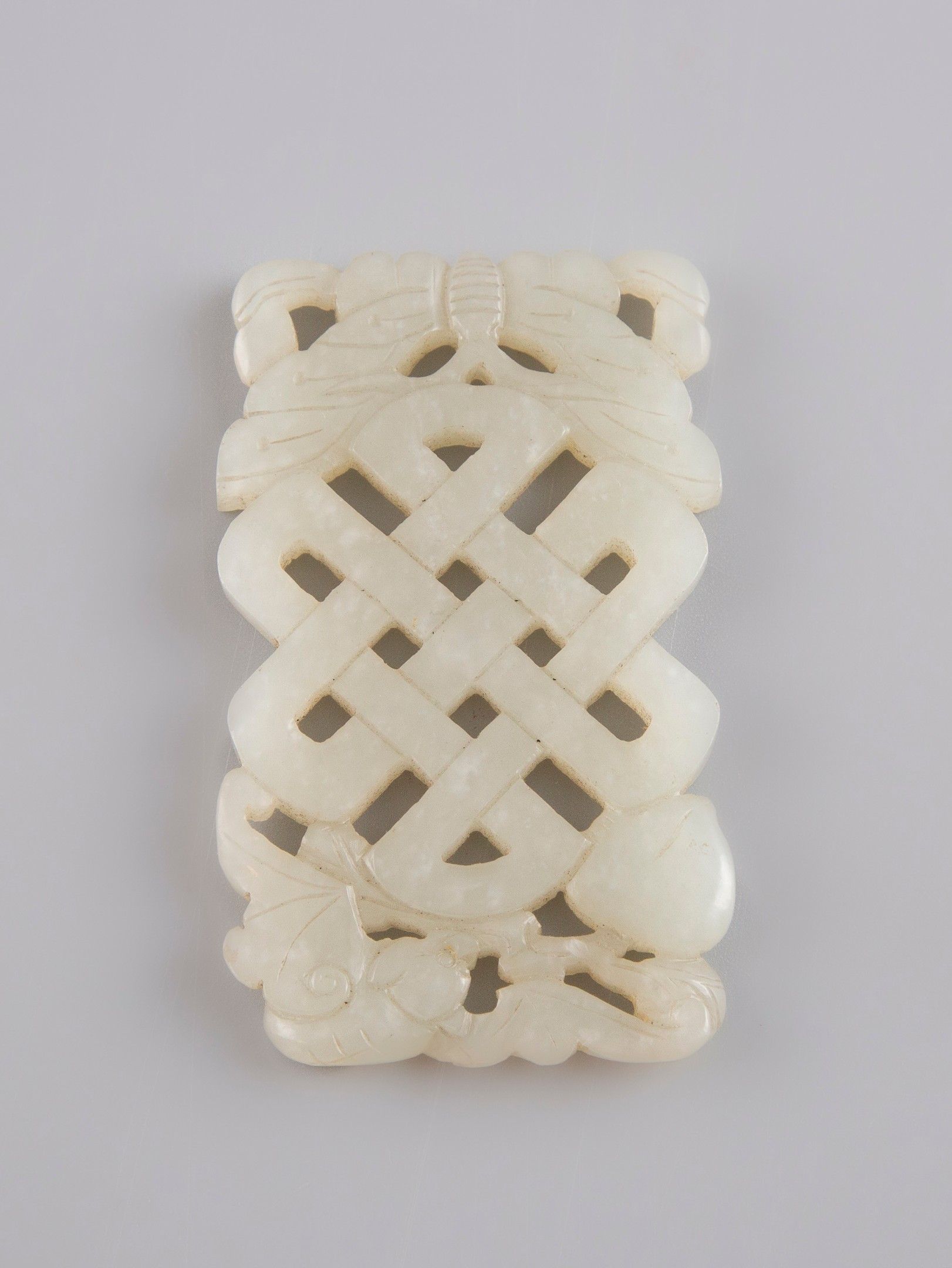 CHINA - Circa 1900. A celadon jade (nephrite) pendant with an openwork design of an endless knot surmounted by butterflies. Height 7.5 cm. Expert : Cabinet Portier, Paris.