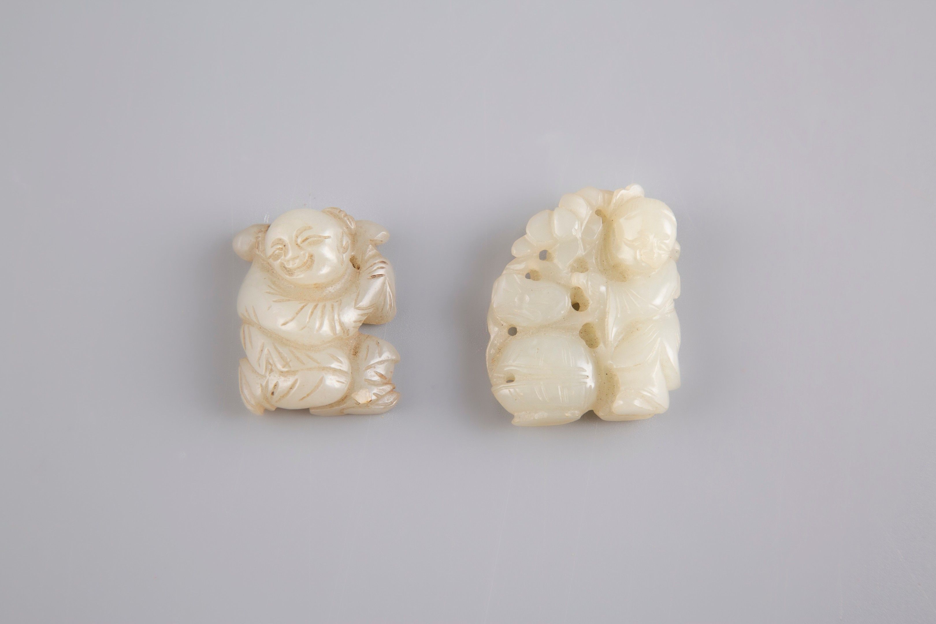 CHINA - 19th century. Two celadon jade (nephrite) statuettes of children, one standing holding a lingzhi branch, the other opening a box of riches. H. 3.2 and 4 cm. Expert : Cabinet Portier, Paris.