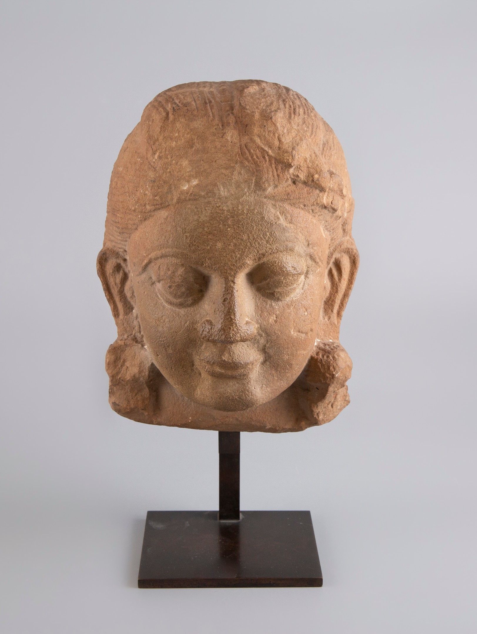 INDIA - GUPTA period, 3rd/6th century. Sandstone head of a woman with large open eyes, slightly smiling mouth, wearing heavy ear pendants. (slightly abraded, missing). Height : 23 cm. Expert : Cabinet Portier, Paris.