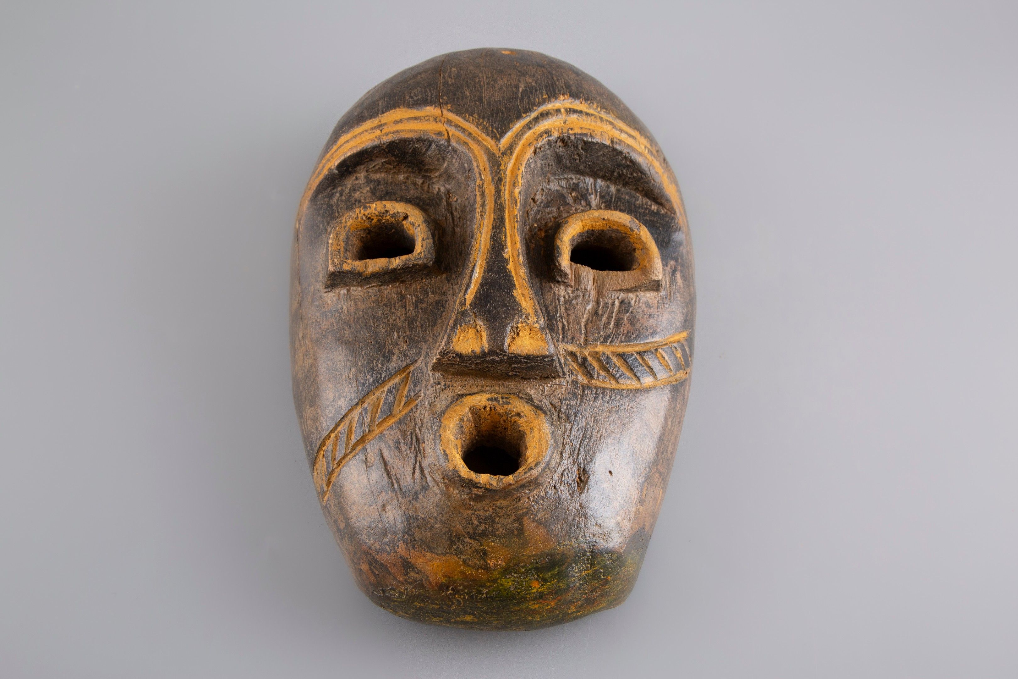 TIBET. Ceremonial mask in polychromed wood. Height 26cm. Restoration.