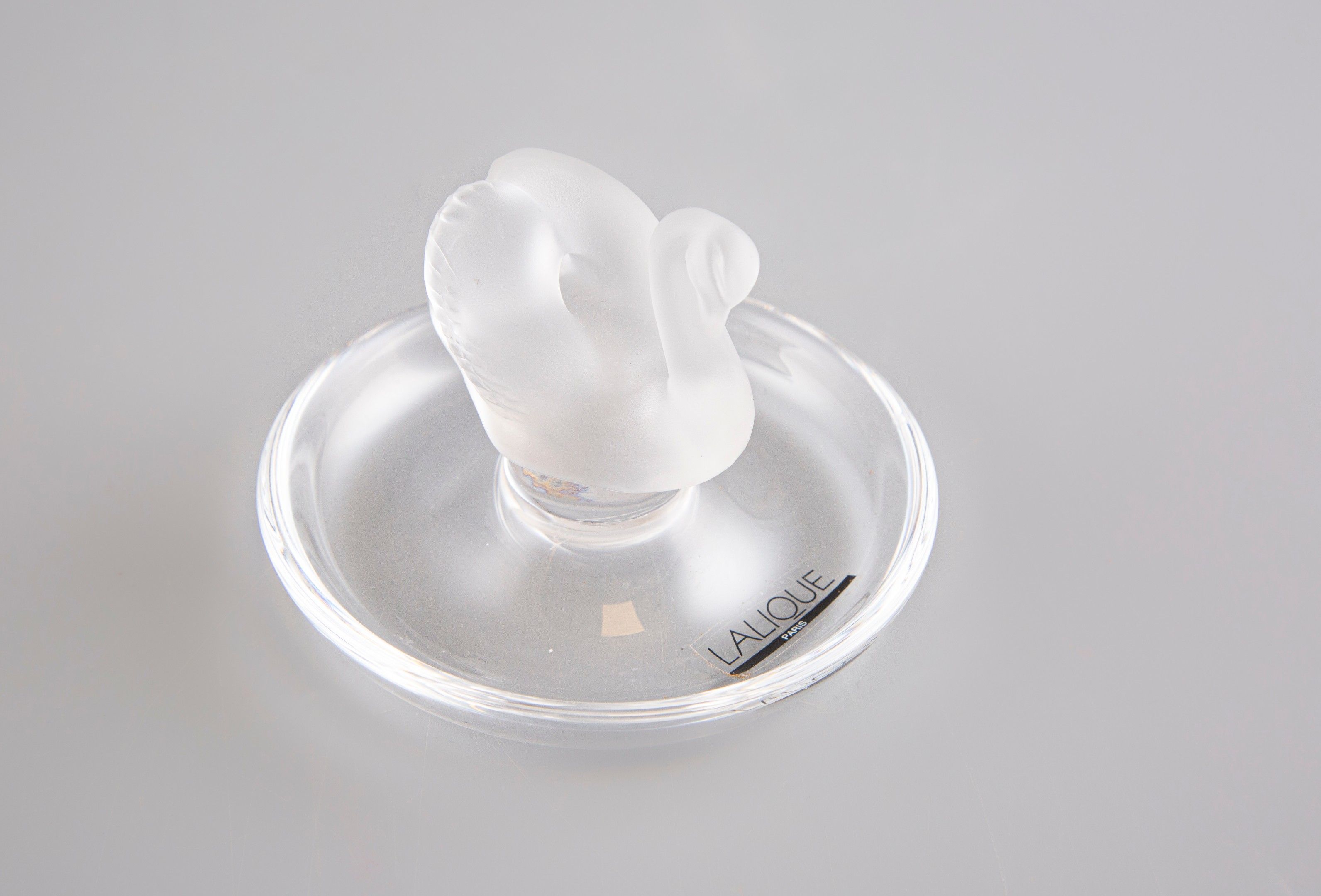 LALIQUE, France. Baguier in partially frosted pressed-moulded crystal surmounted by a swan, stylus signature under the base. Sold with its box. 10x8cm.