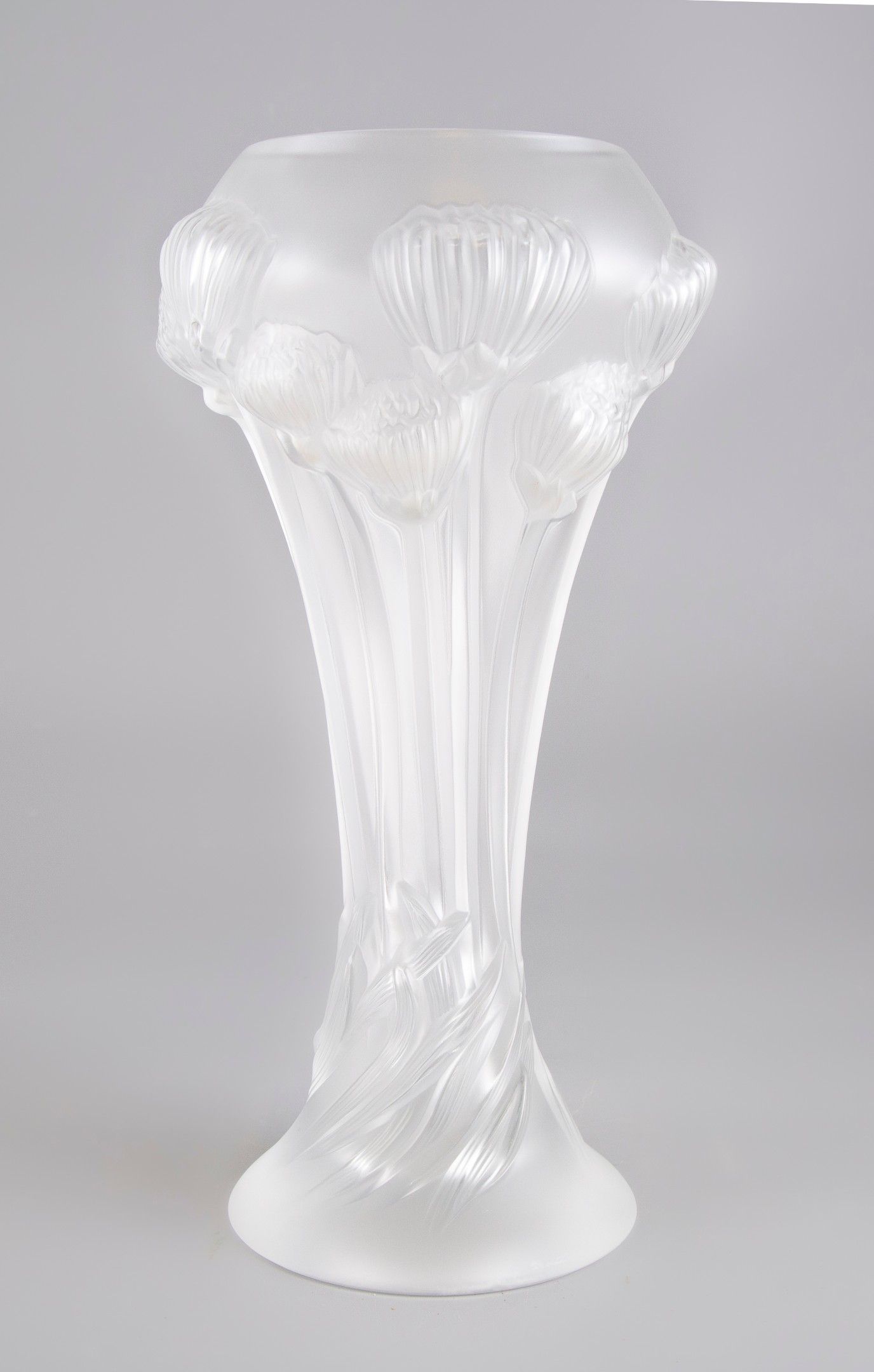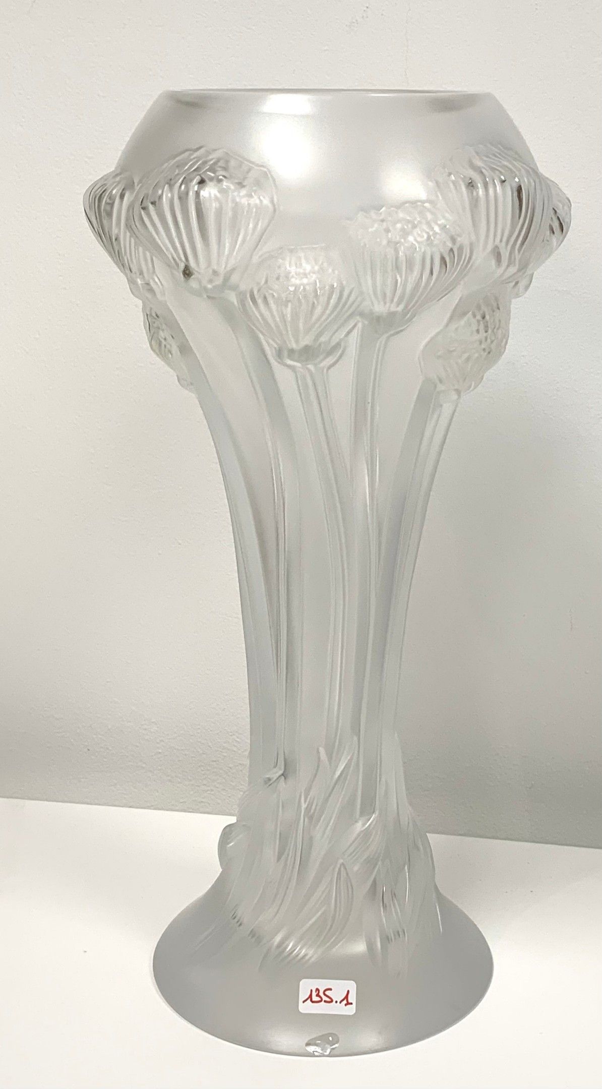 LALIQUE France. White and satin-finish pressed moulded glass vase "Pompons" model. H. 36 cm. Small chip at the base.