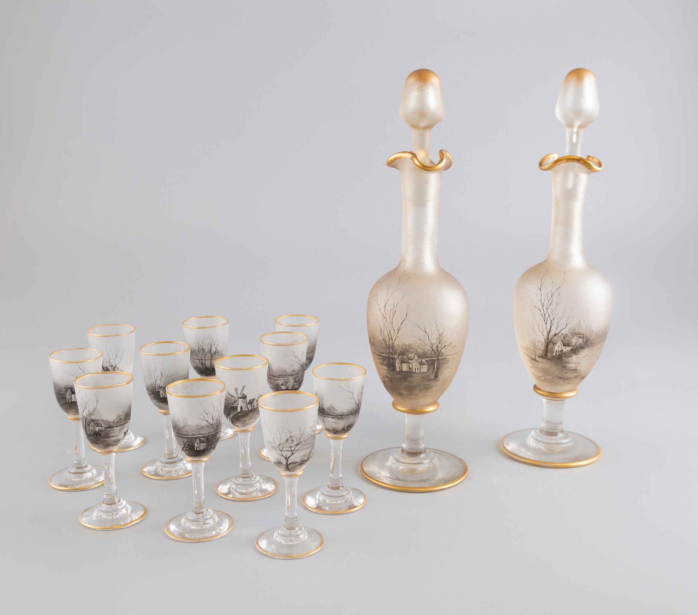 Enamelled glass liqueur set comprising: two decanters and a suite of eleven glasses decorated with Nordic landscapes.