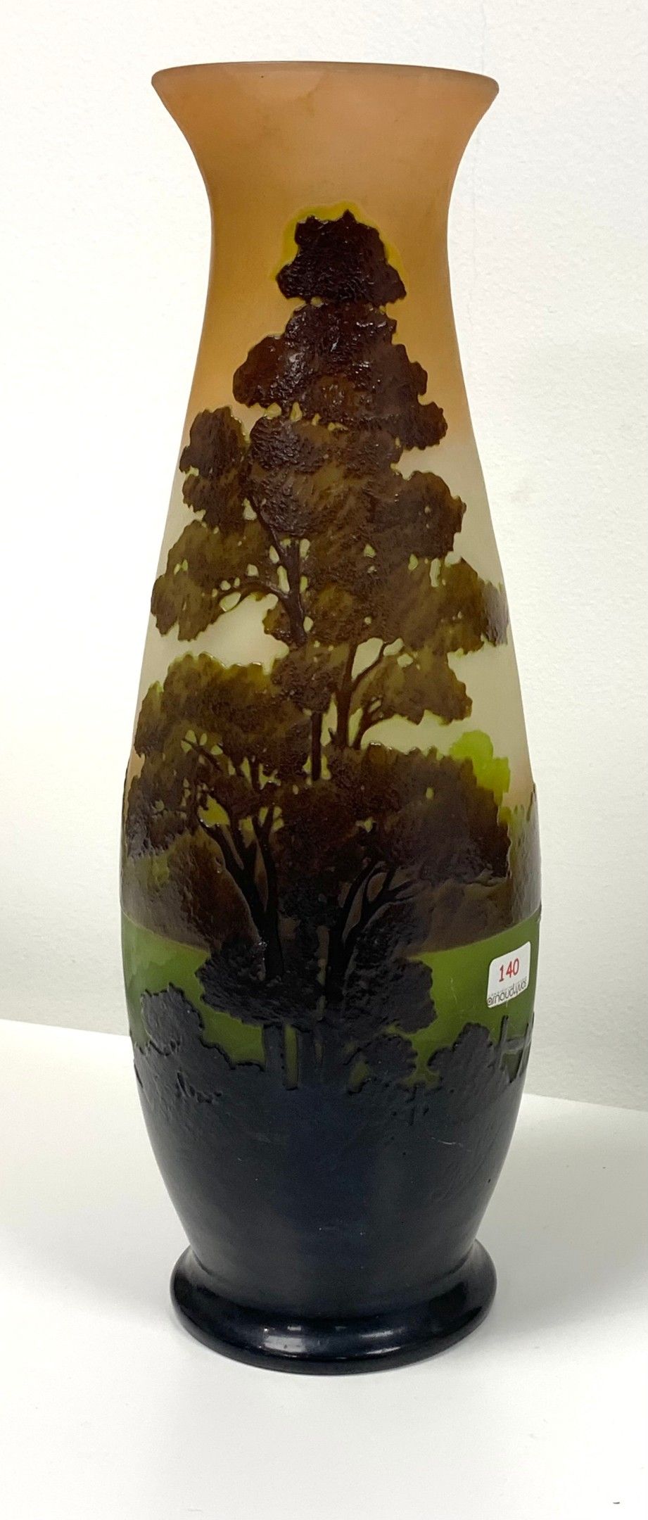 GALLE. A slightly curved cylindrical vase on a pedestal in acid-etched glass decorated with a lake landscape in shades of dark green on a grey-orange ground. Signed in intaglio. Height 32cm. Expert : Thierry Roche, Paris.