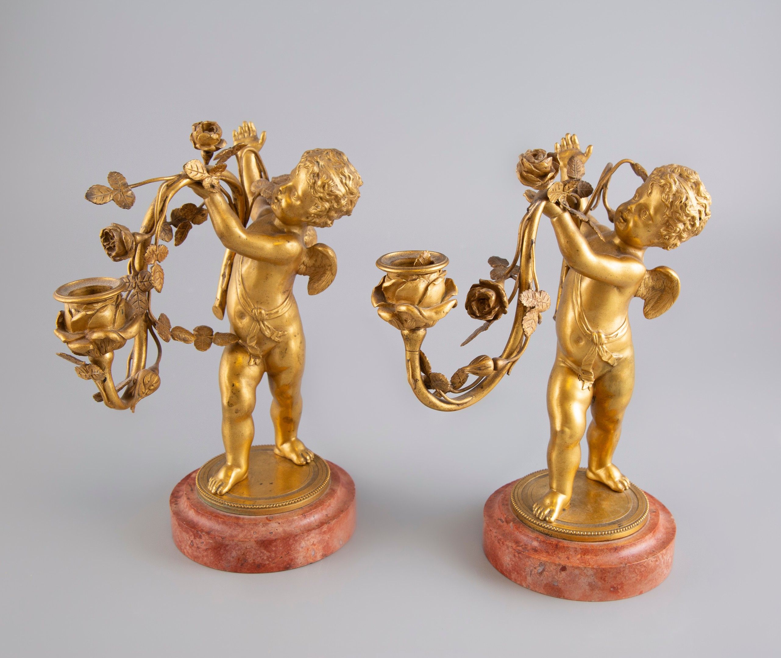 France, 19th century. A pair of ormolu candlesticks decorated with lovers holding a garland of roses, on a cylindrical pink marble base. Height 25cm (one leaf needs refixing)