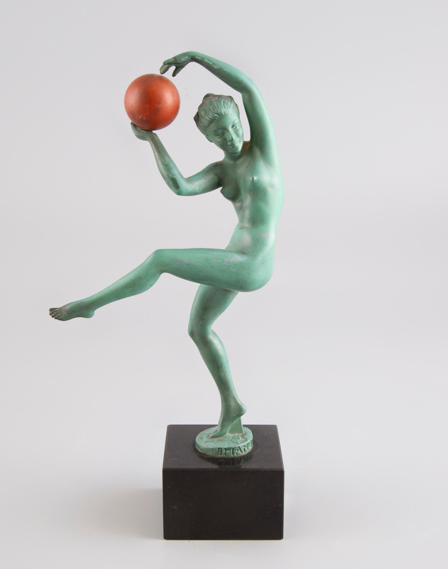 Marcel André BOURAINE (1886-1948) known as BRIAND. "The dancer with the ball. Metal sculpture with a green and red patina on a square black marble base. 22x12cm. Worn patina.