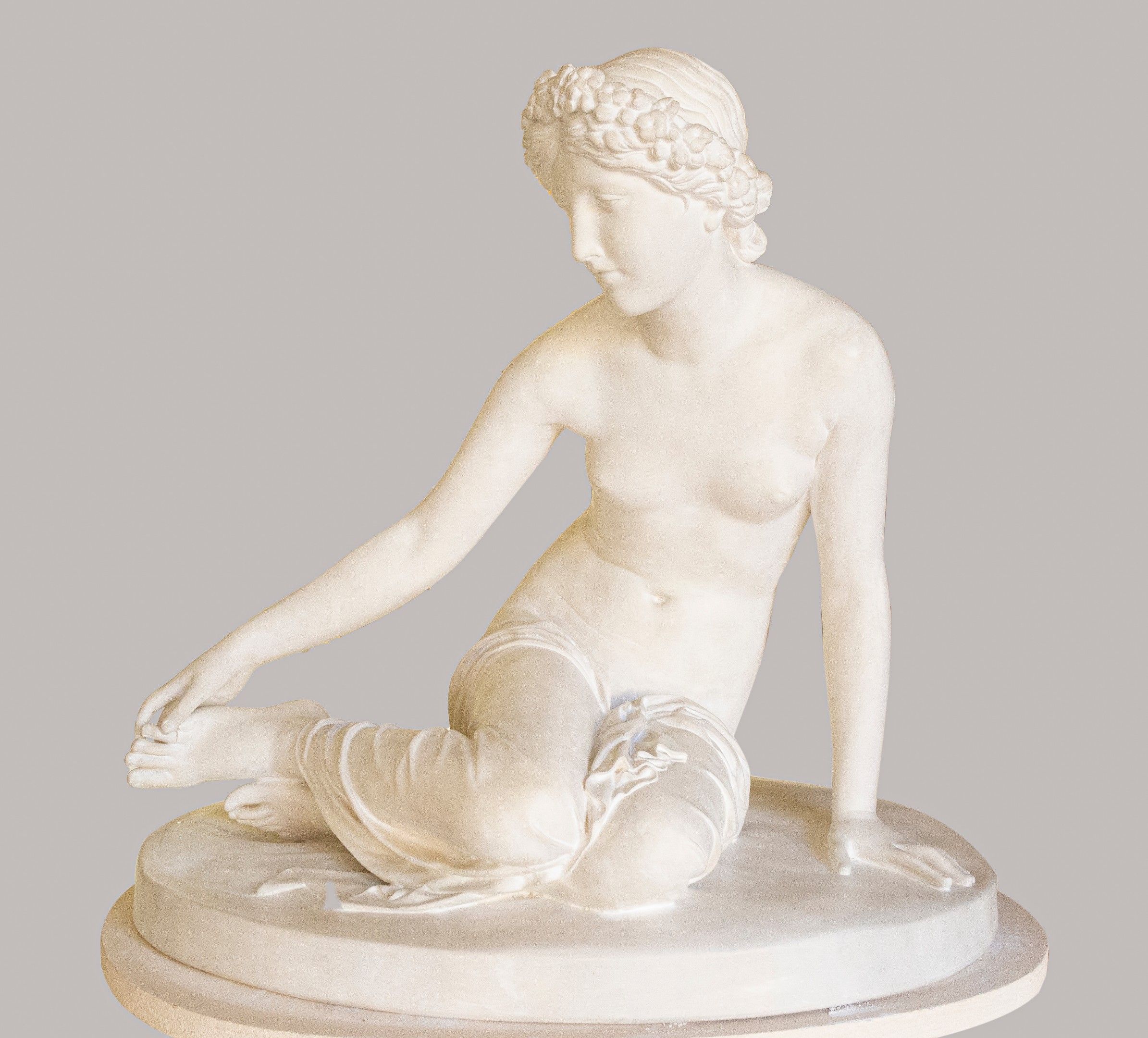 François-Joseph BOSIO (1768 - 1845) after. "The Nymph Salmacis emerging from the bath. Reproduction in plaster. Stamped "Moulage réalisé par musée nationaux du Louvre". 84x90x60cm. Sold with its painted wooden base. Reglued by hand and crack on the foot. Our work is based on the work commissioned by the Ministry of the King's Household in August 1826. Exhibited at the Salon of 1837.