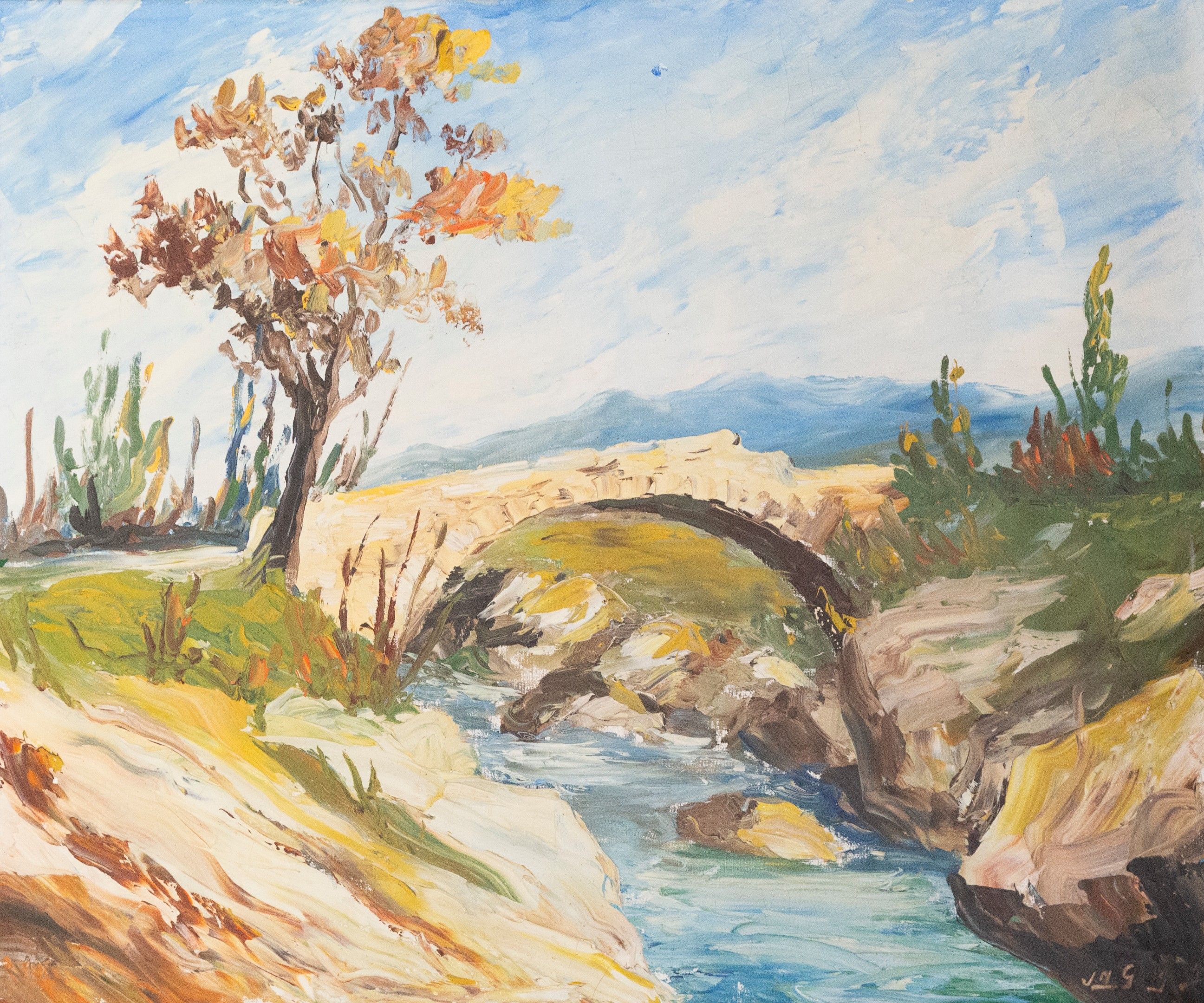 French school of the XXth century. "The Roman Bridge of the Plan de la Tour". Oil on canvas bearing an indecipherable signature lower right.54x65cm.