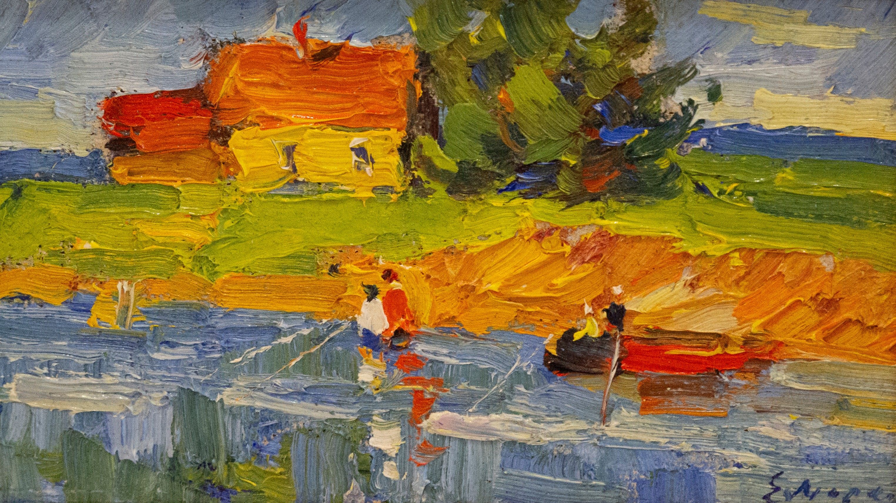 Eugen MARKOV (1939) "Fishermen by the river". Oil on panel signed lower right. 13,5x22cm.