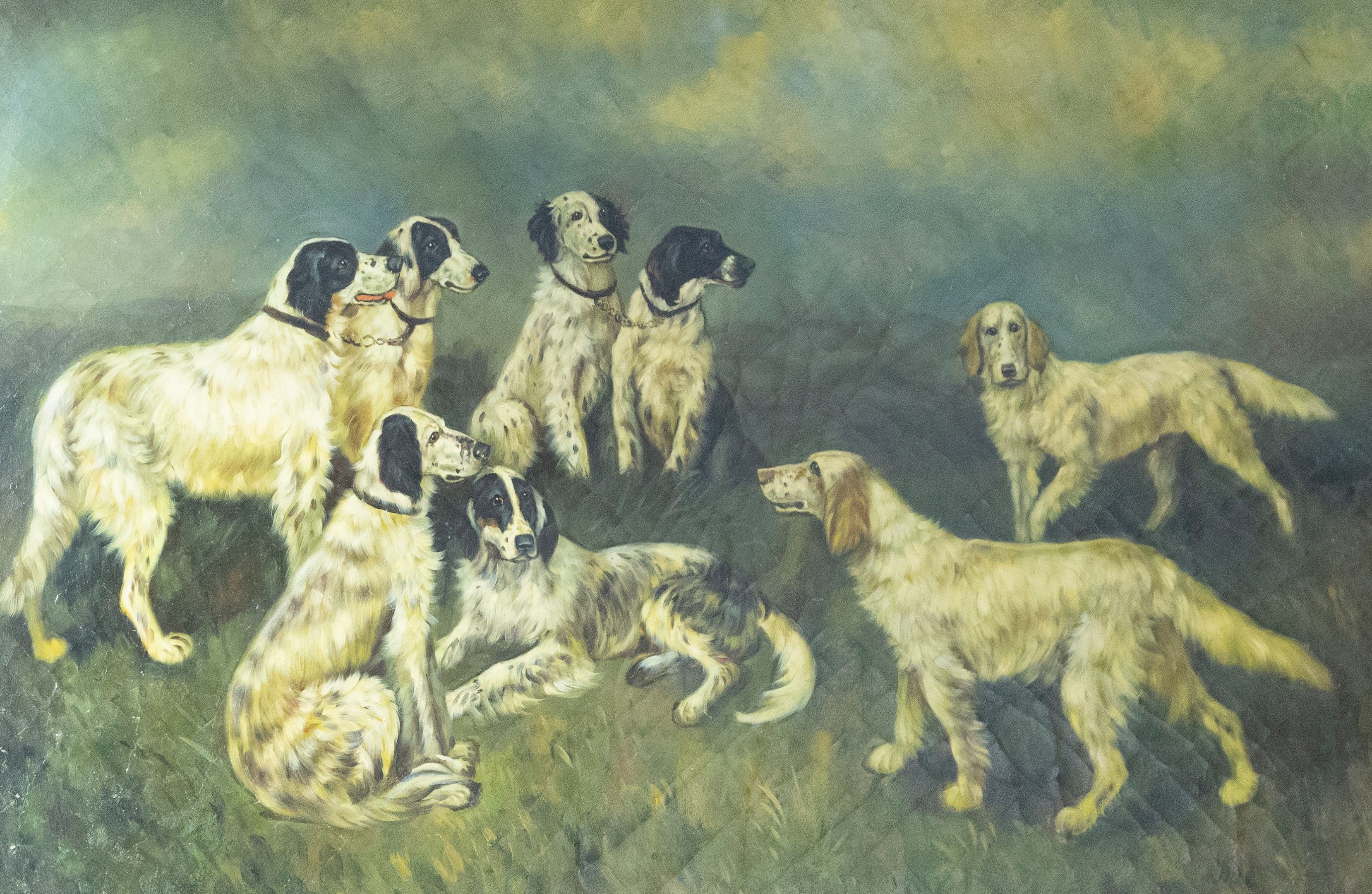 French school of the XIX°. "Assembly of setters". Oil on wood panels. 60x91,5cm. Modern giltwood frame.