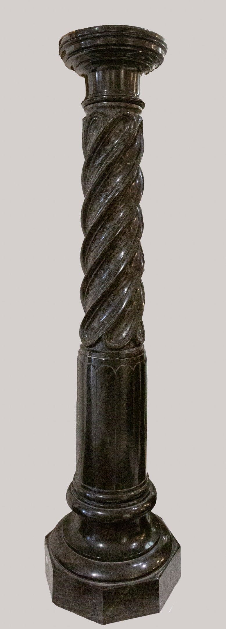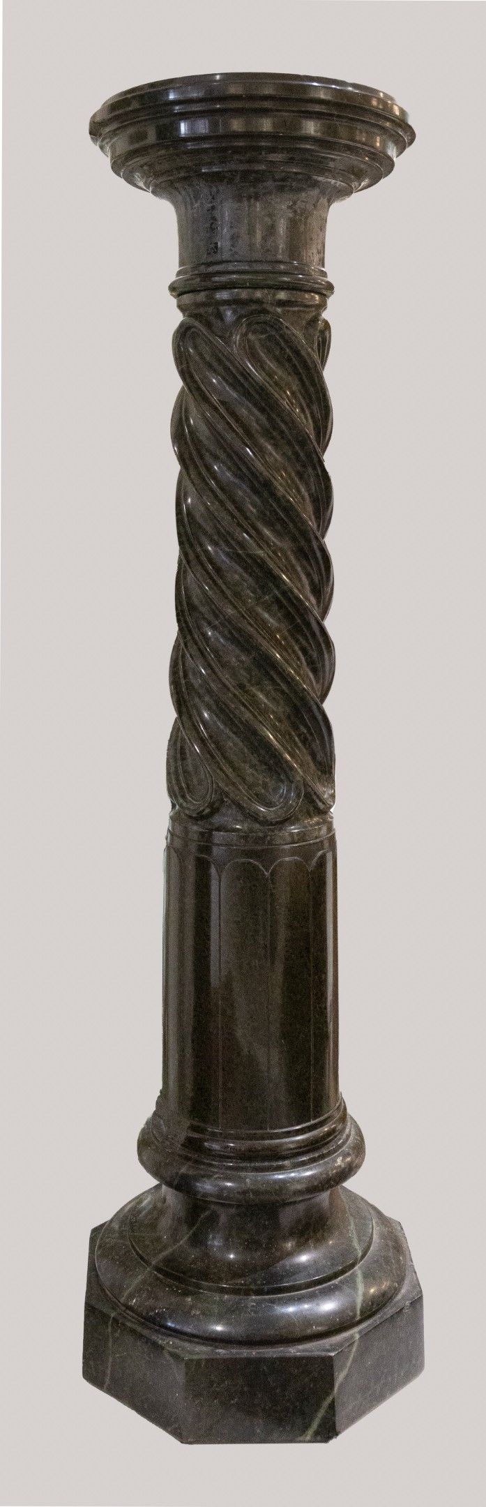 Reunion of two twisted columns in green marble. They stand on octagonal stepped bases.107x28cm and 120x26cm.