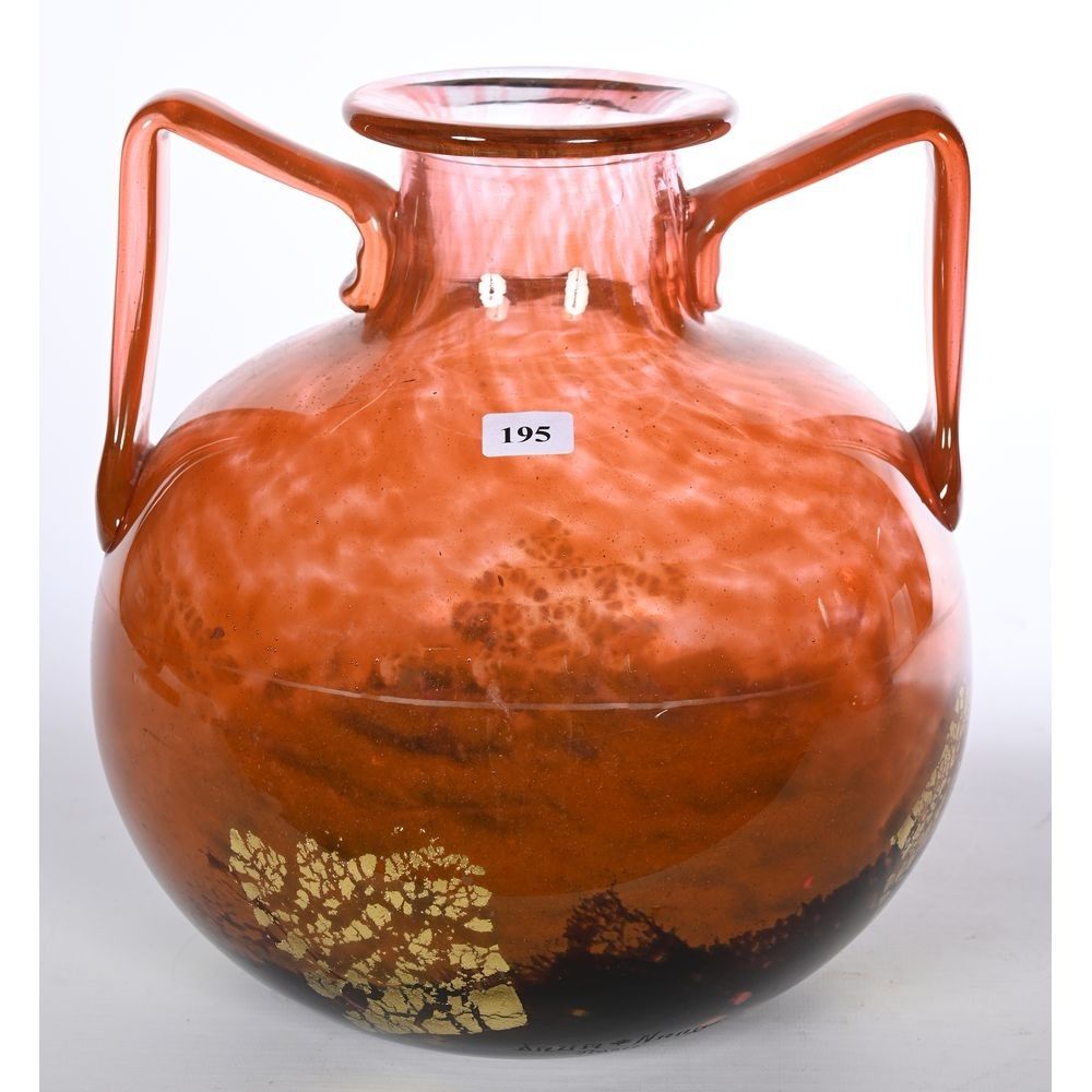 DAUM in NANCY. VASE of pansu form with handles with inclusions of gold spangles with 2 handles. Signed. H.25 L.22.