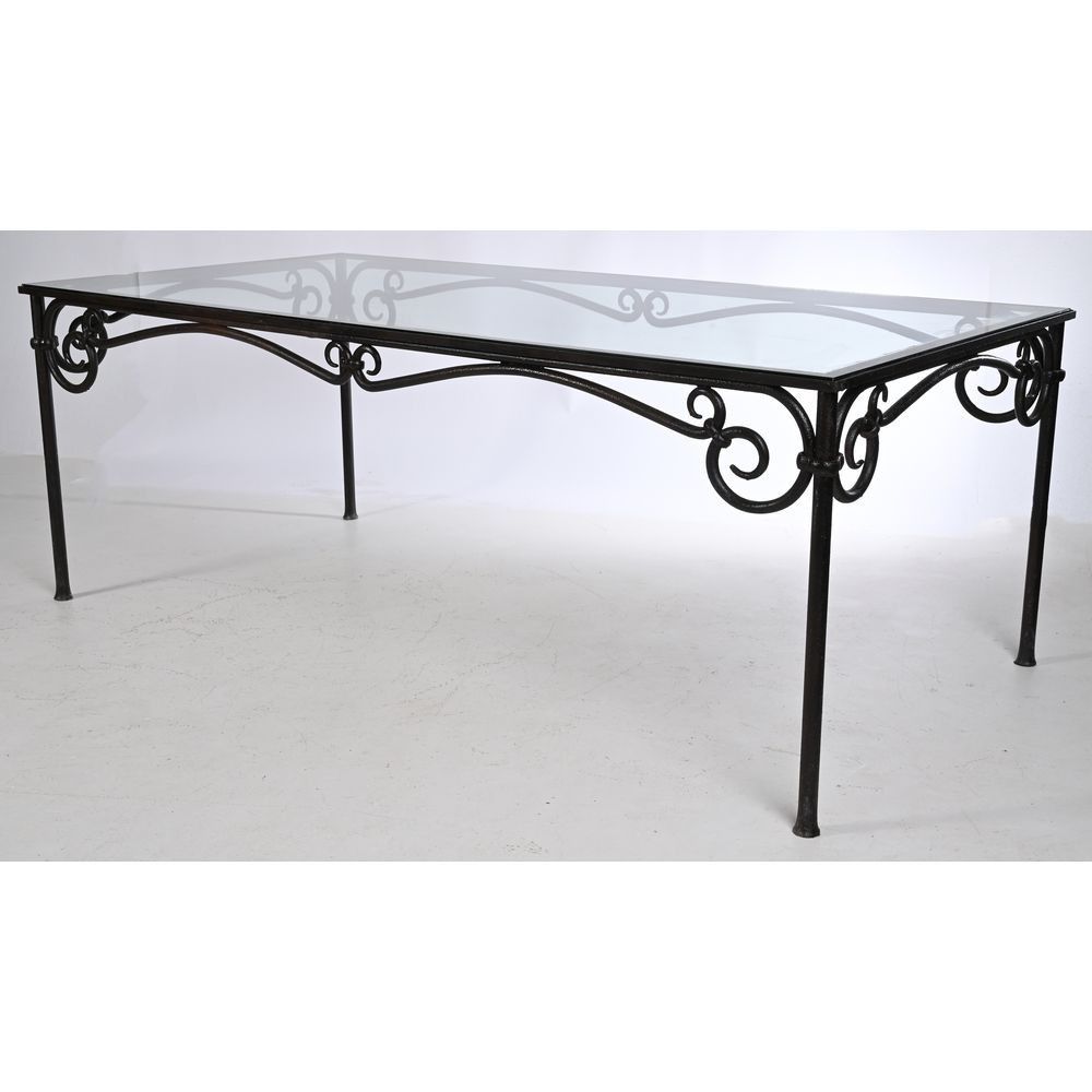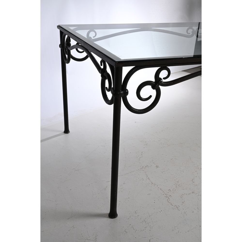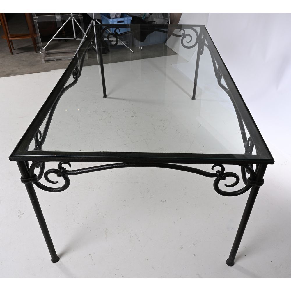 Dining room table in wrought iron with movement decoration on the belts. Tubular legs. Glass top. Circa 1940-50. H.74 W.200 D.102. 1,300/1,500