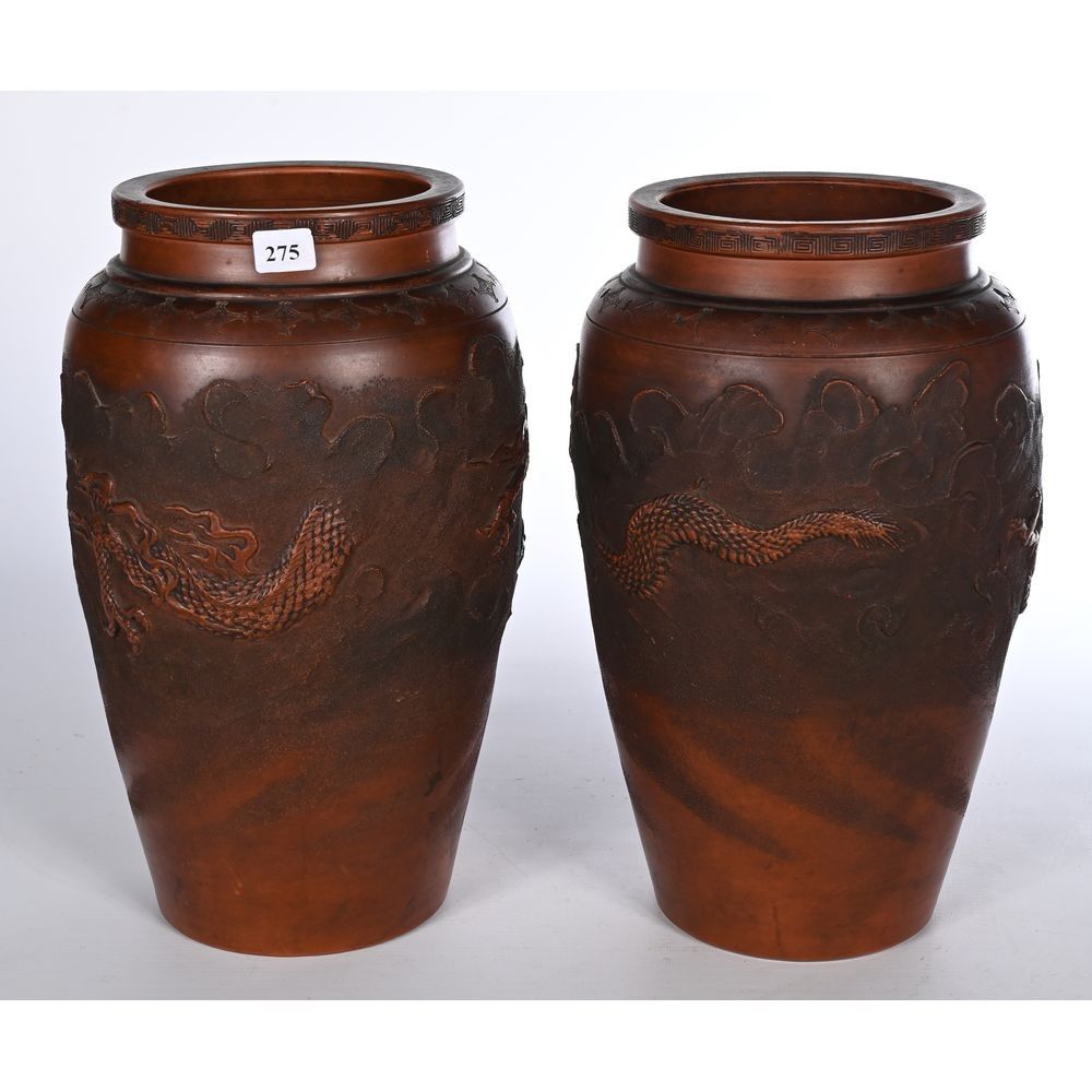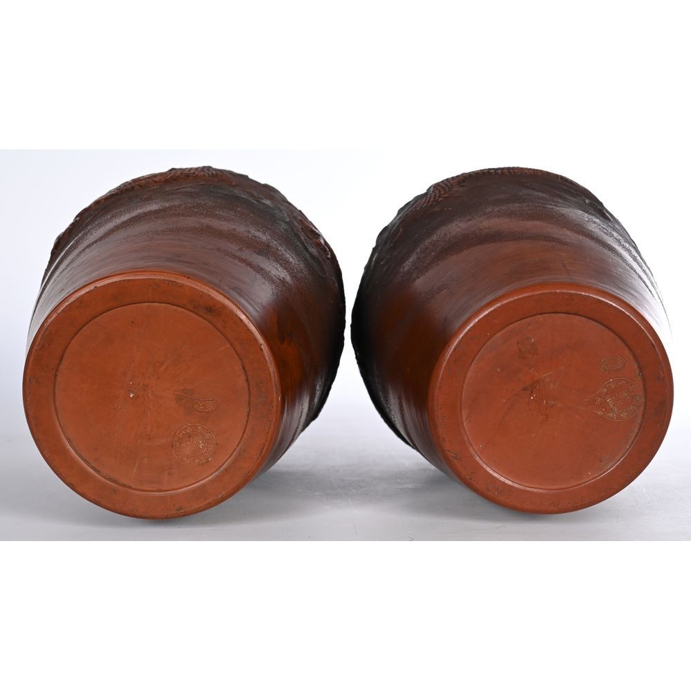 PAIR OF VASES in patinated terracotta decorated in relief with fantastic animals. Stamped under the base. H.30.