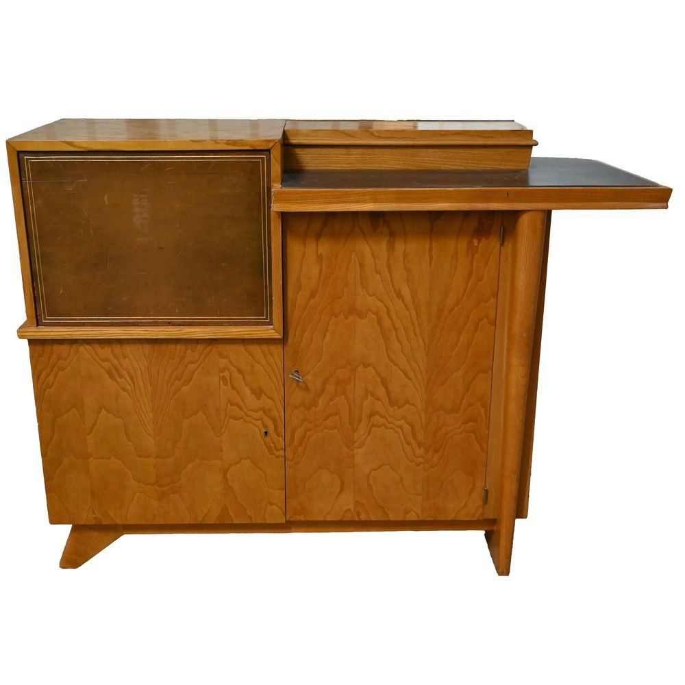 PRE Maurice (Attributed to). Bar cabinet in light wood veneer. It opens with 2 flaps, 1 of which is sliding. Circa 1970. H.110 W.145 D.52.