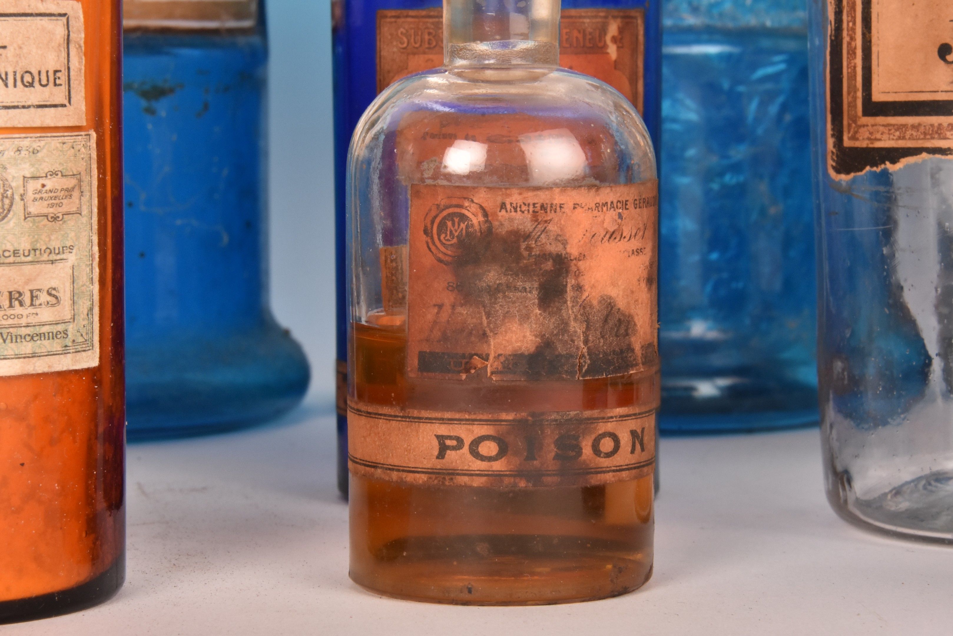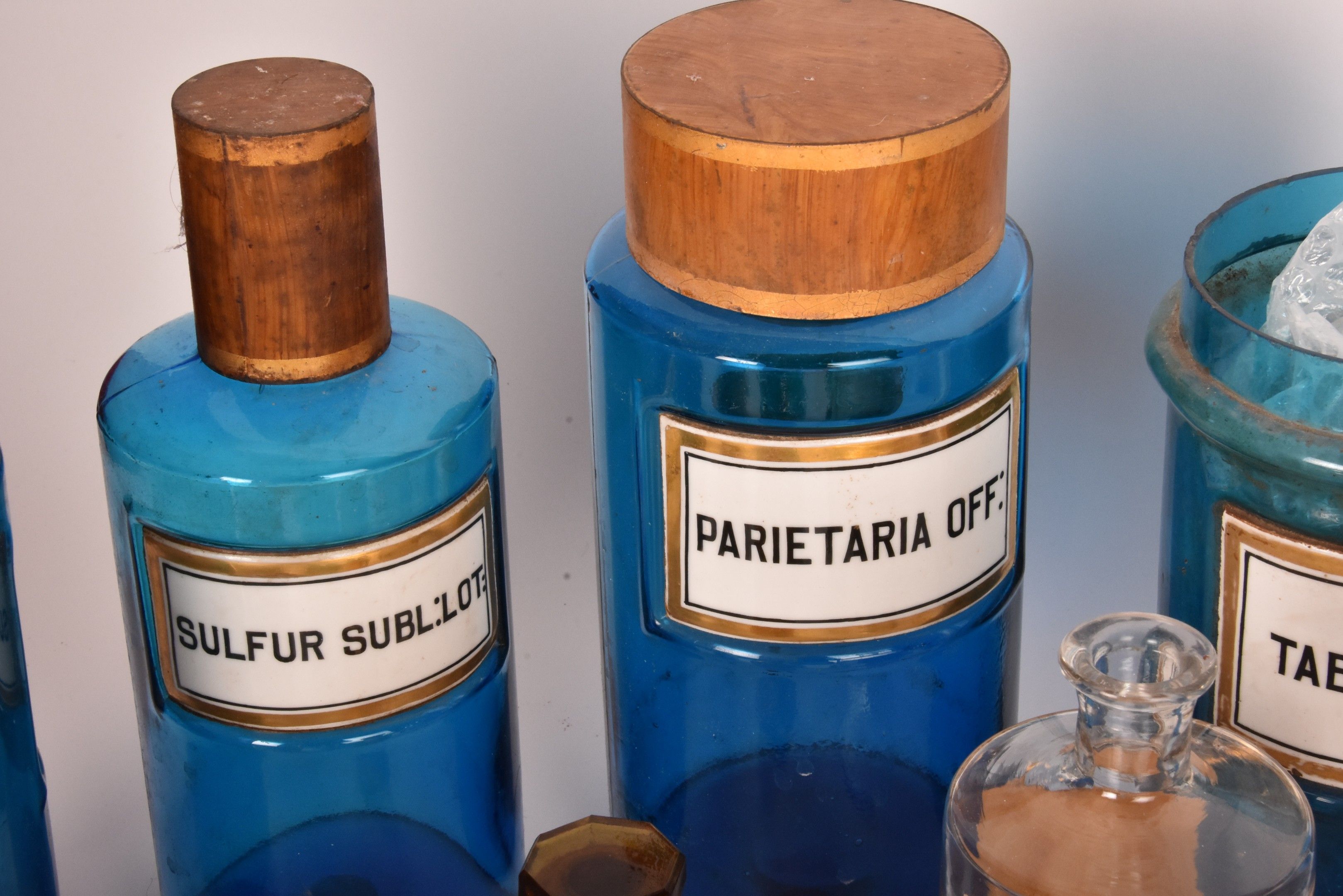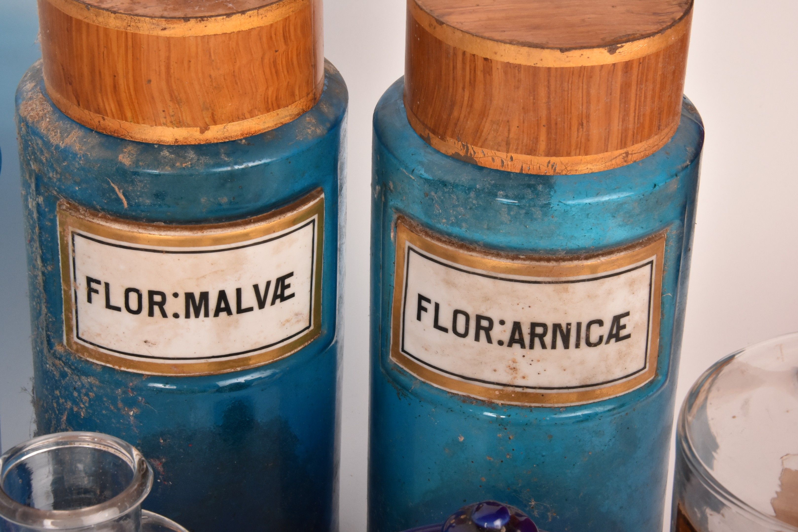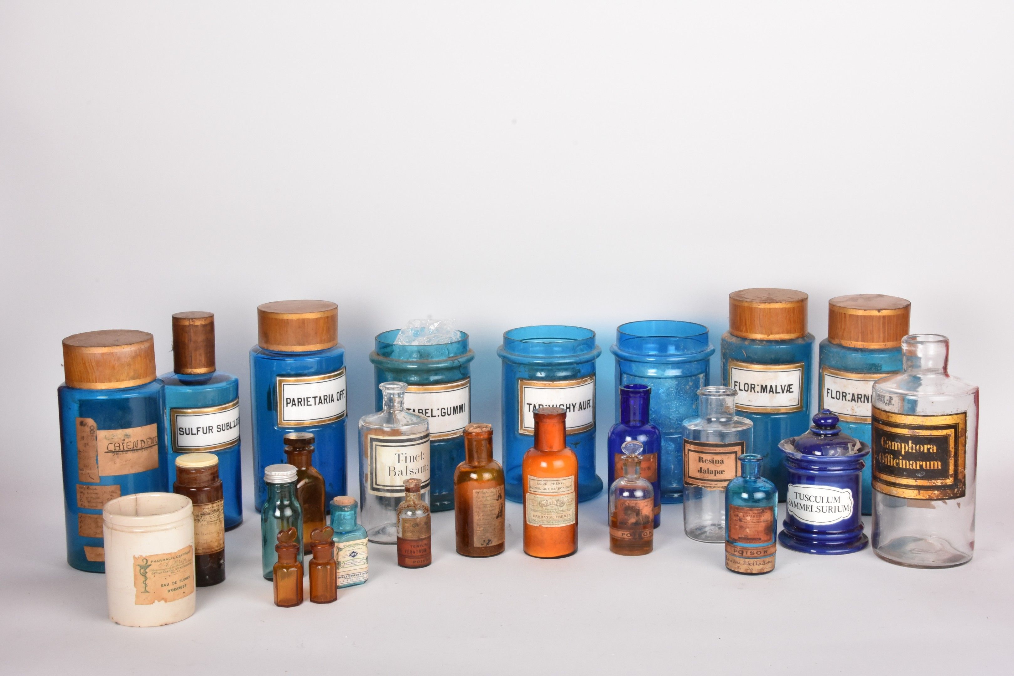 Set of seven glass jars and a white porcelain plate medicine bottle.