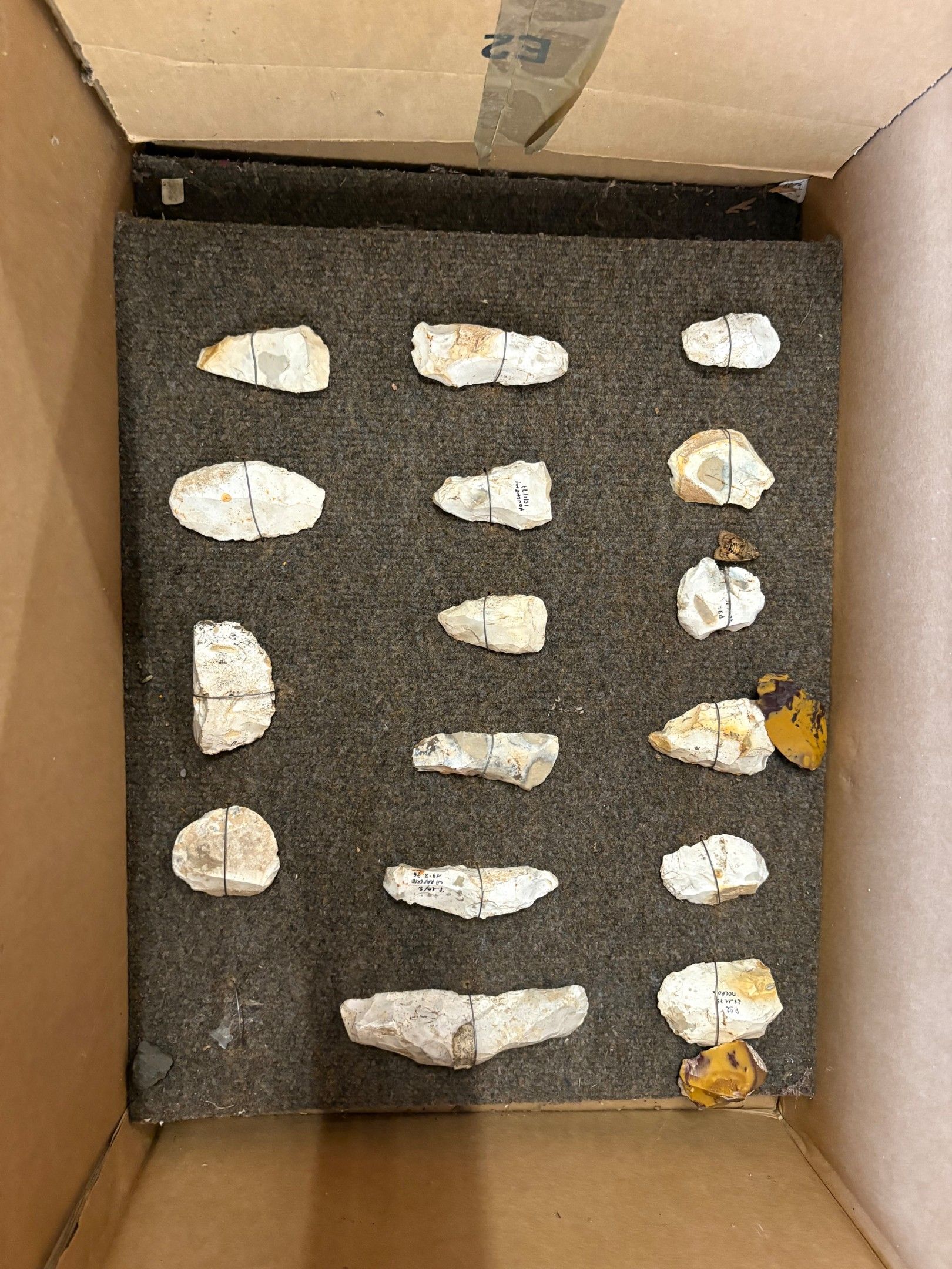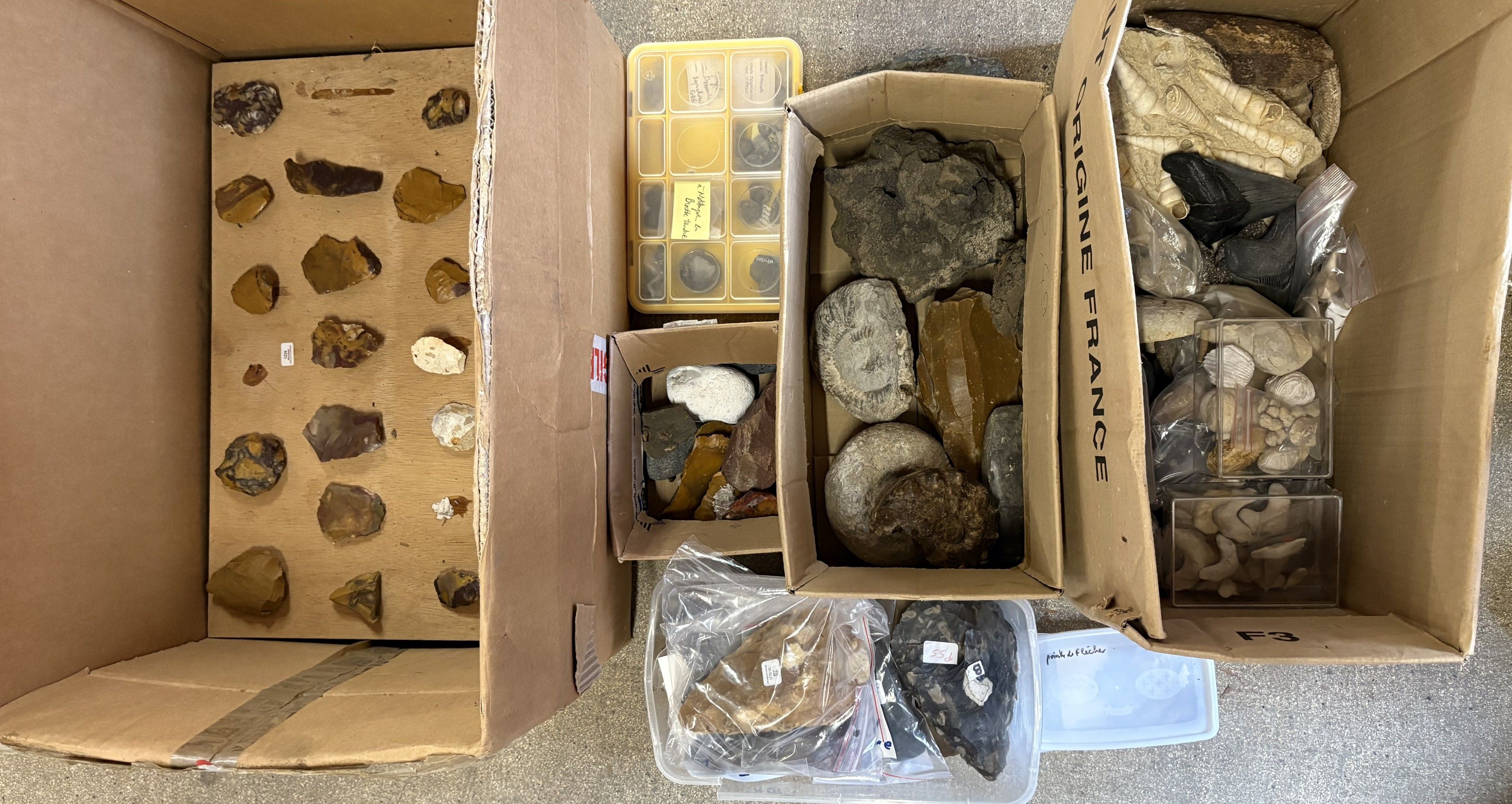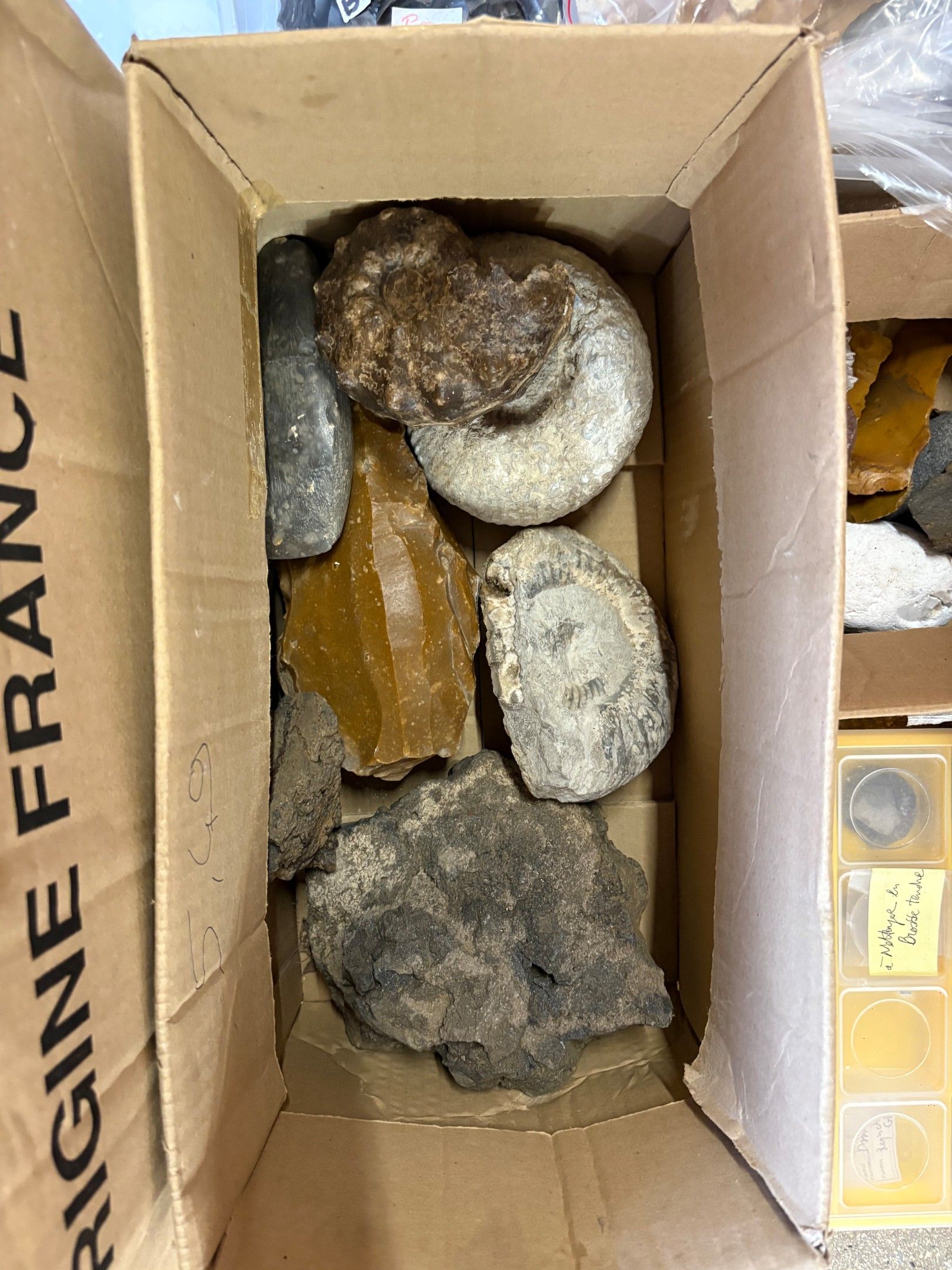 Three boards with cut flints, ammonites and nuclei or "livre…