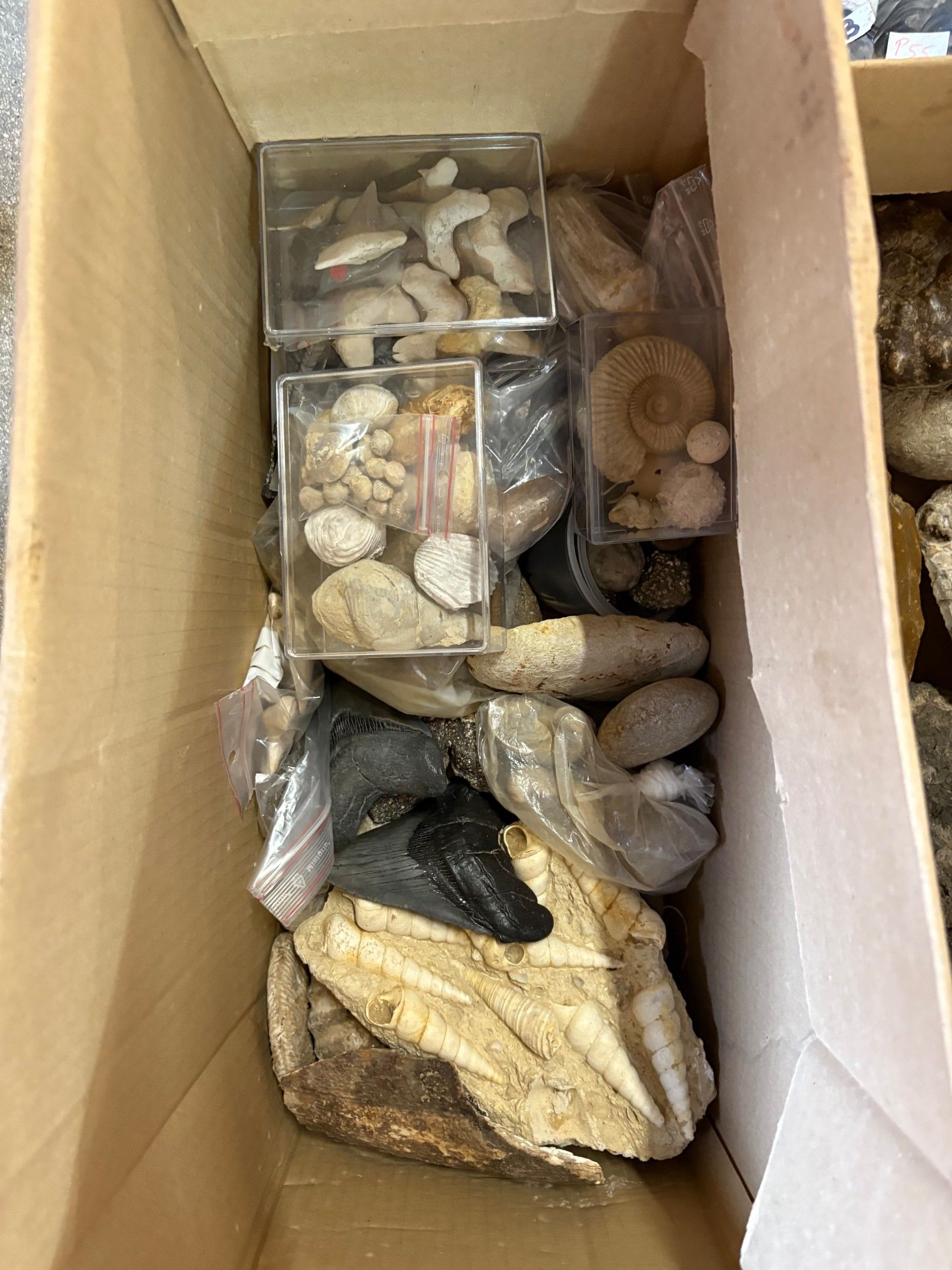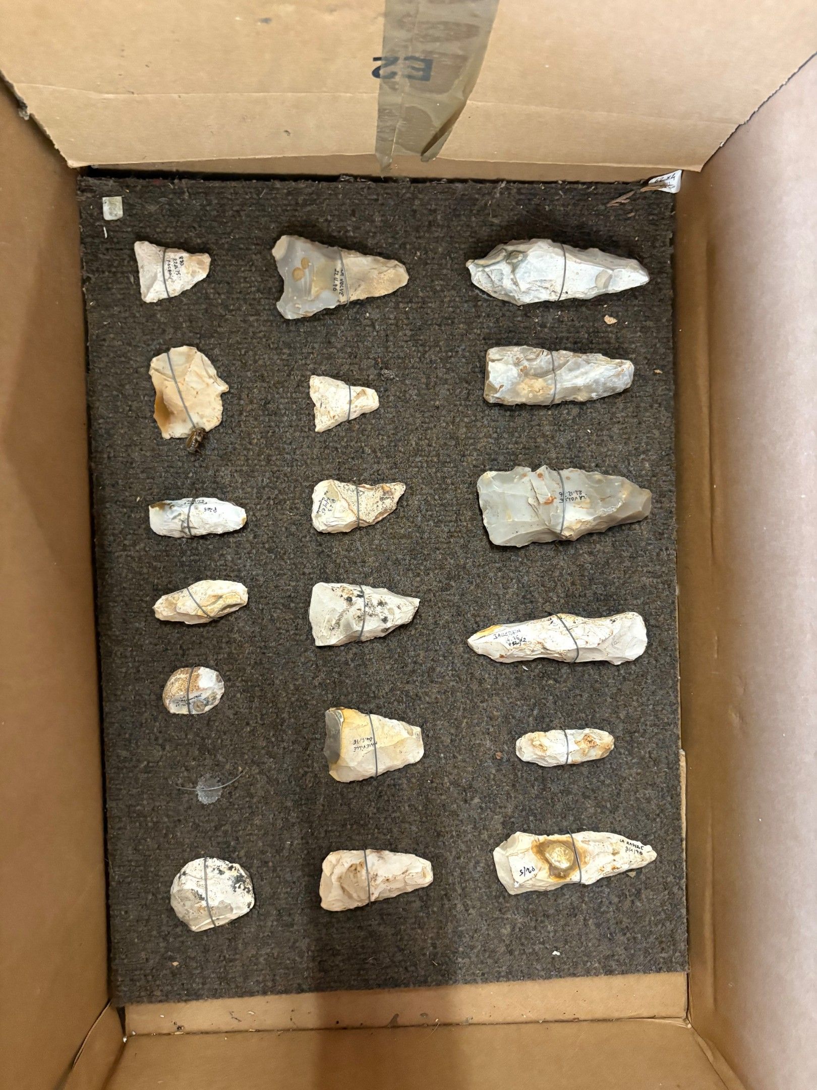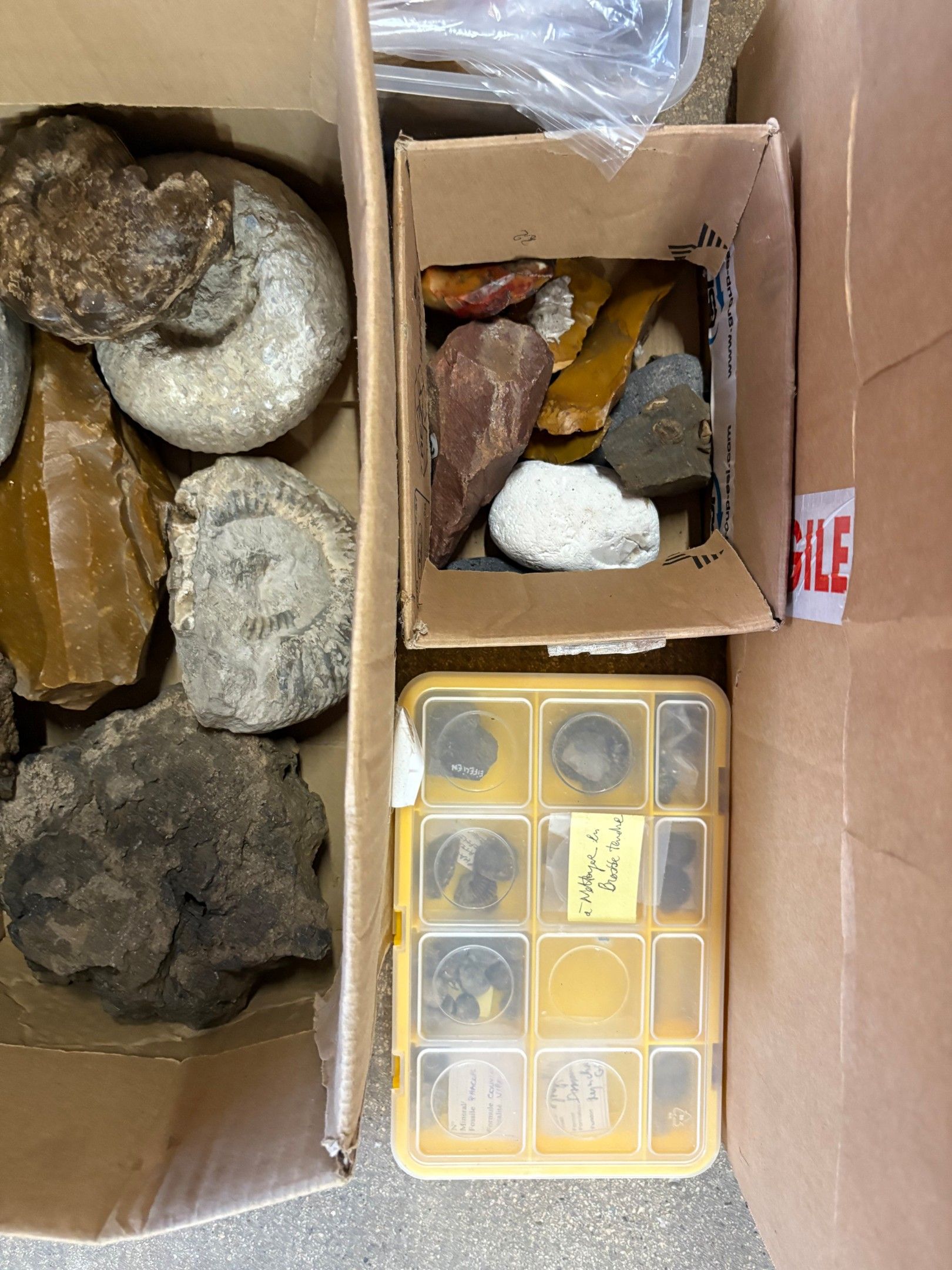 Three boards with cut flints, ammonites and nuclei or "livre…
