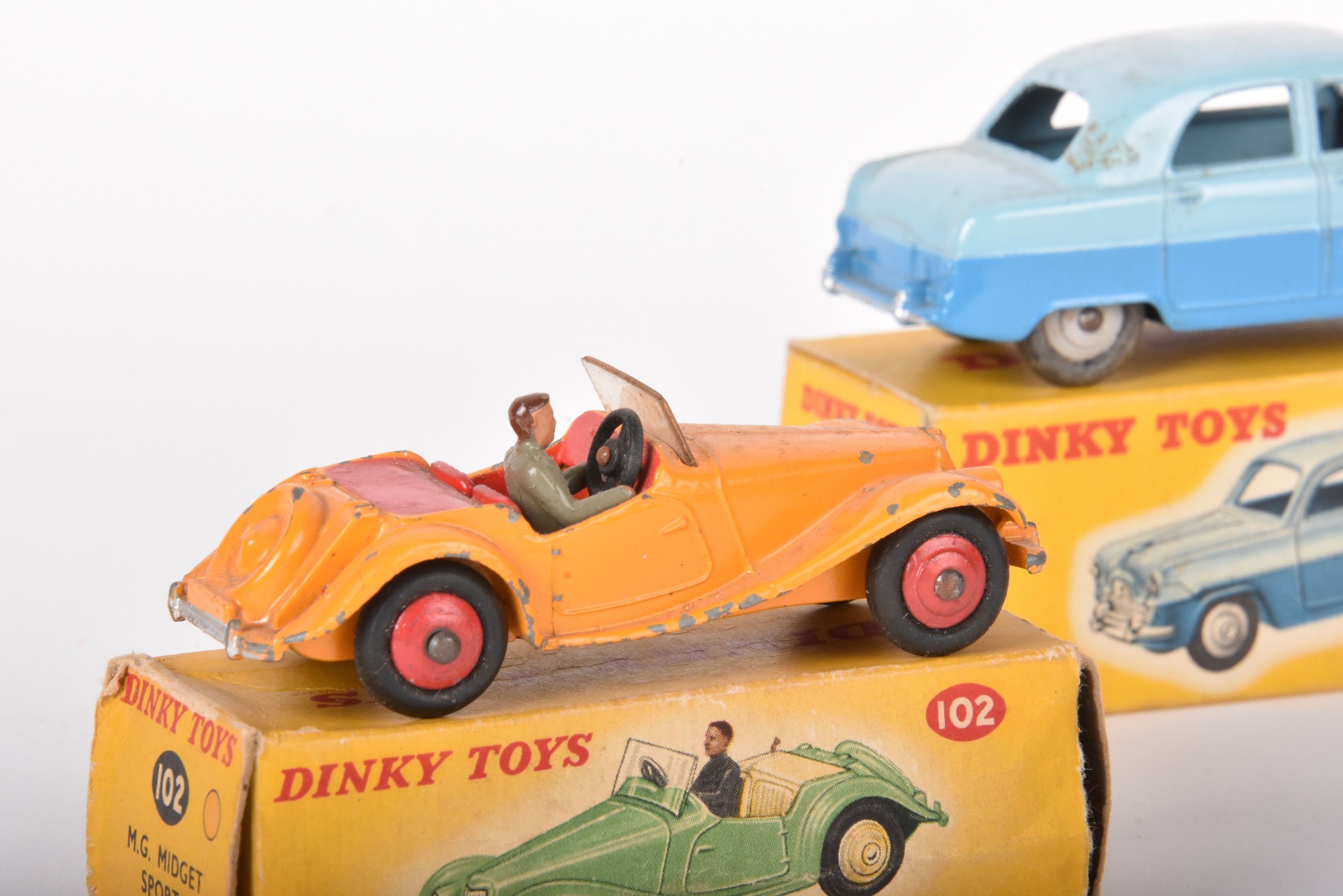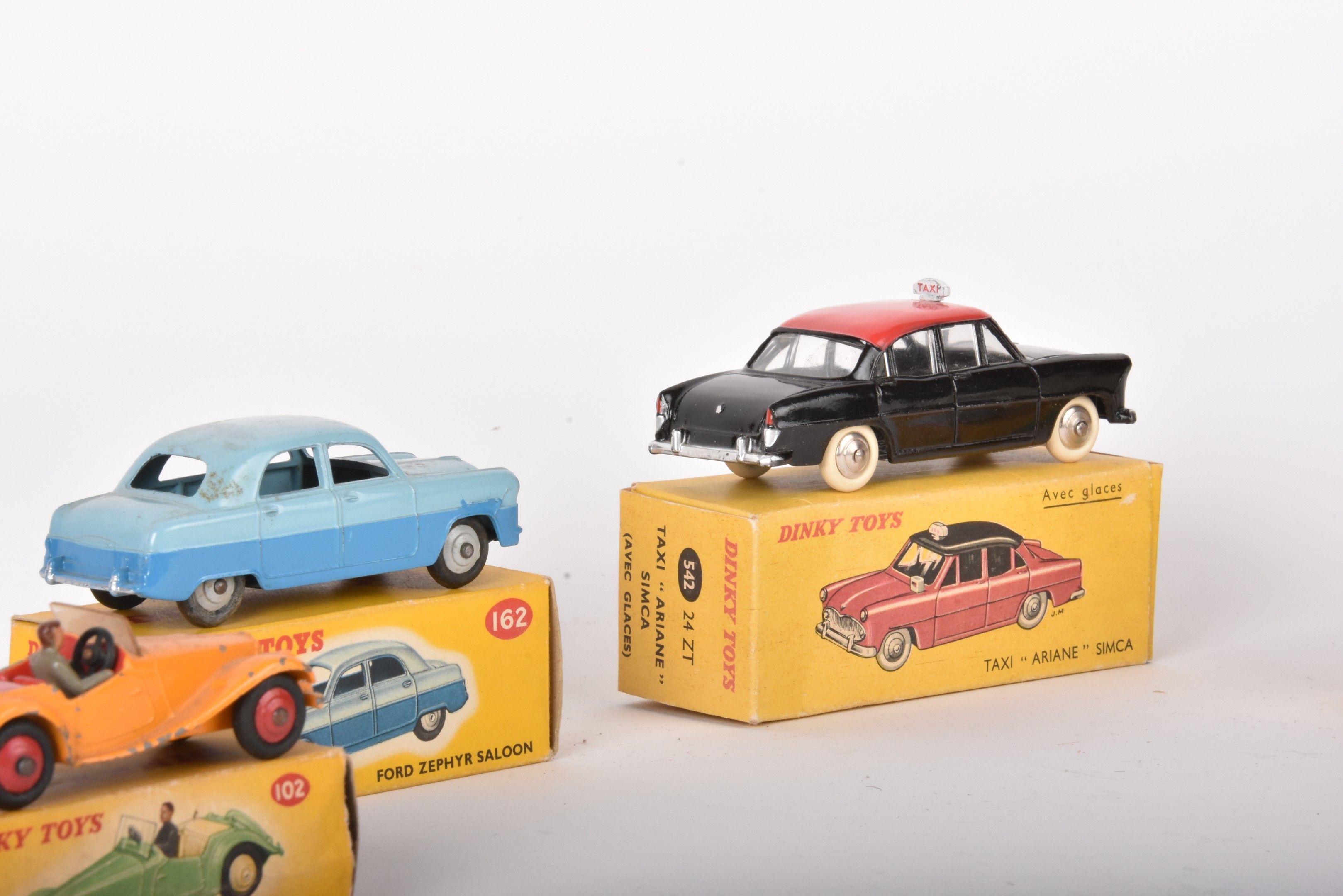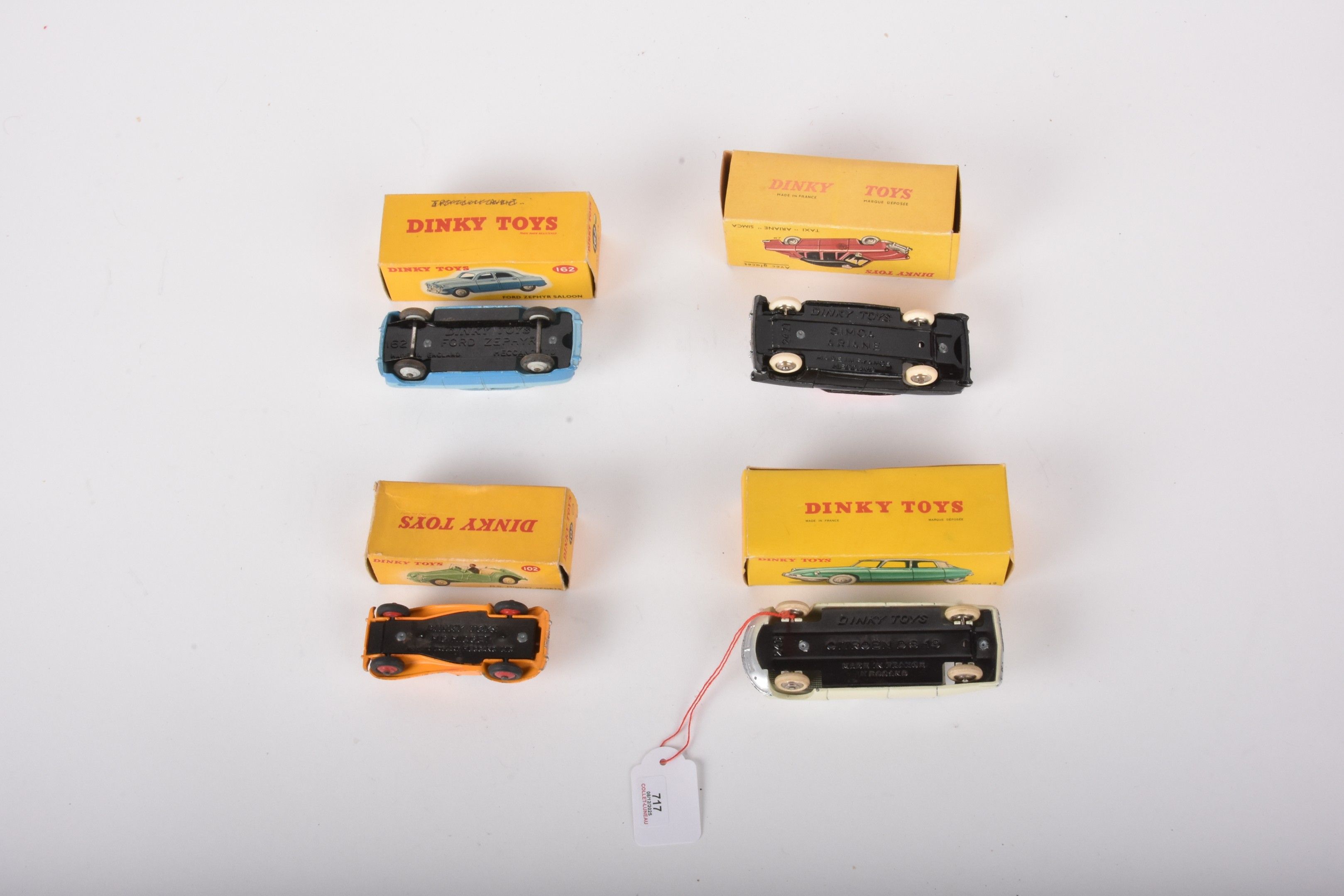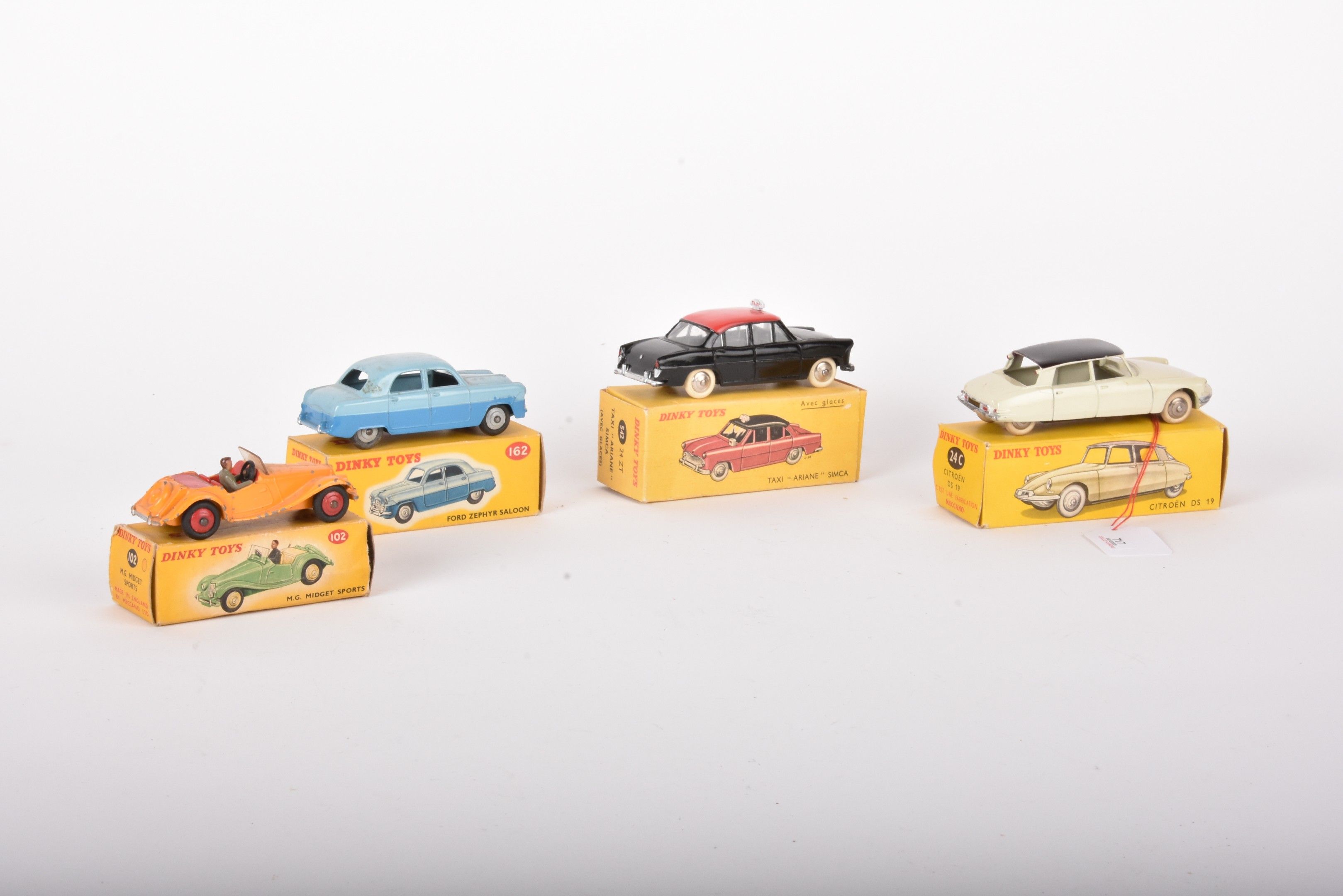 DINKY TOYS F and A Lot of 4 miniatures including: -24C Citroën DS19 (chips), box with wear -24U 162 Ford Zephir (chips), box with wear -24 ZT Simaca Ariane taxi (BE) box with some wear -102 MG Midget sport (chips), box with wear