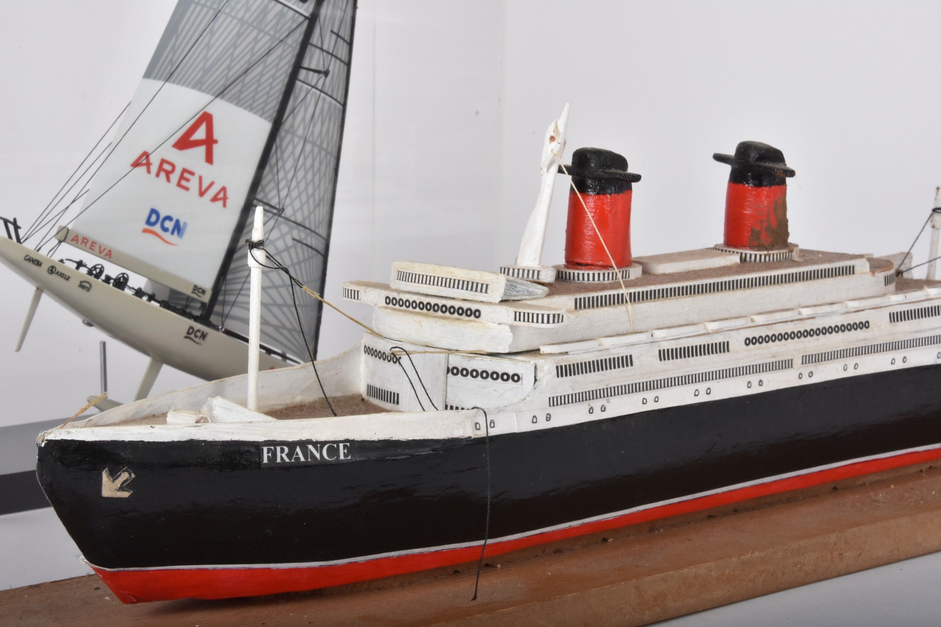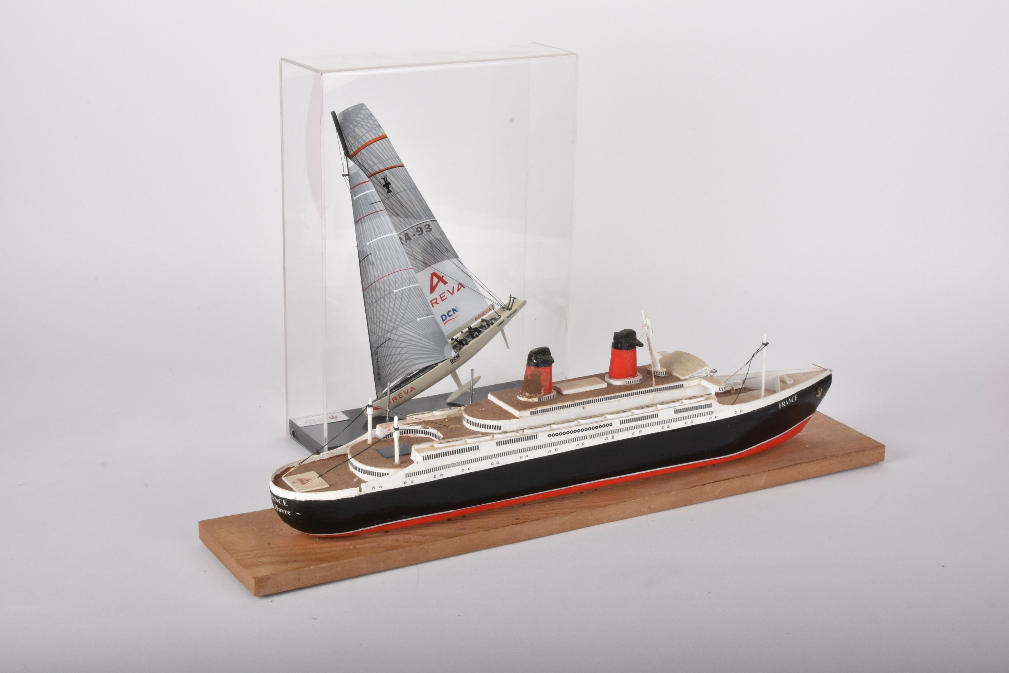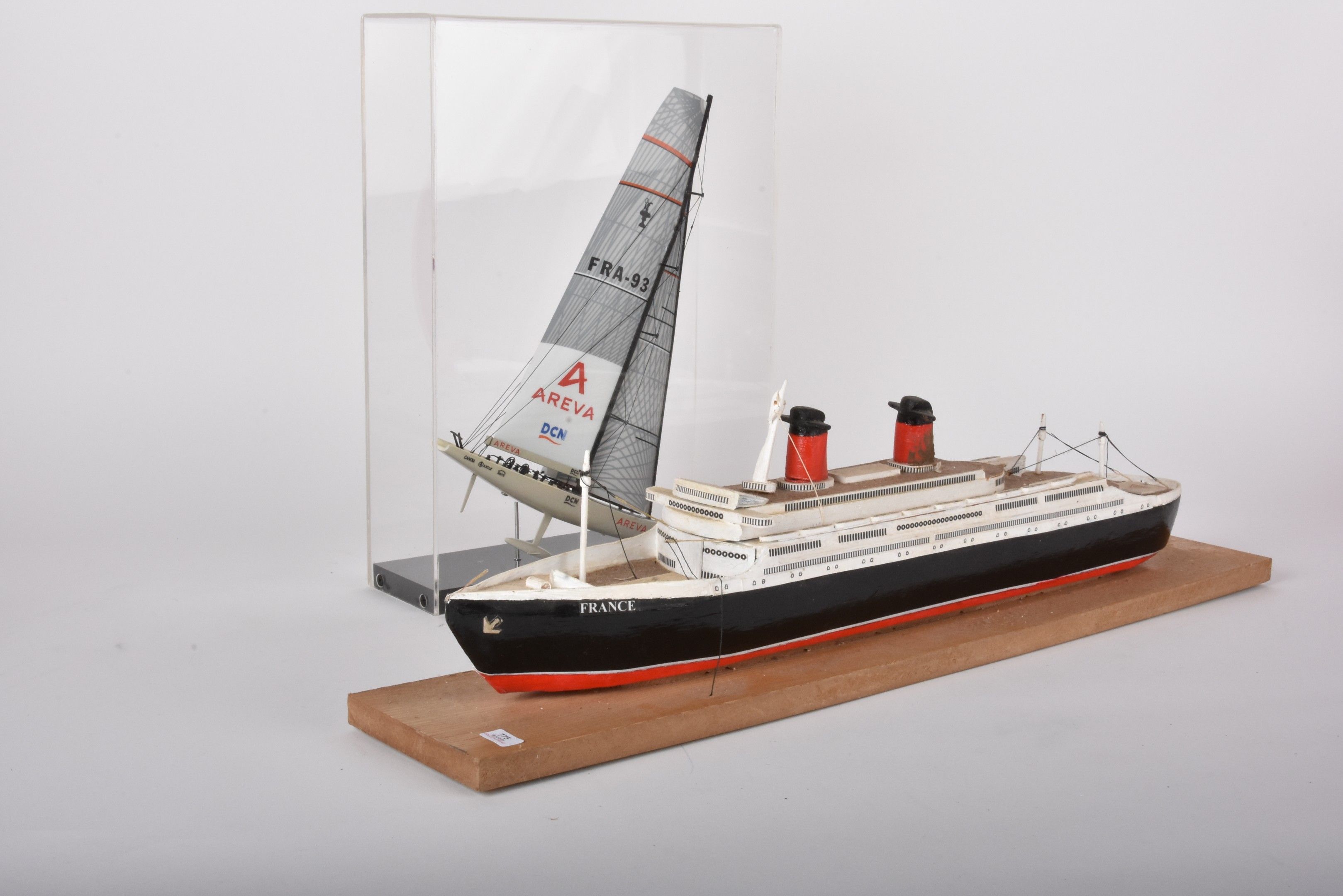 Model of the ocean liner FRANCE in wood (small accidents and missing parts) L. 56 cm. A model of an AREVA sailing ship (under plexiglass, unhooked from its support).