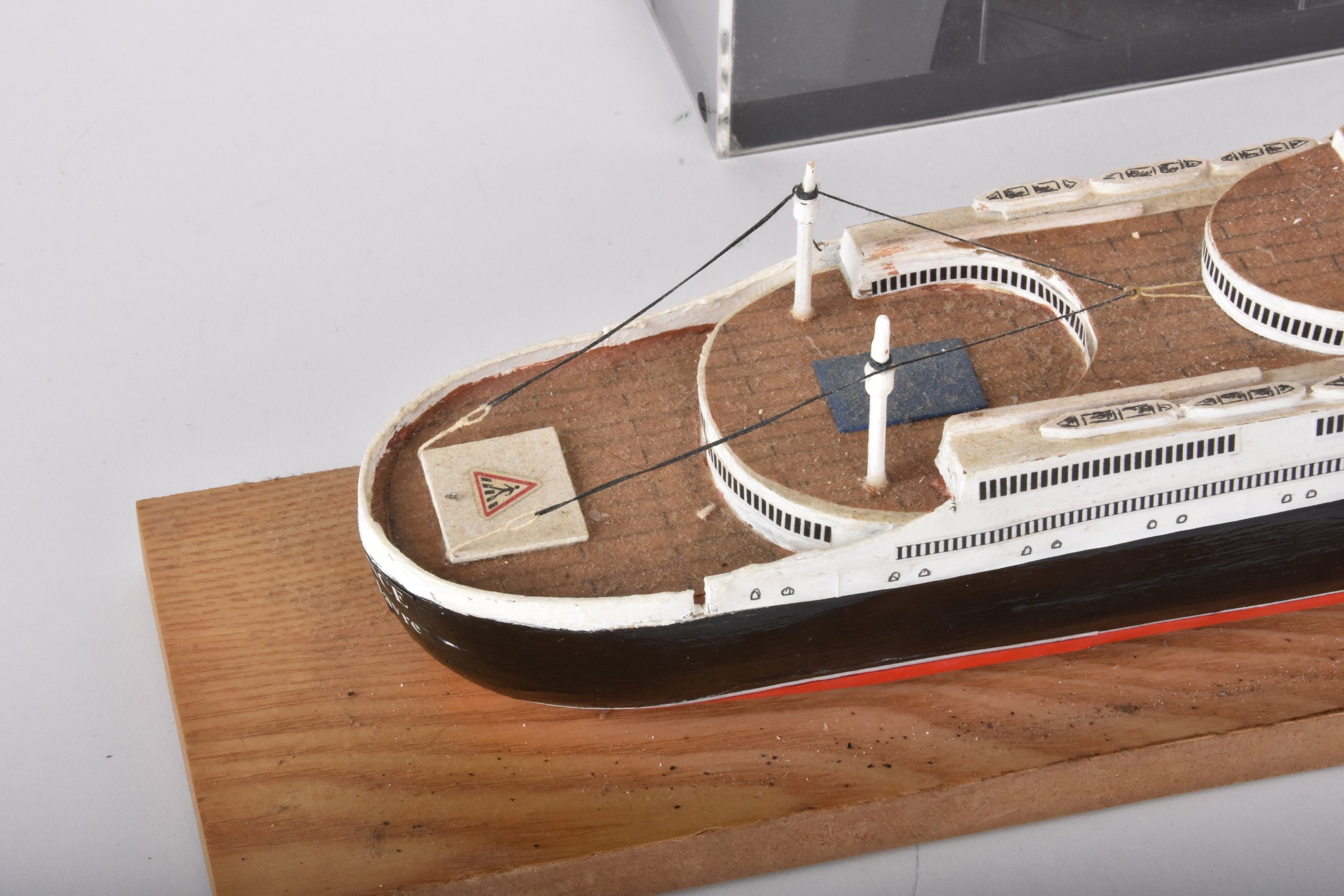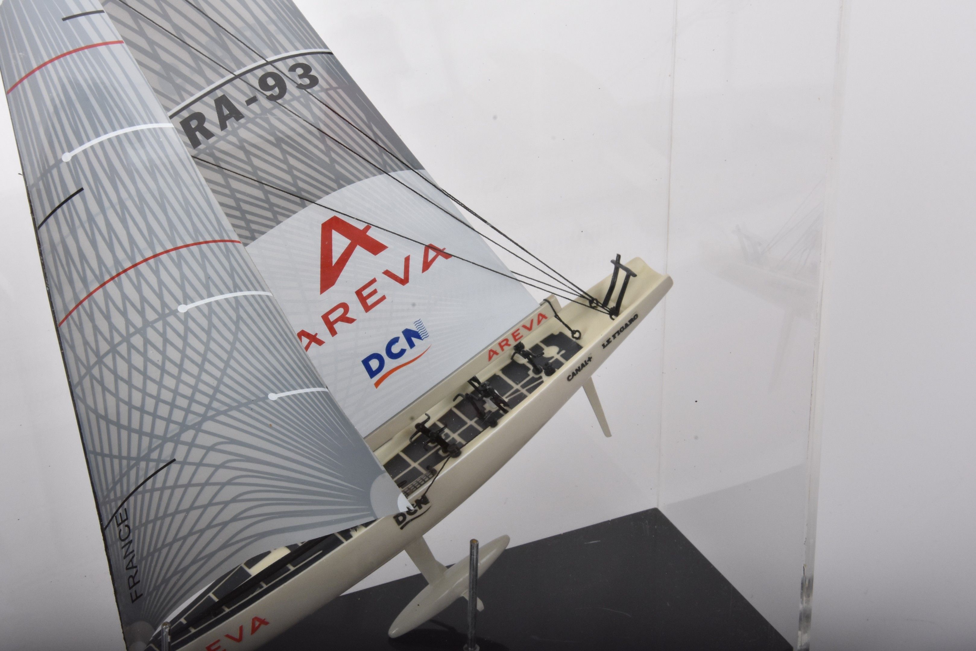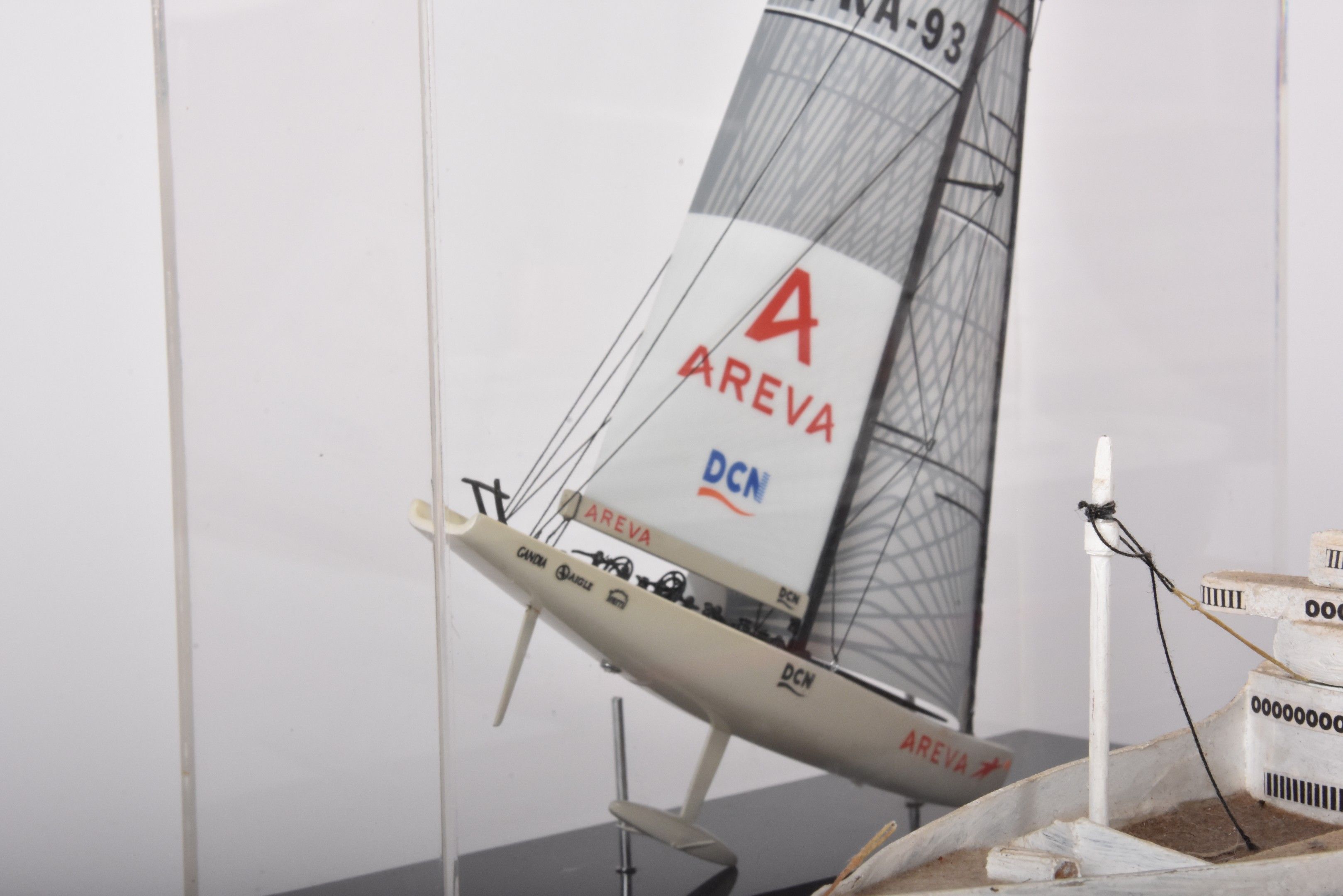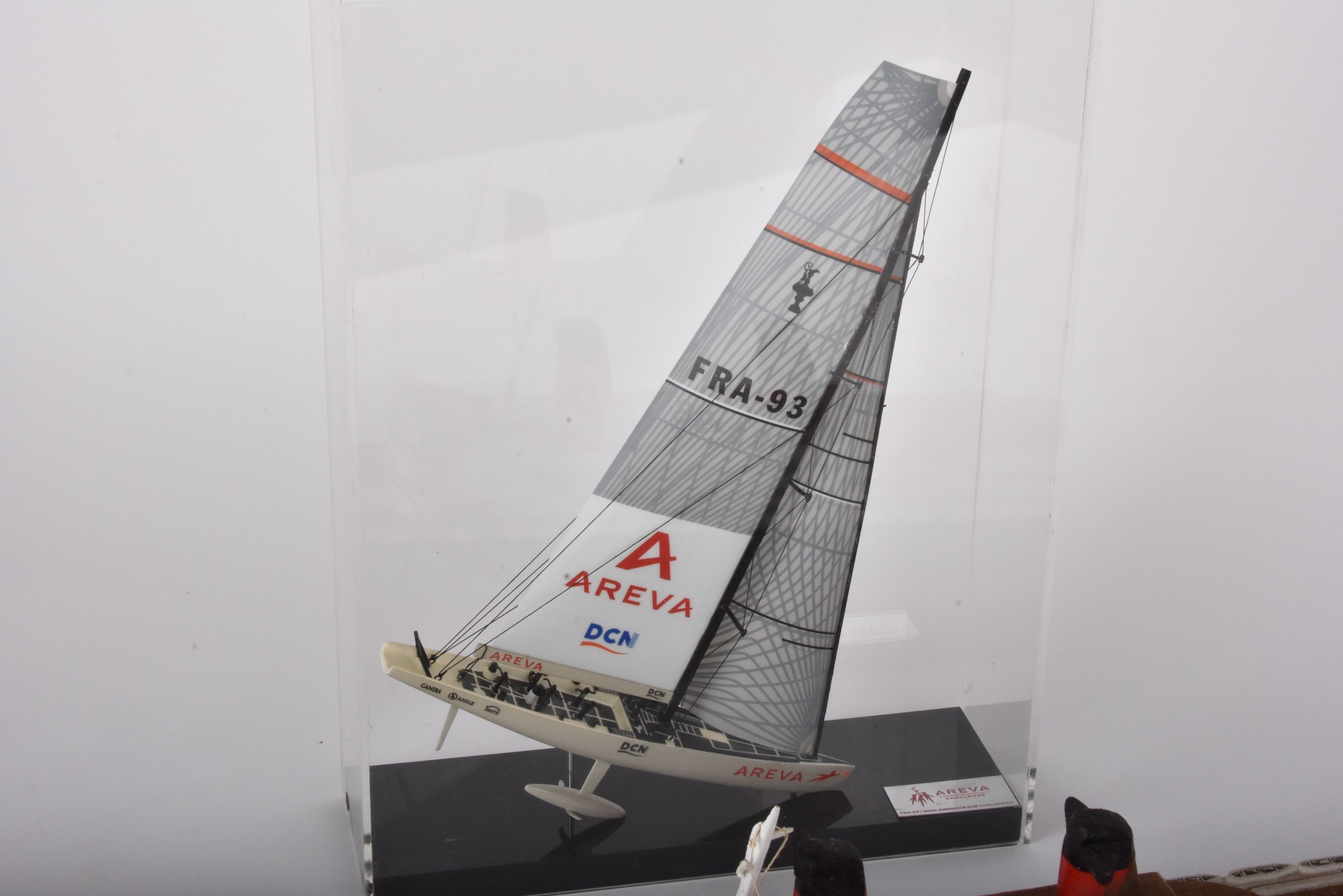 Model of the ocean liner FRANCE in wood (small accidents and missing parts) L. 56 cm. A model of an AREVA sailing ship (under plexiglass, unhooked from its support).