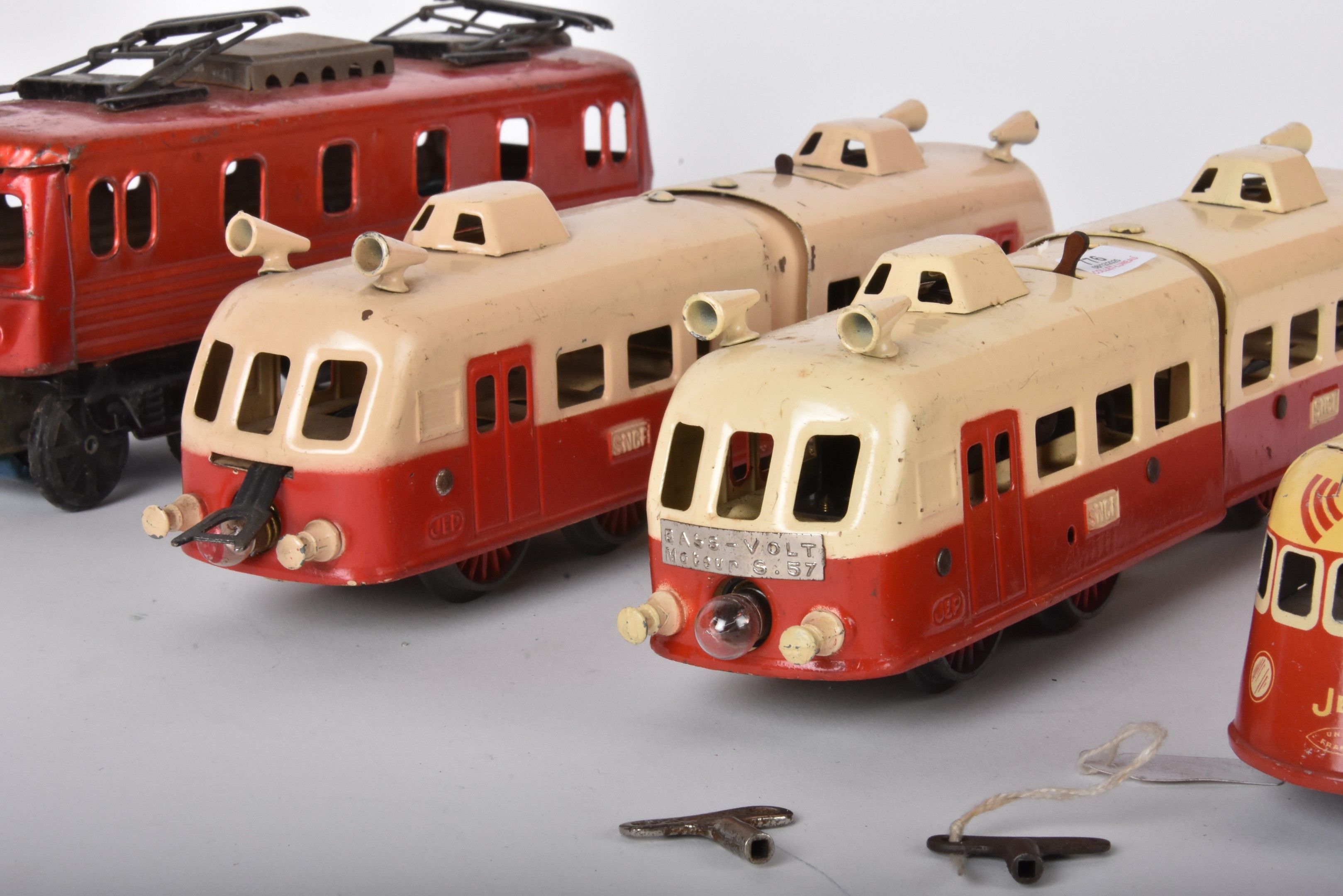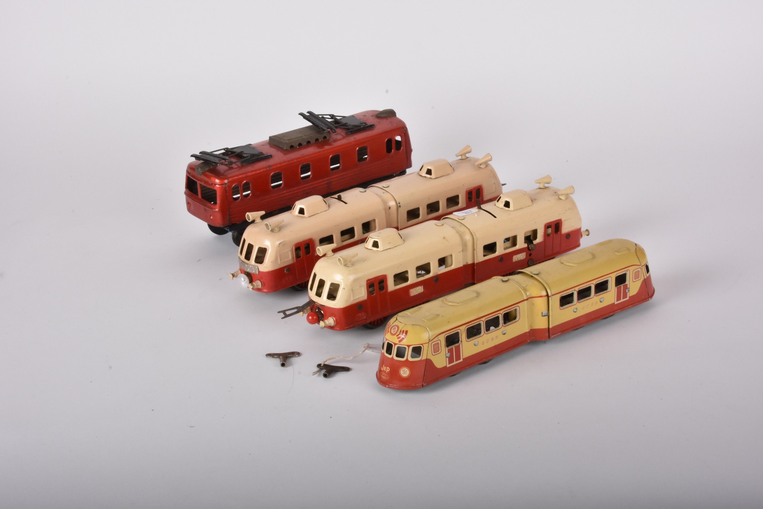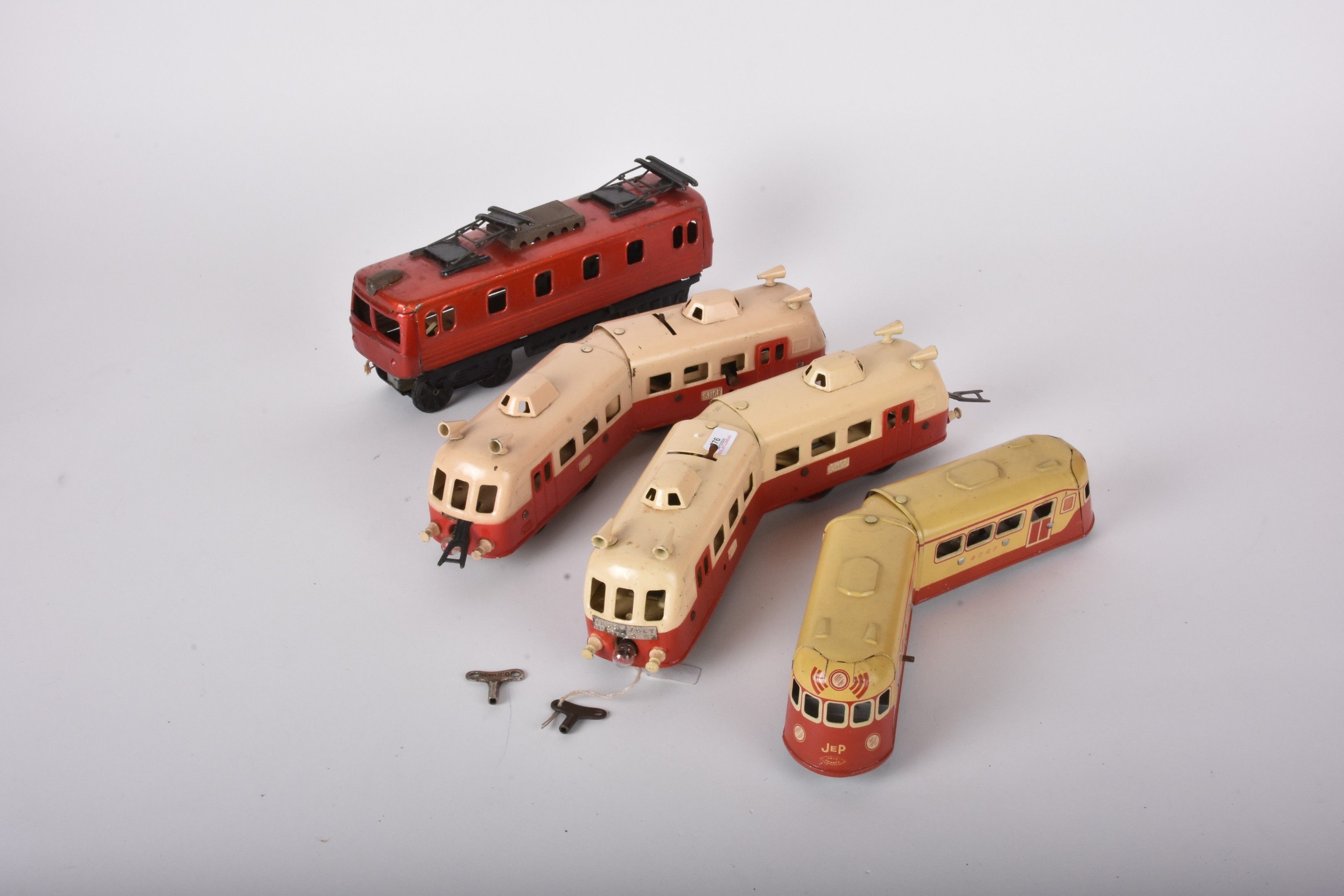 4 painted sheet metal locomotives, 3 of them JEP and 1 with no visible mark (accidents and missing parts) L. 30 cm