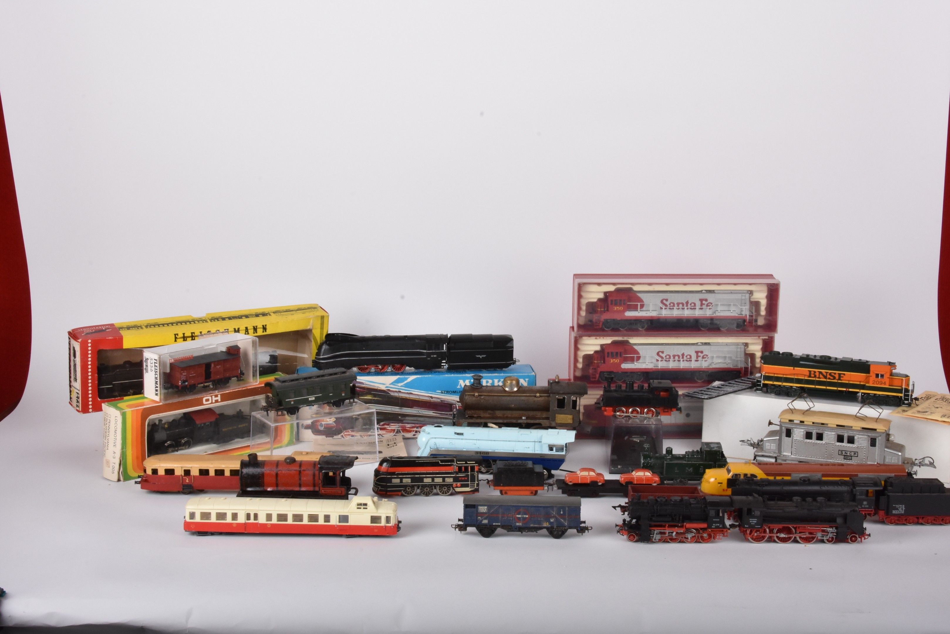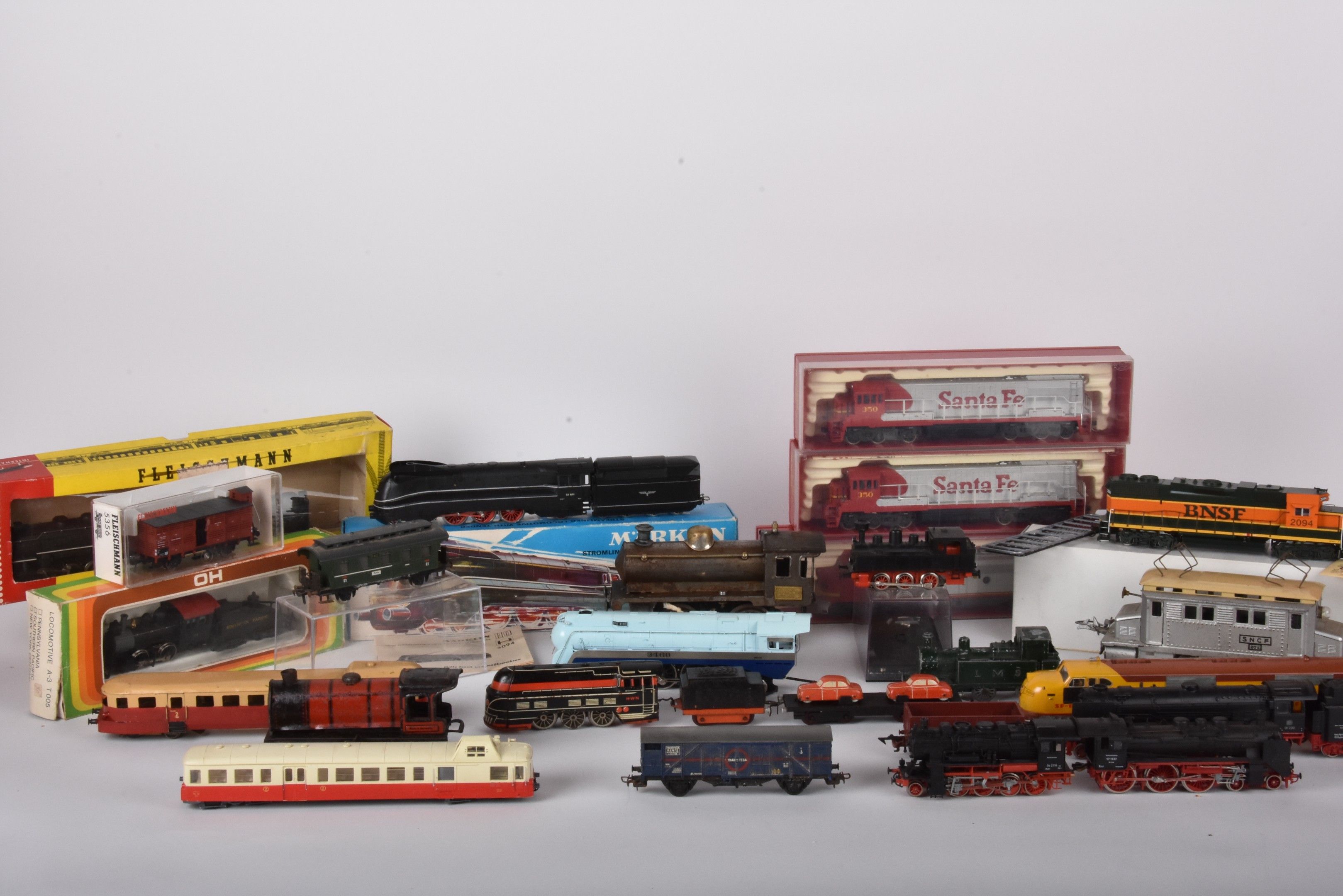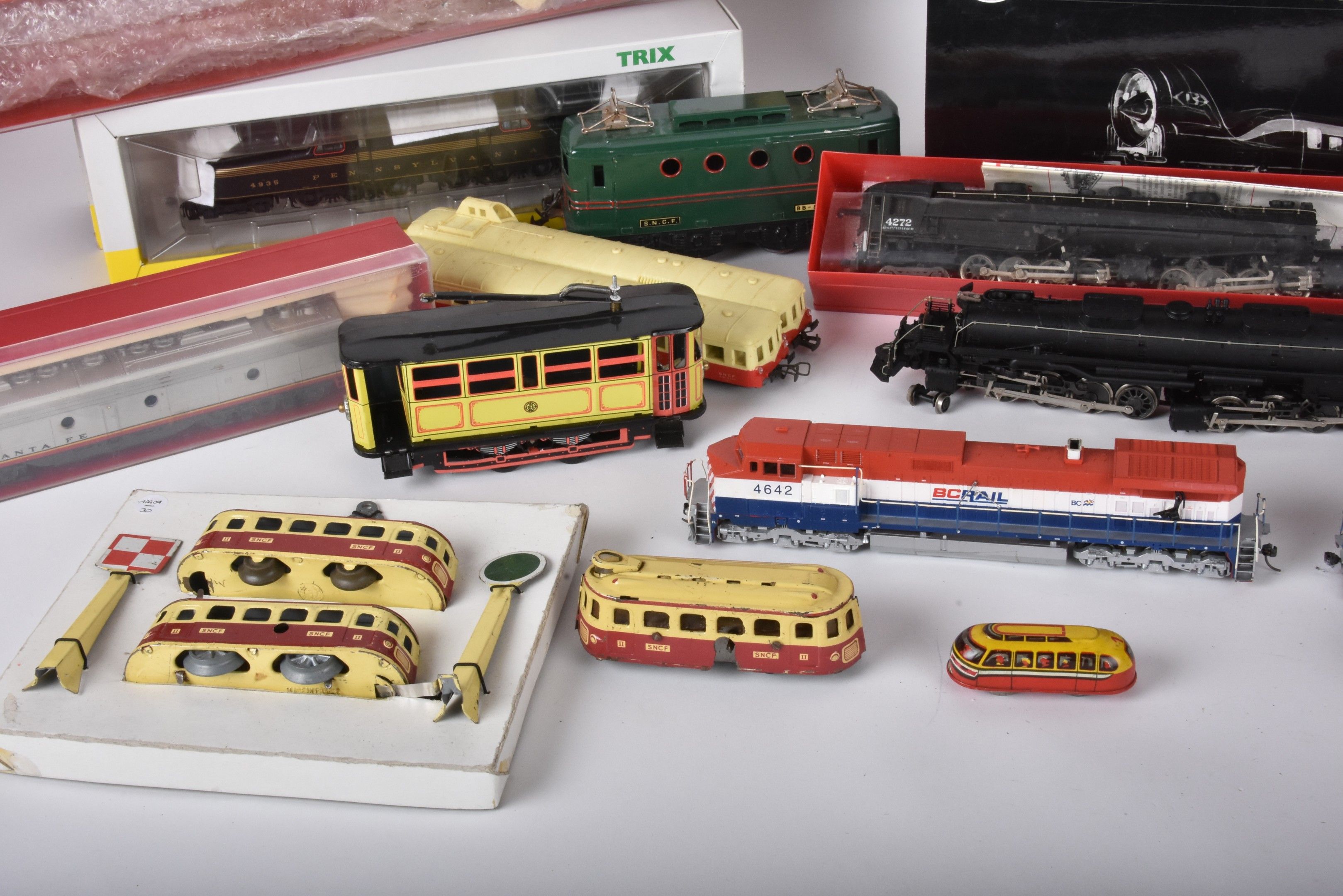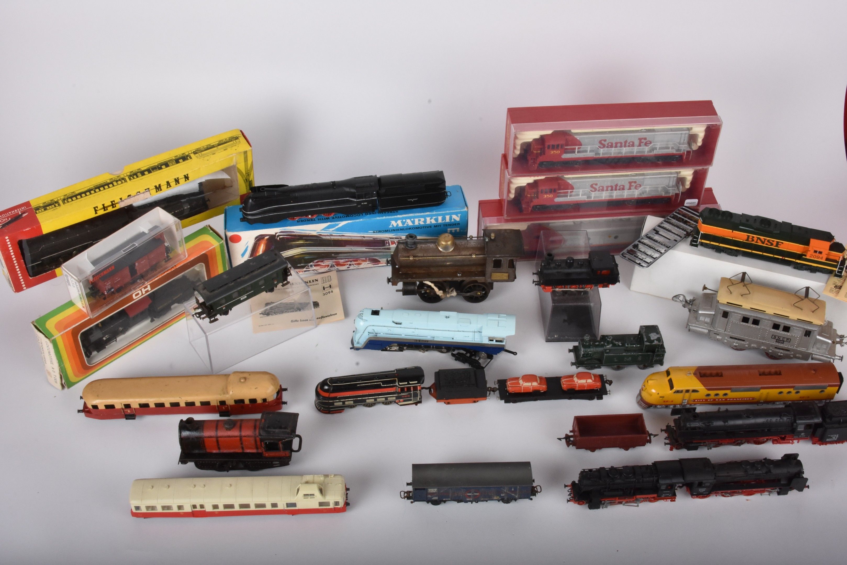 Large lot of trains and carriages, mainly HO, locomotives 3460, SF1, 96,4272 with many decorations, Esso and Shell advertising carriages (in two boxes, damaged and missing).