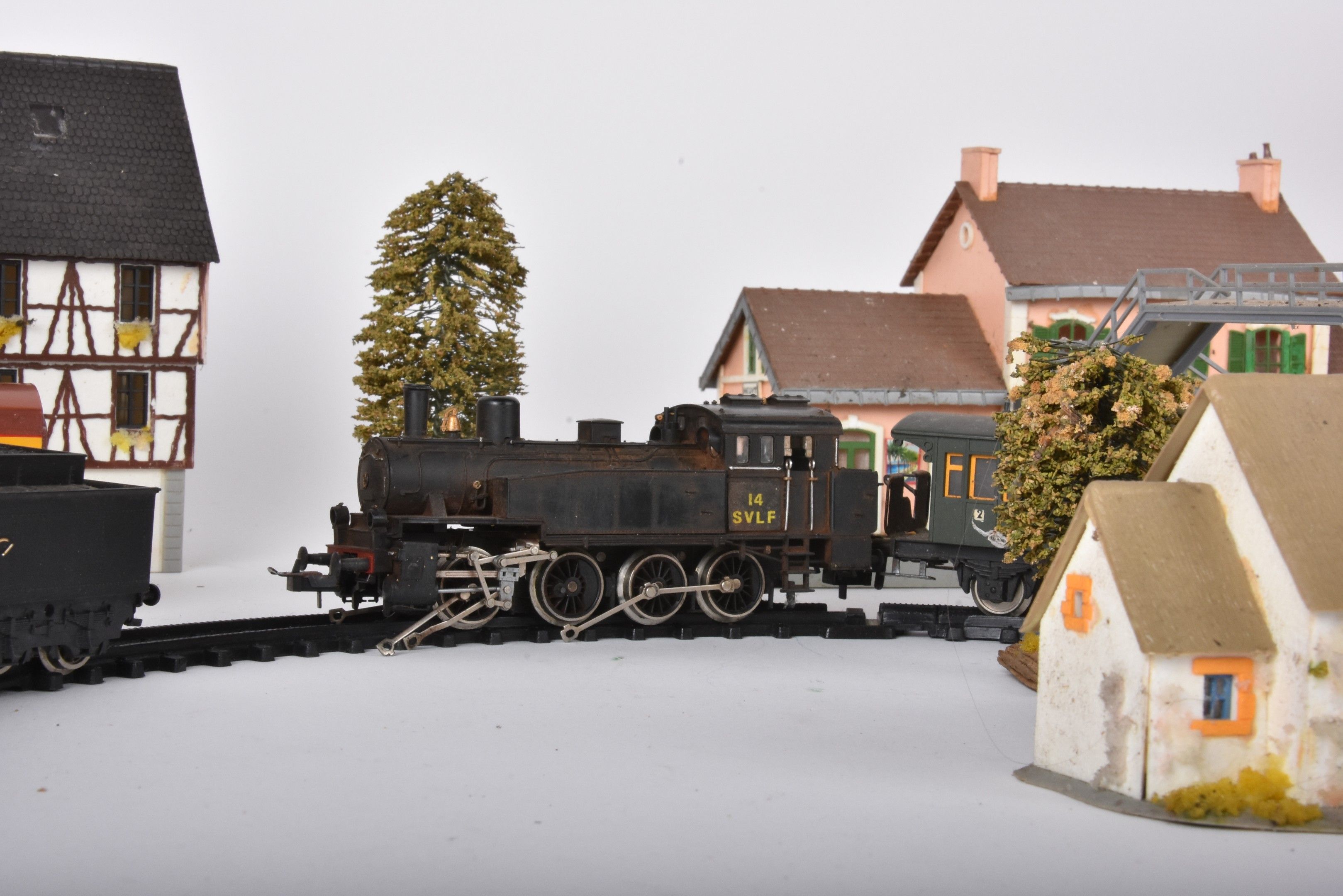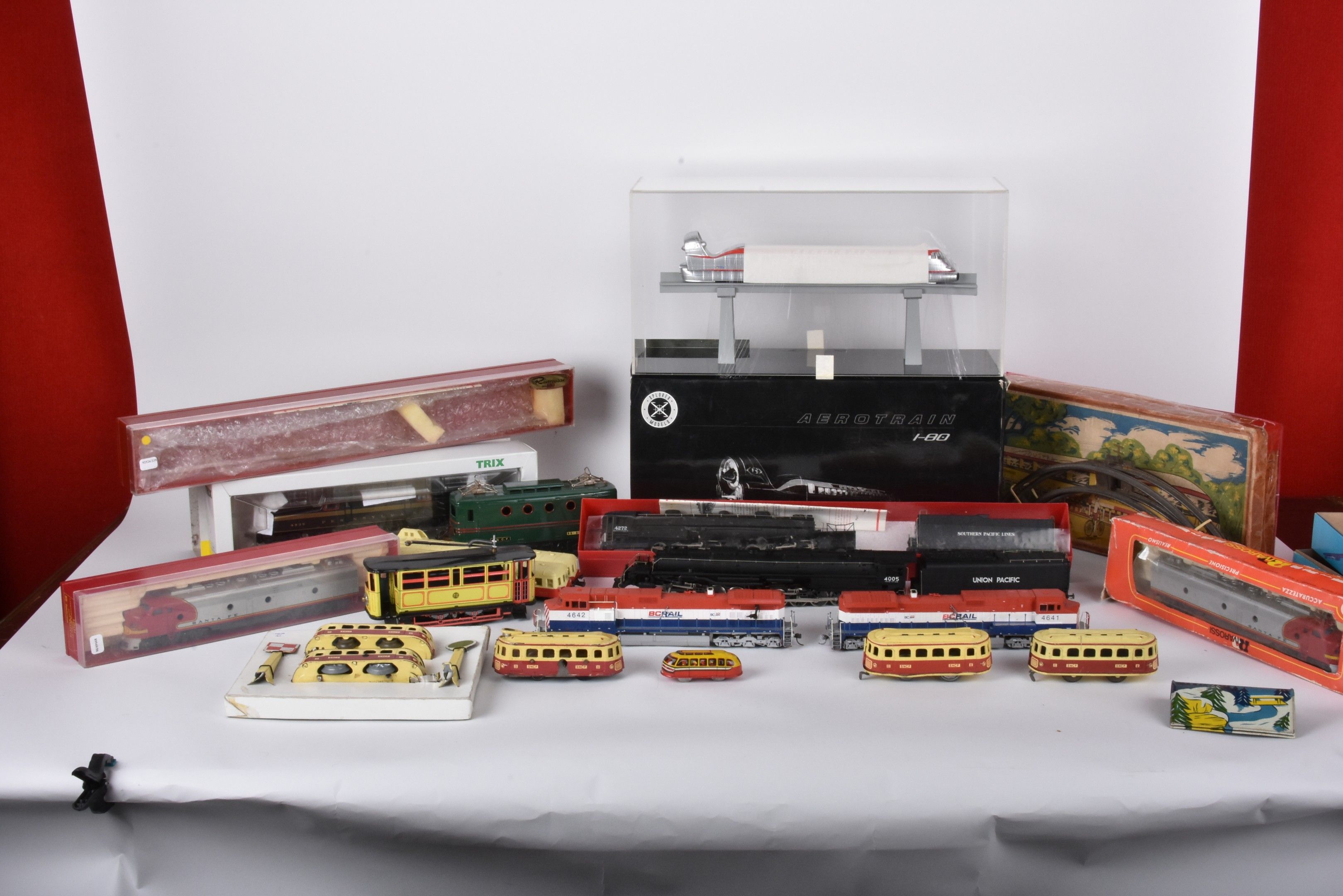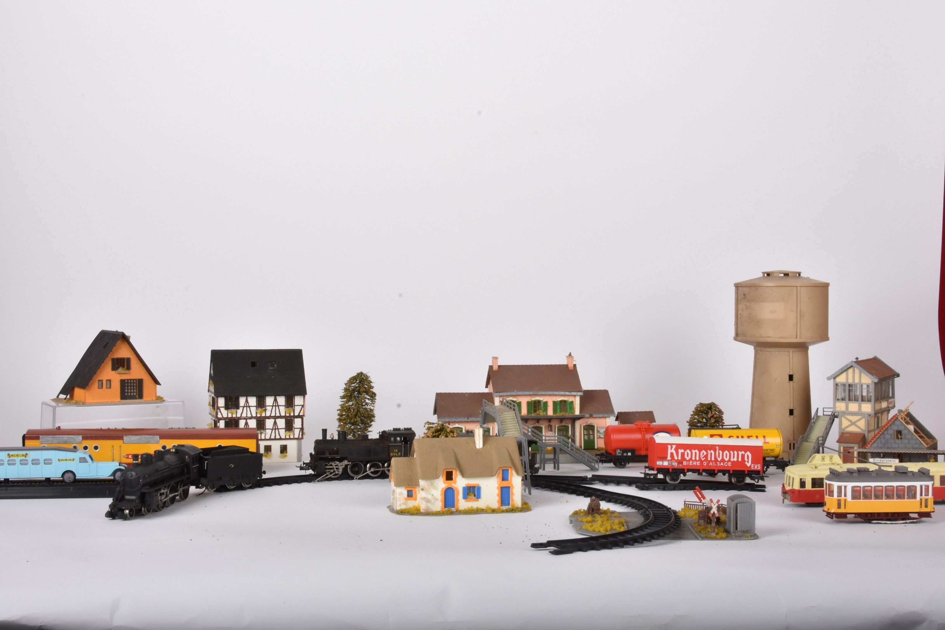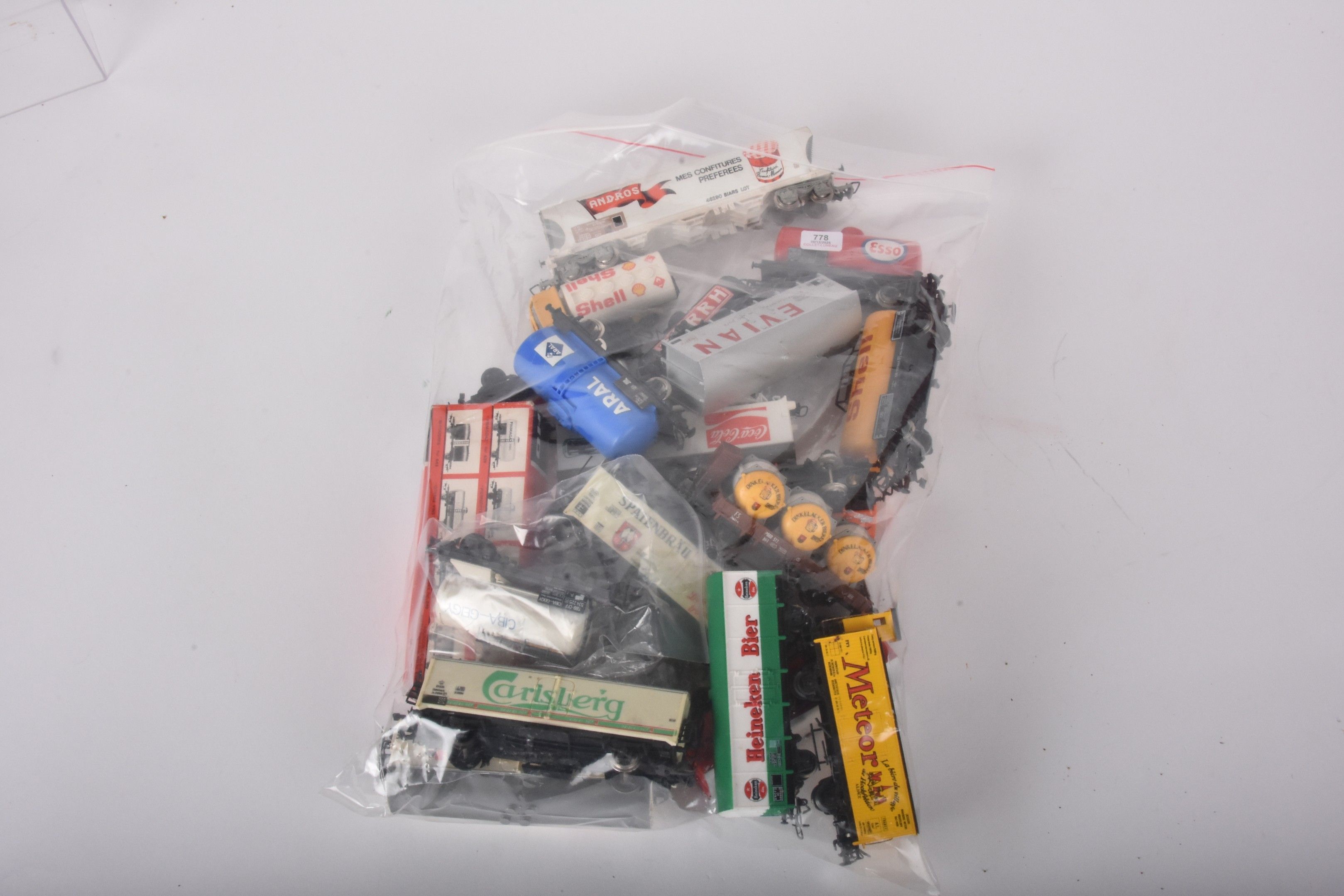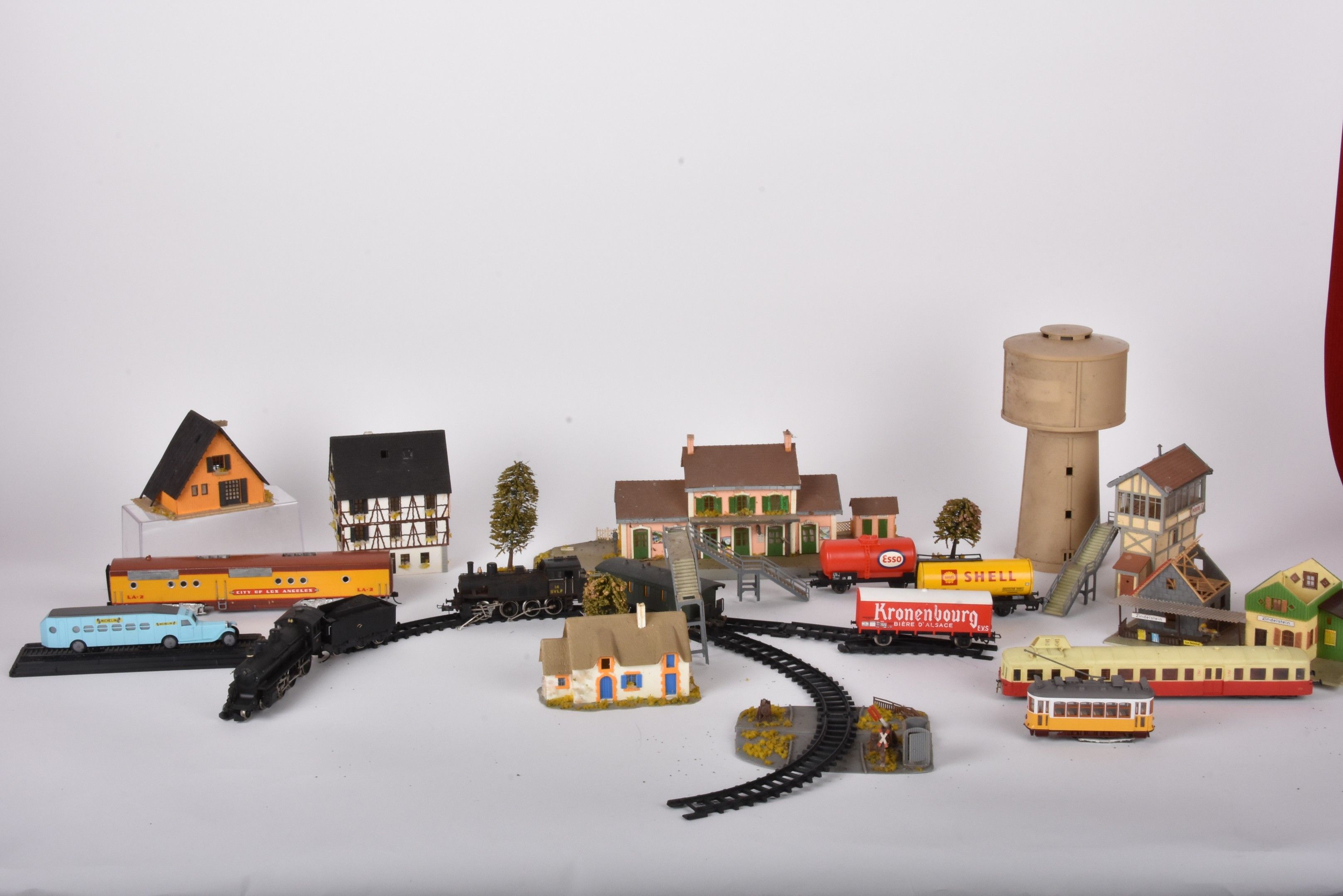 Large lot of trains and carriages, mainly HO, locomotives 3460, SF1, 96,4272 with many decorations, Esso and Shell advertising carriages (in two boxes, damaged and missing).