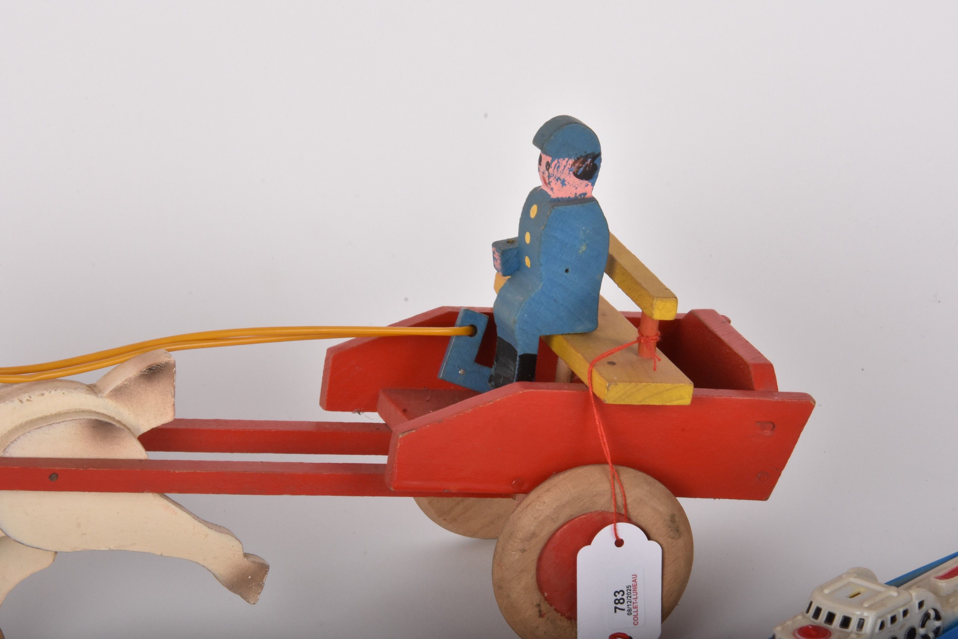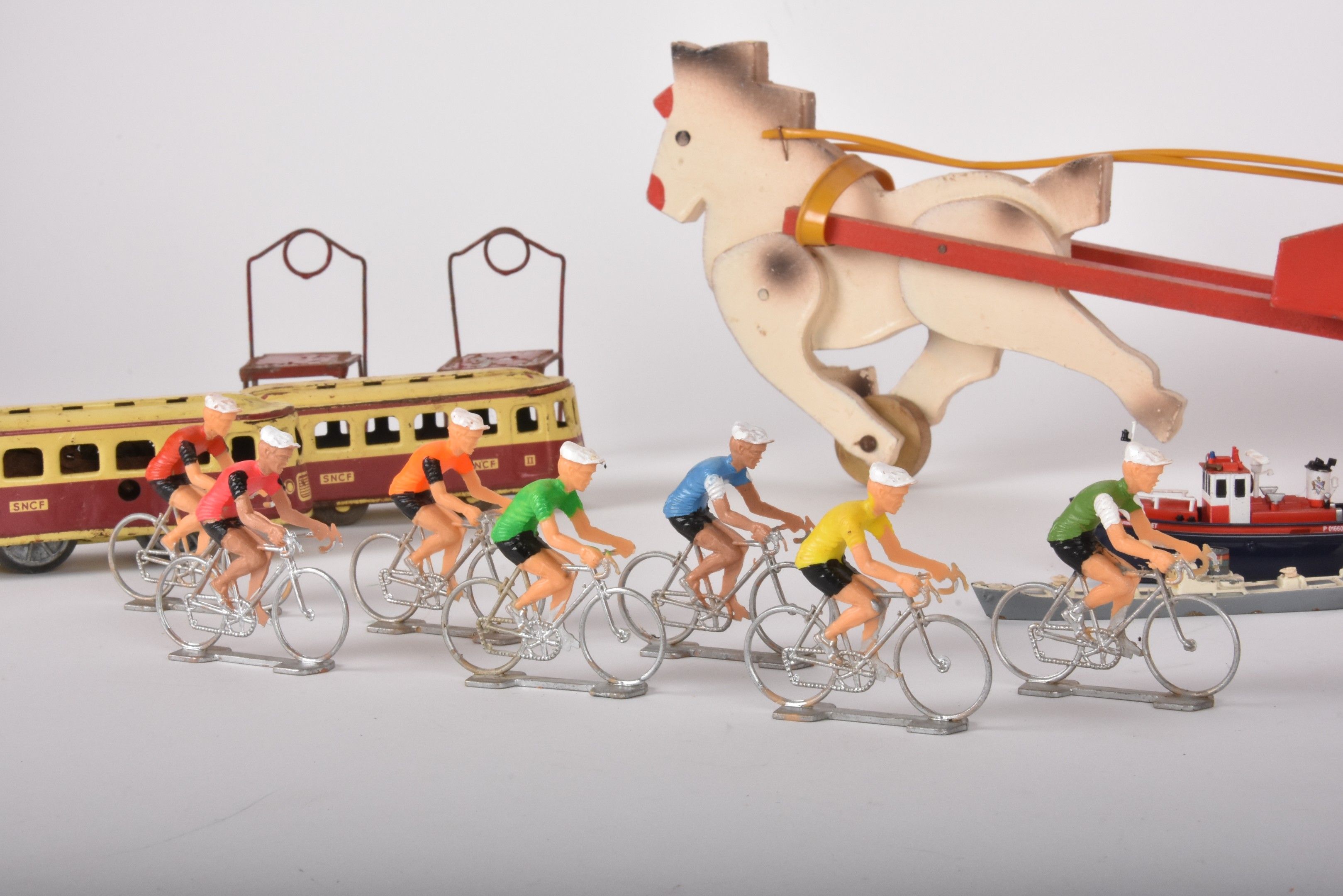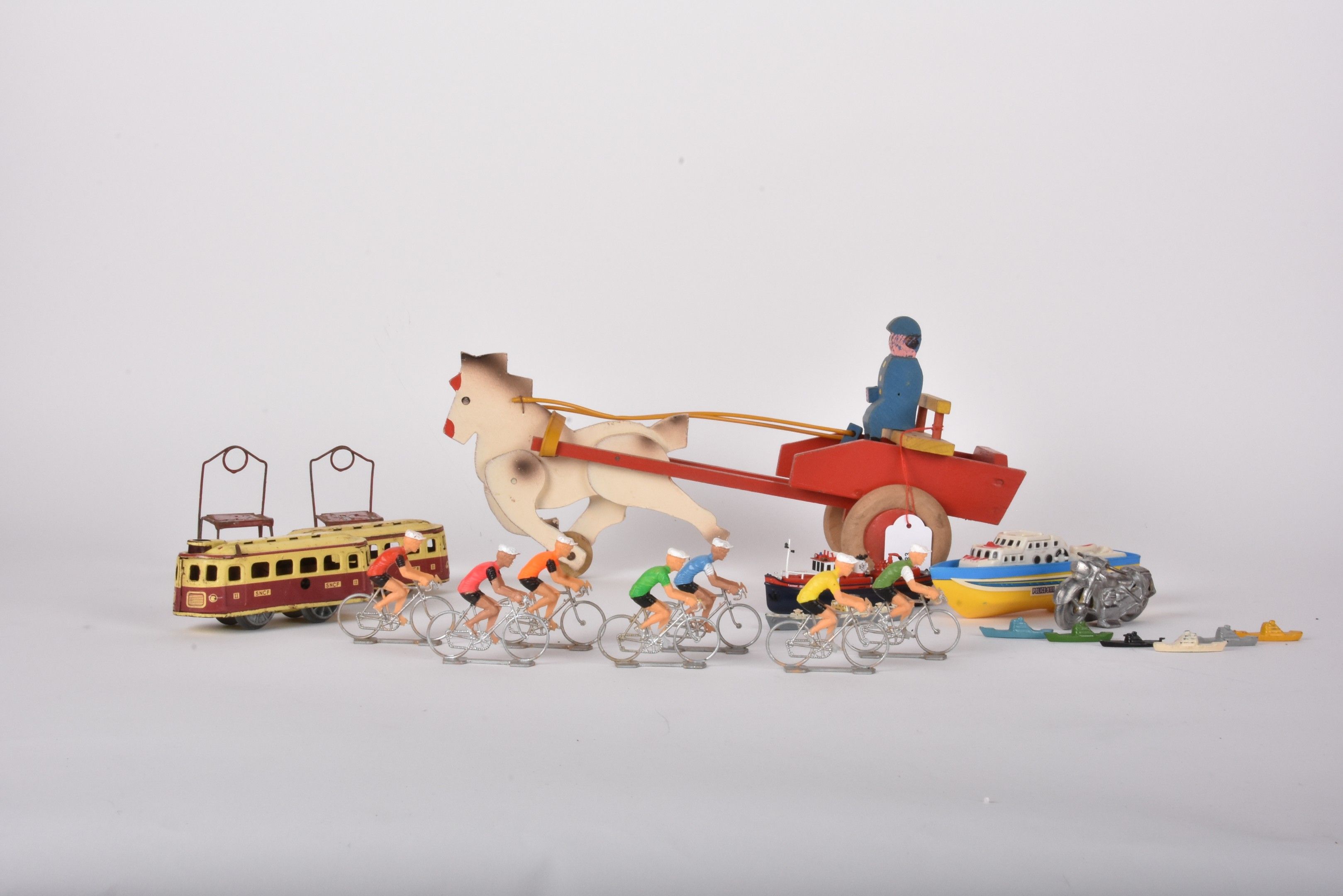 Batch of various toys: wooden cart, plastic bicycle racers, …