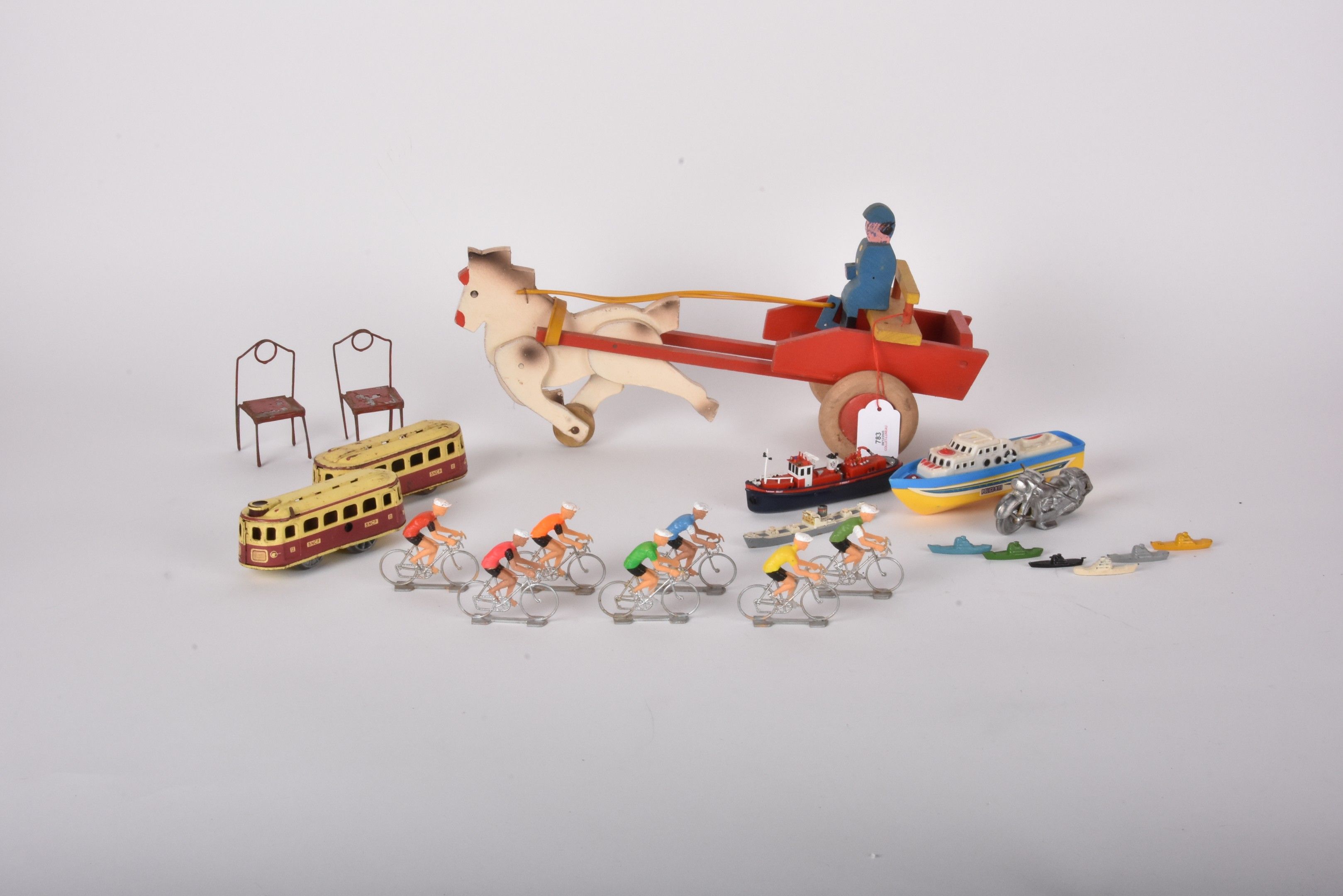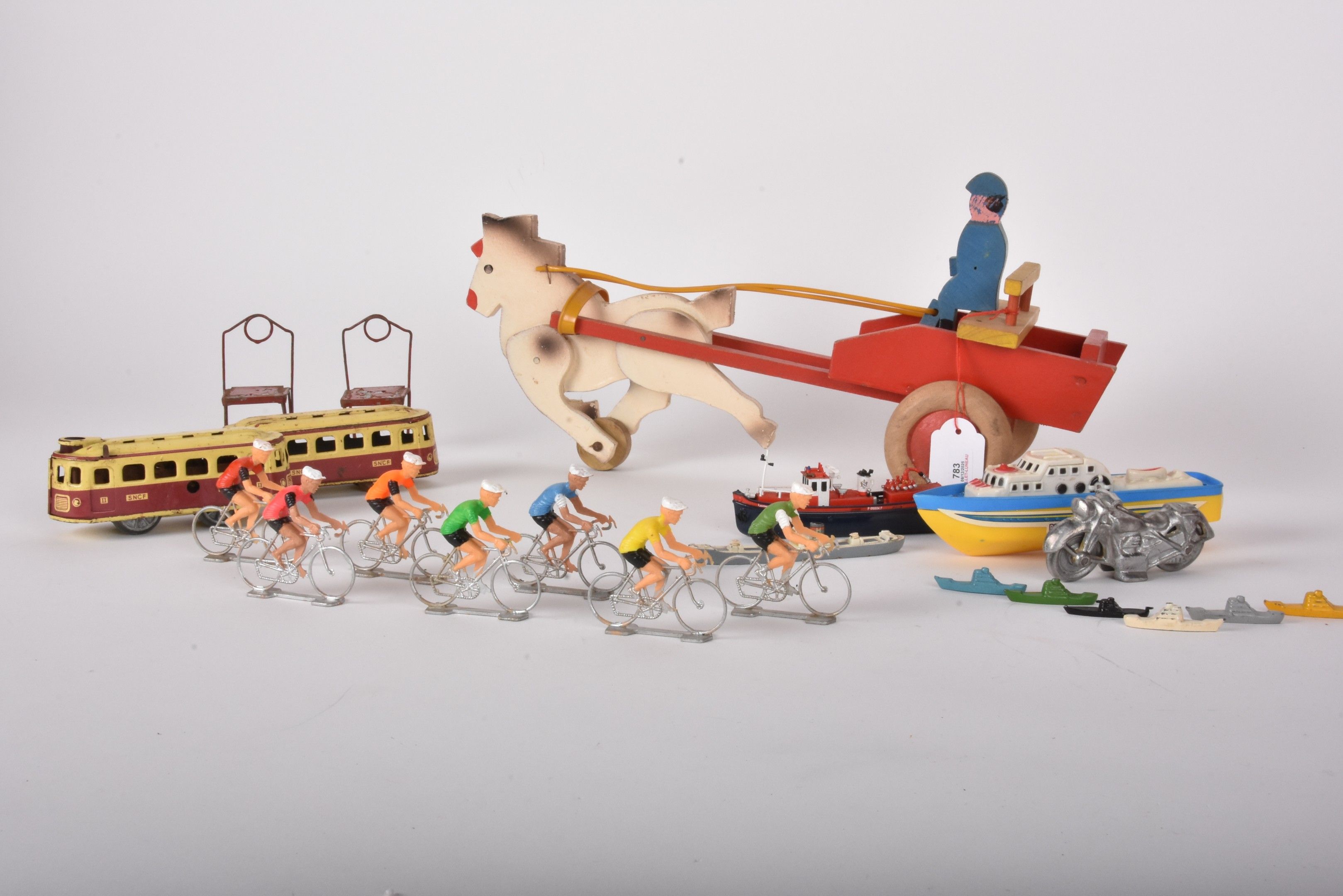 Batch of various toys: wooden cart, plastic bicycle racers, 2 painted sheet metal SNCF locomotives and a metal motorbike.
