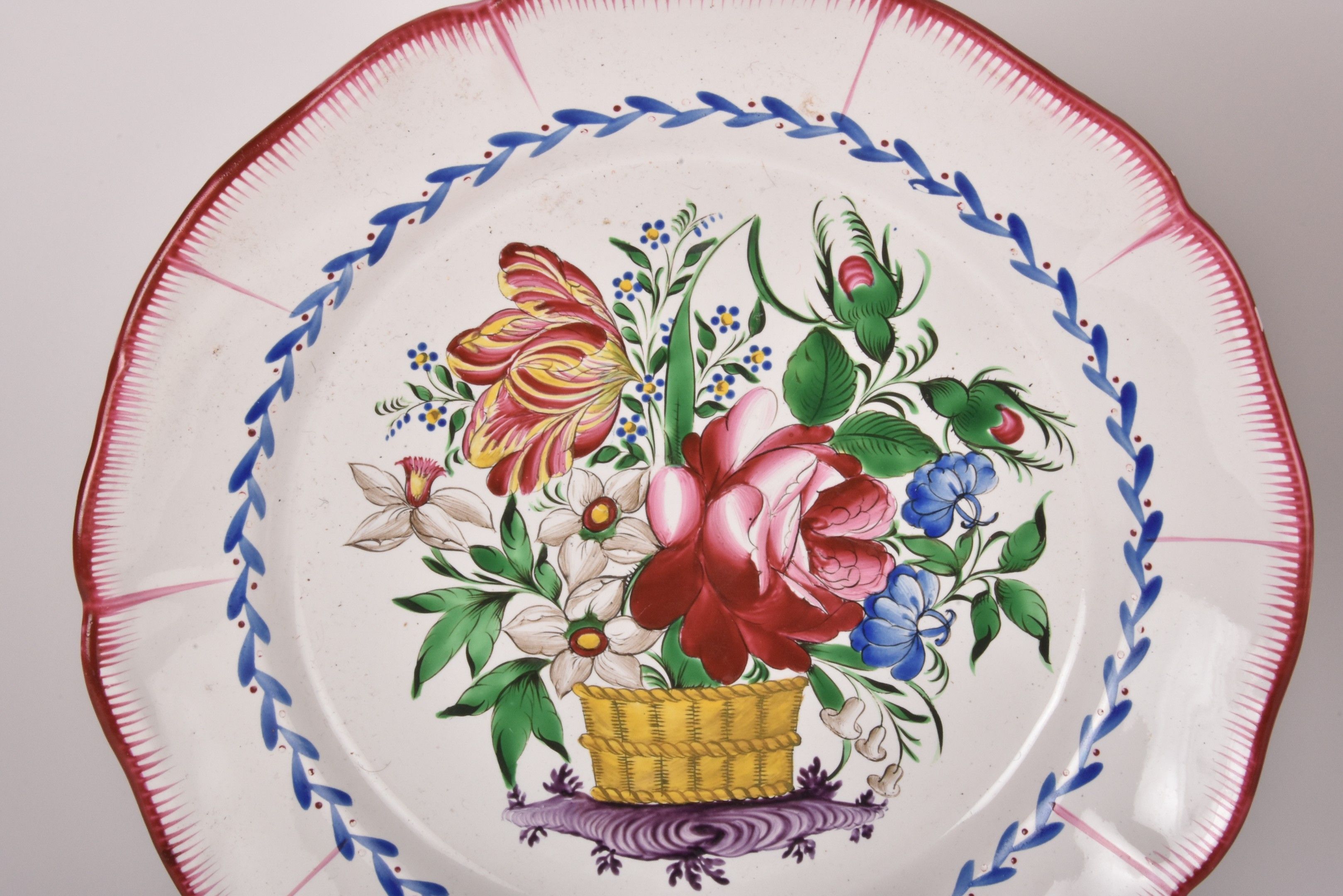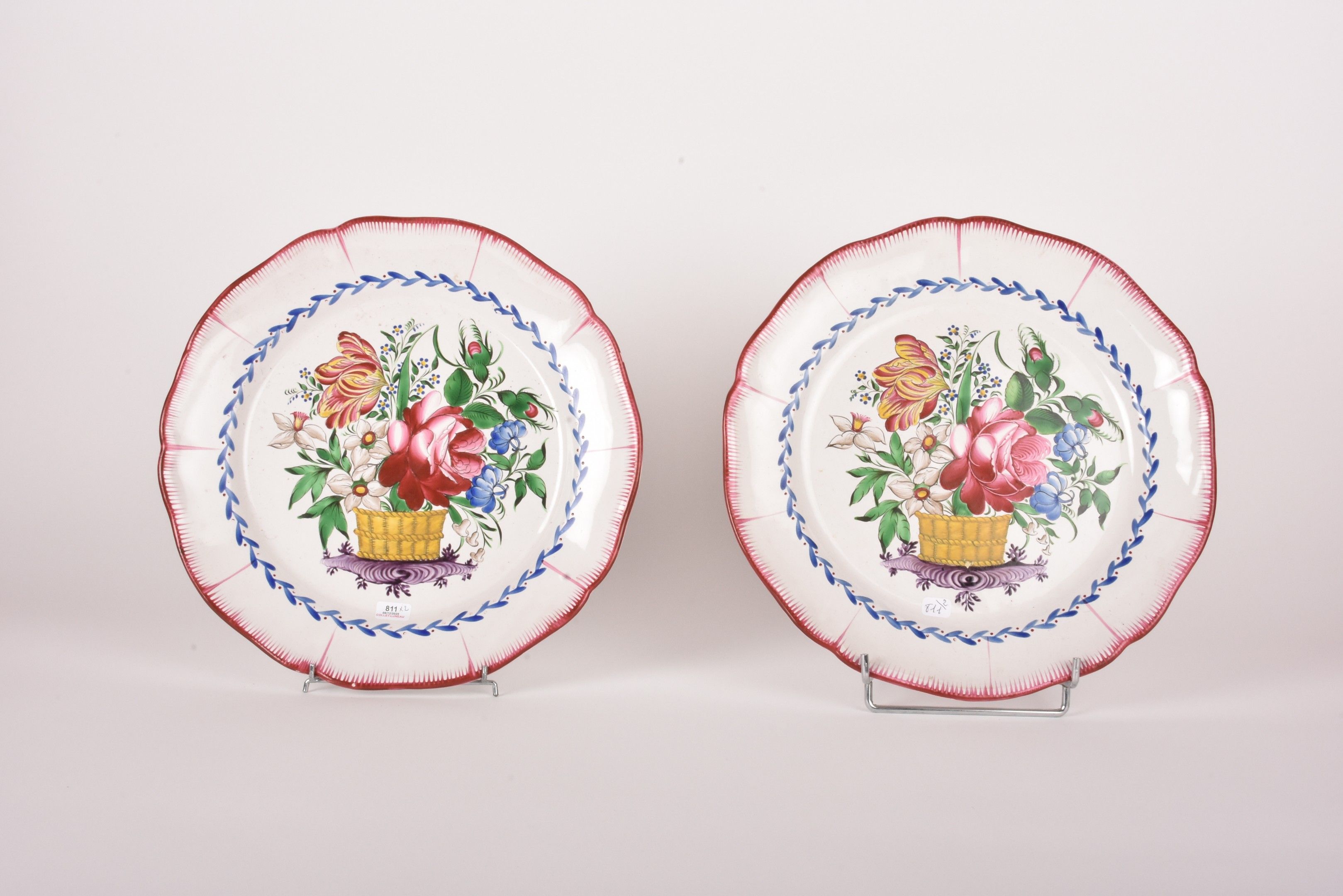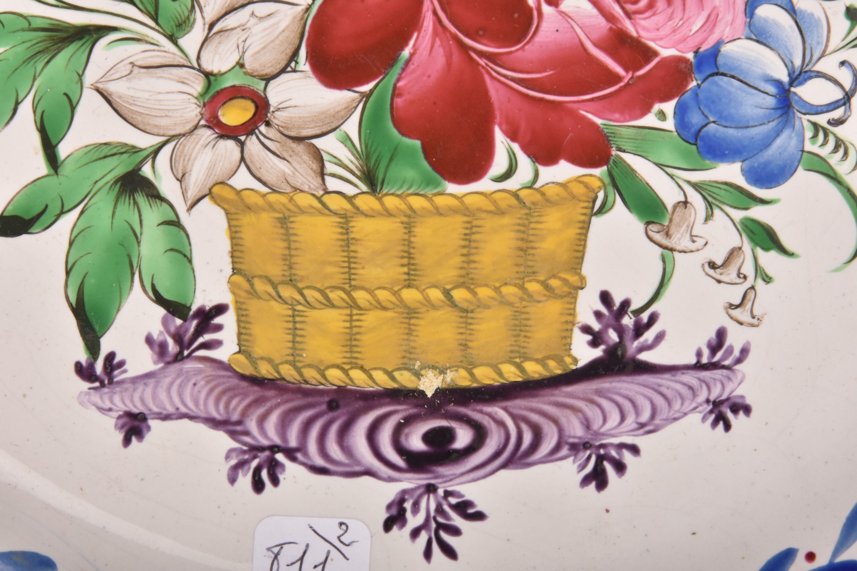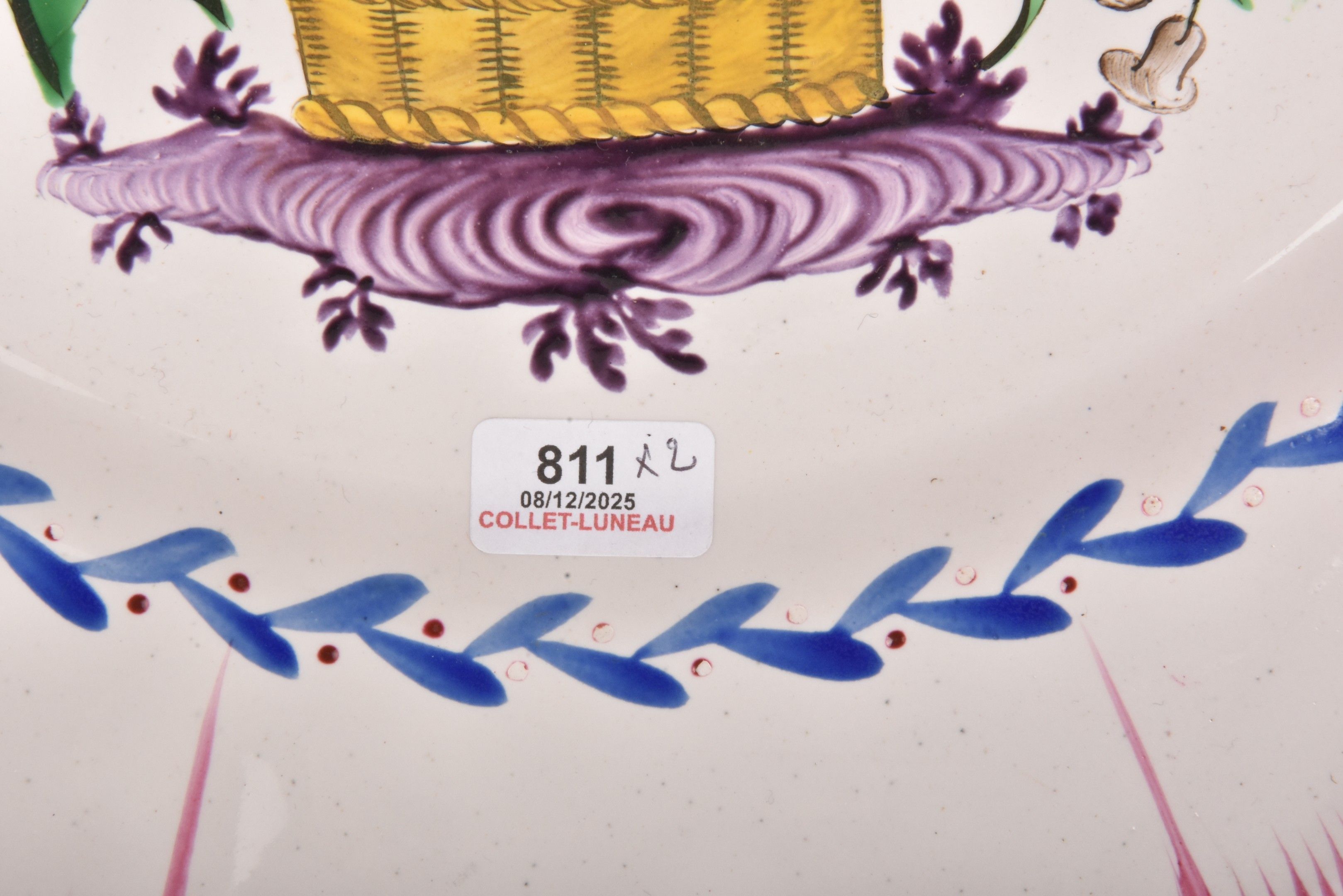 LES ISLETTES. Pair of earthenware dishes decorated with a basket of flowers, the wing decorated with a blue frieze.