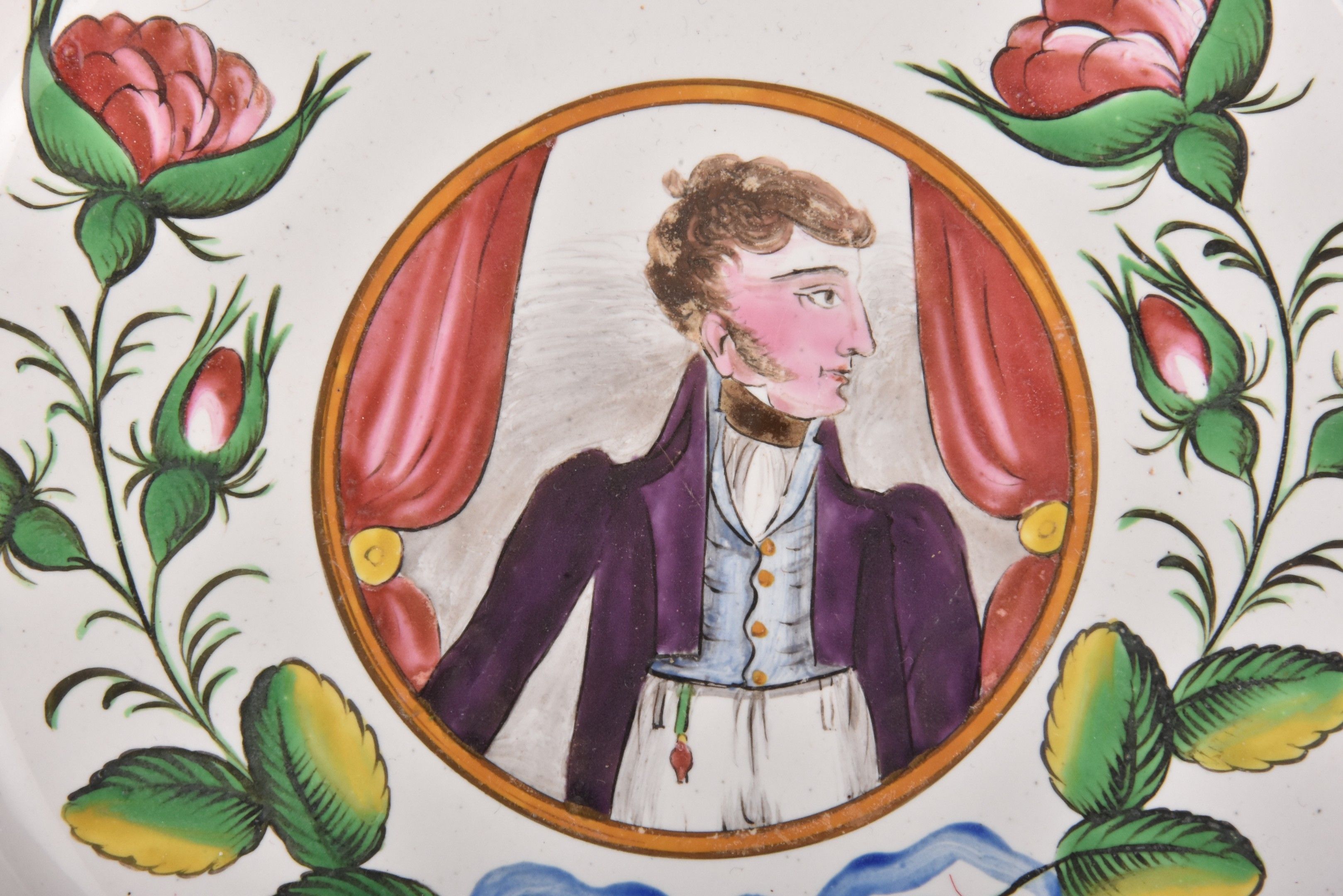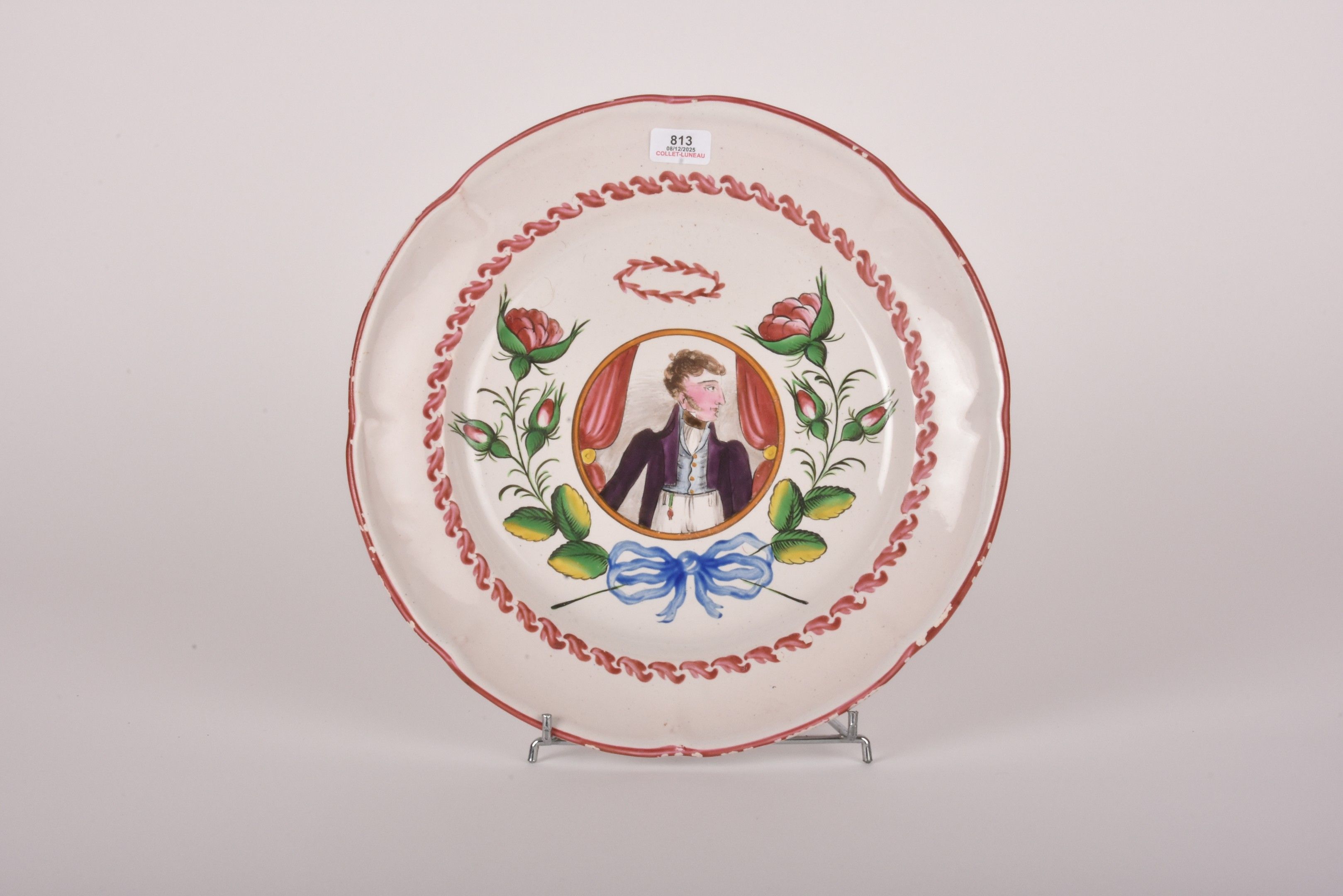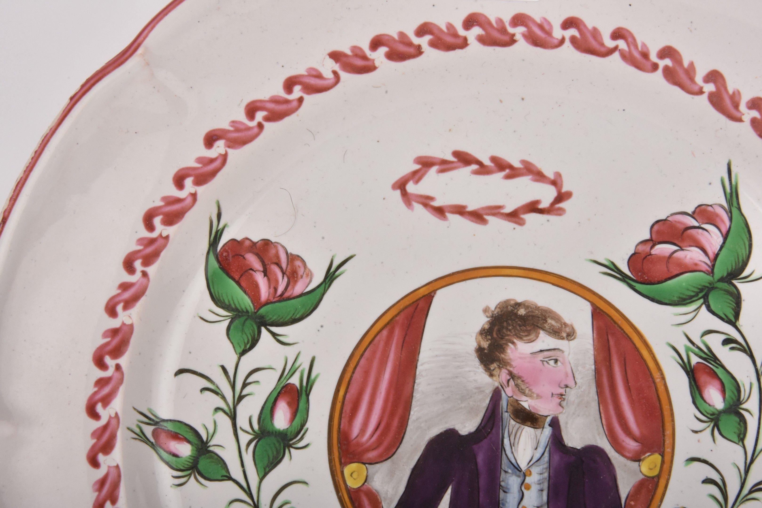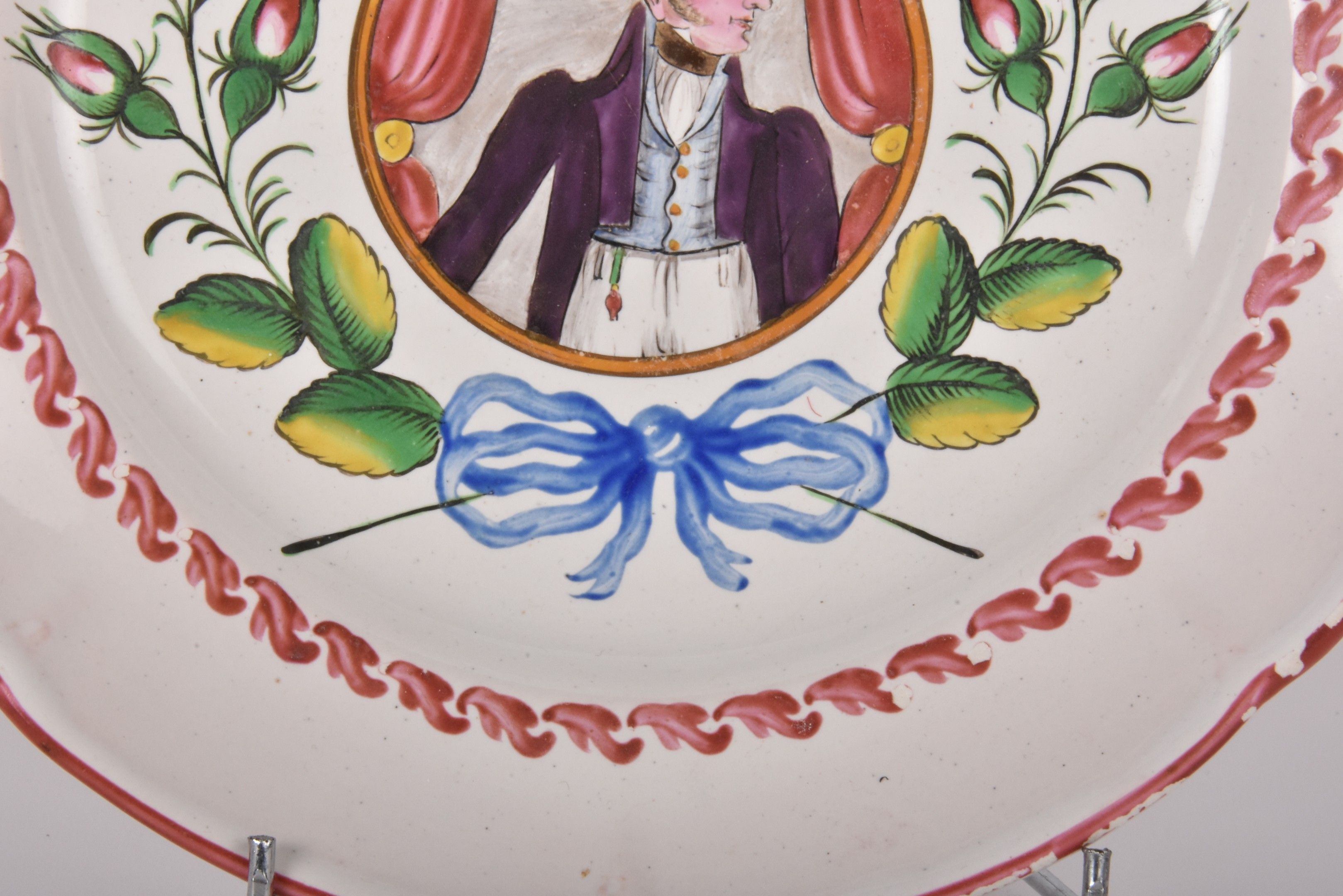 LES ISLETTES. Earthenware plate decorated with a portrait of "Promised" in a cartouche surmounted by a garland symbolising union, surrounded by roses.