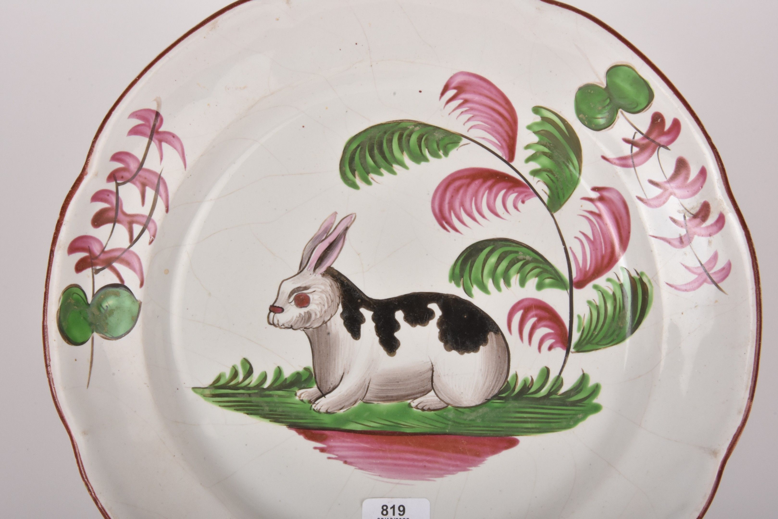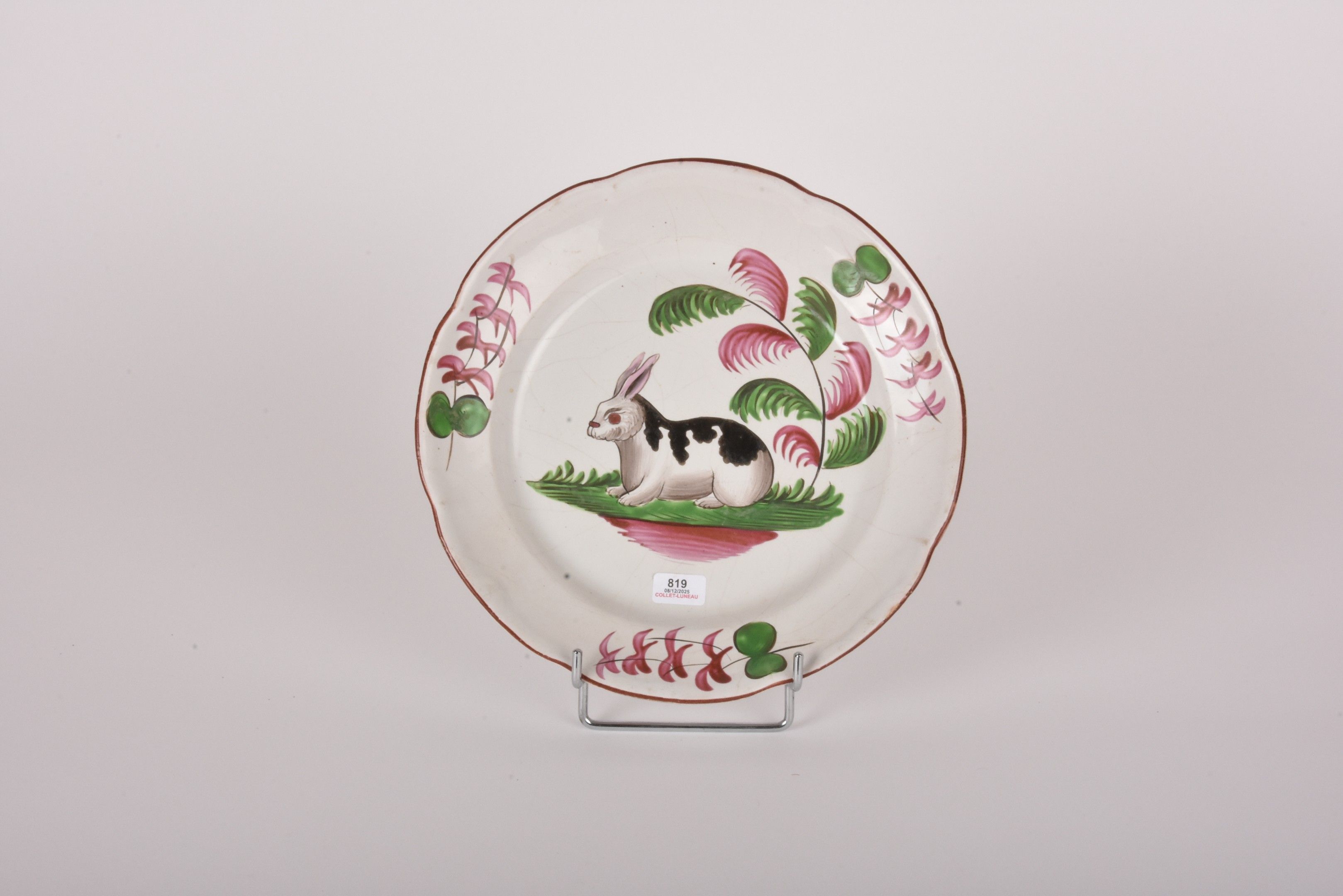 LES ISLETTES. Earthenware plate decorated with a rabbit, the wing with a triple plant motif.
