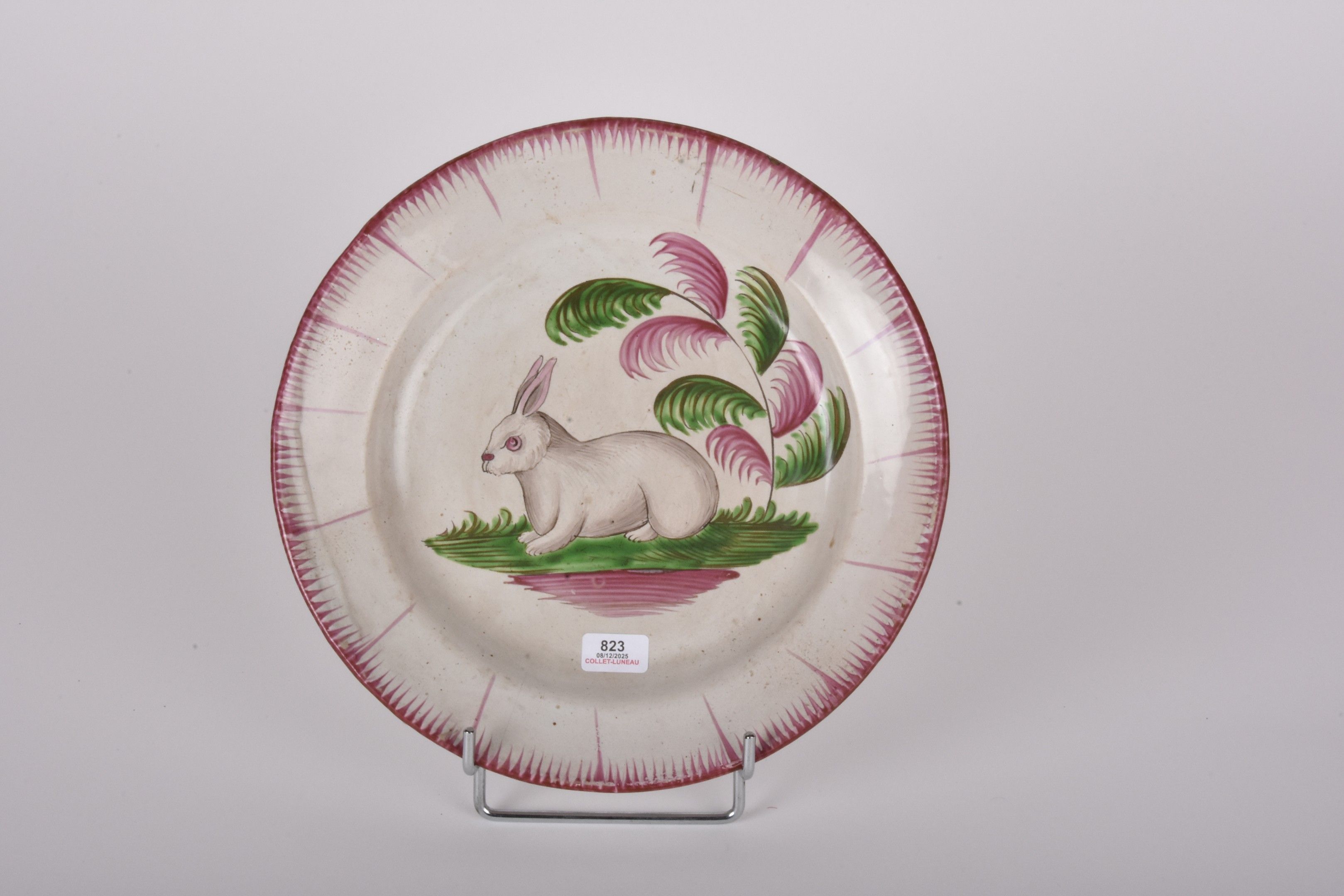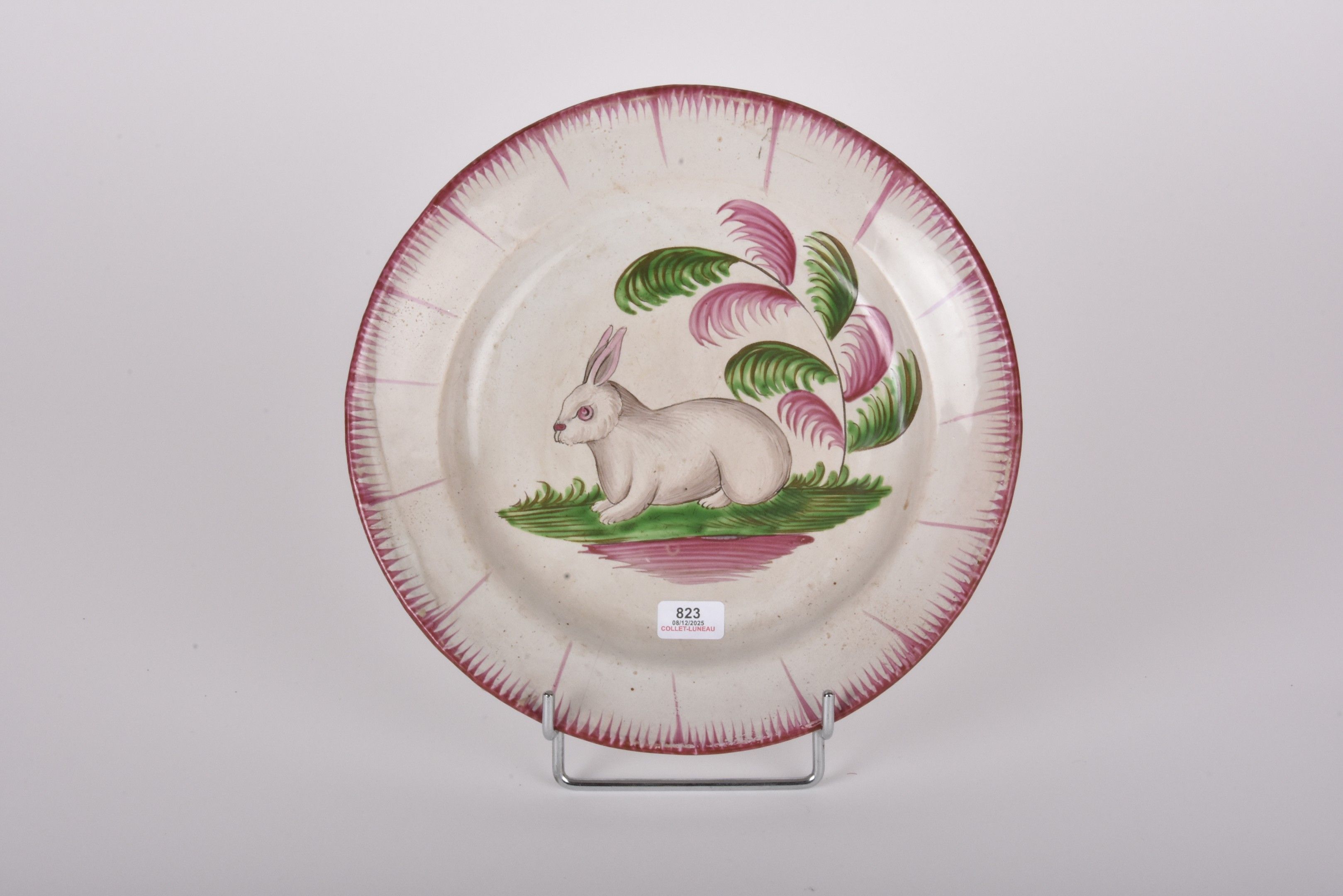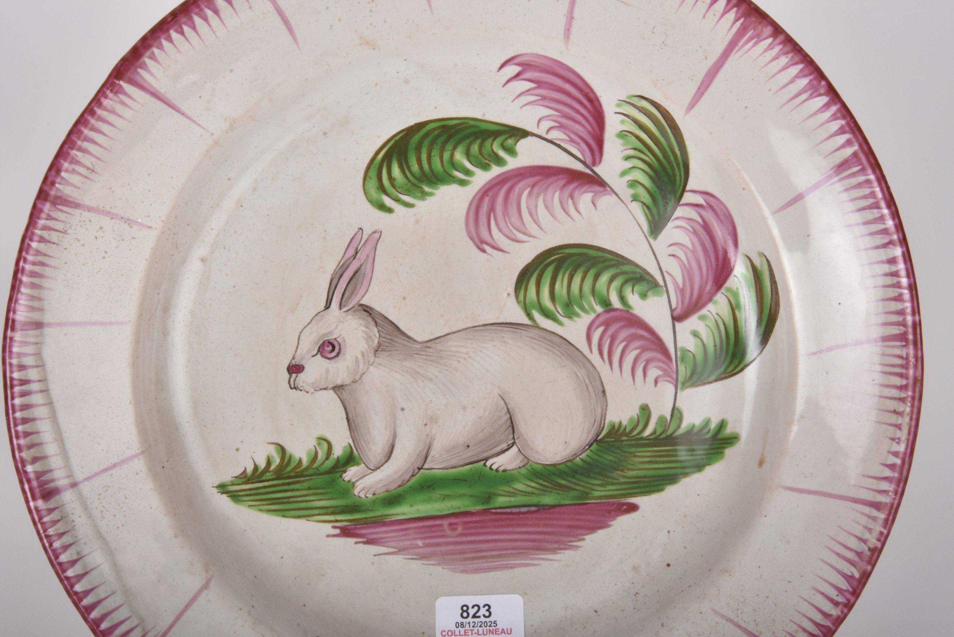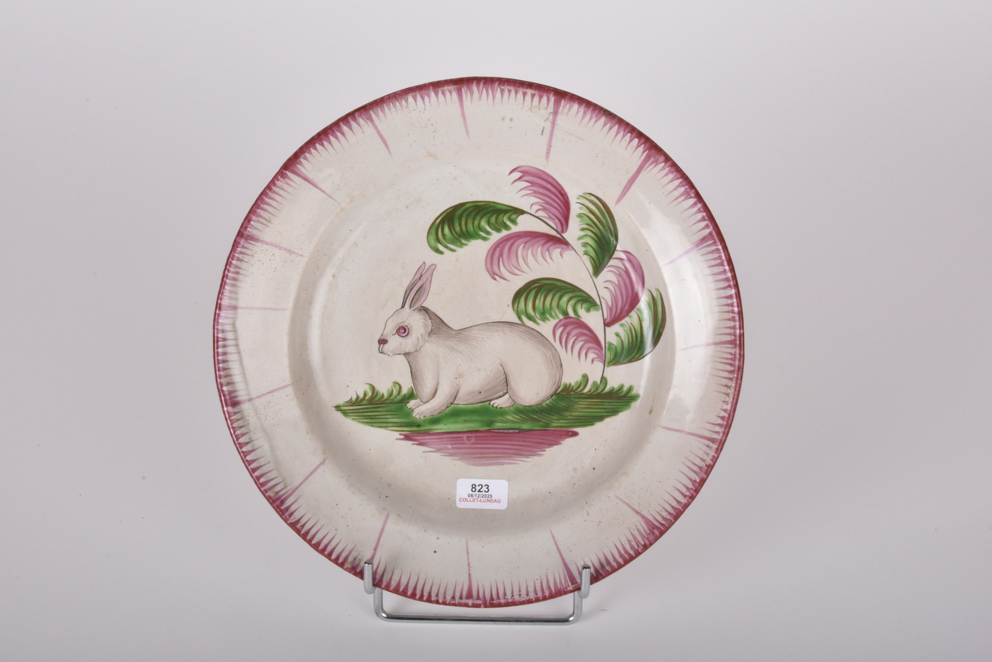 LES ISLETTES - Earthenware plate decorated with a white rabbit under a feathered tree. The wing is combed. 19th century. Diam. 22 cm