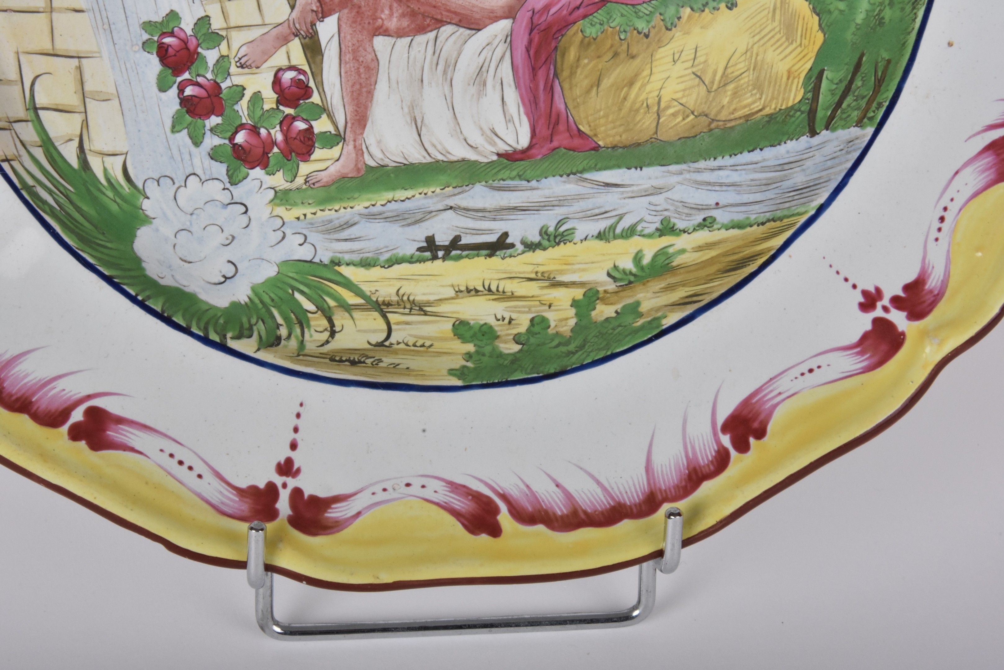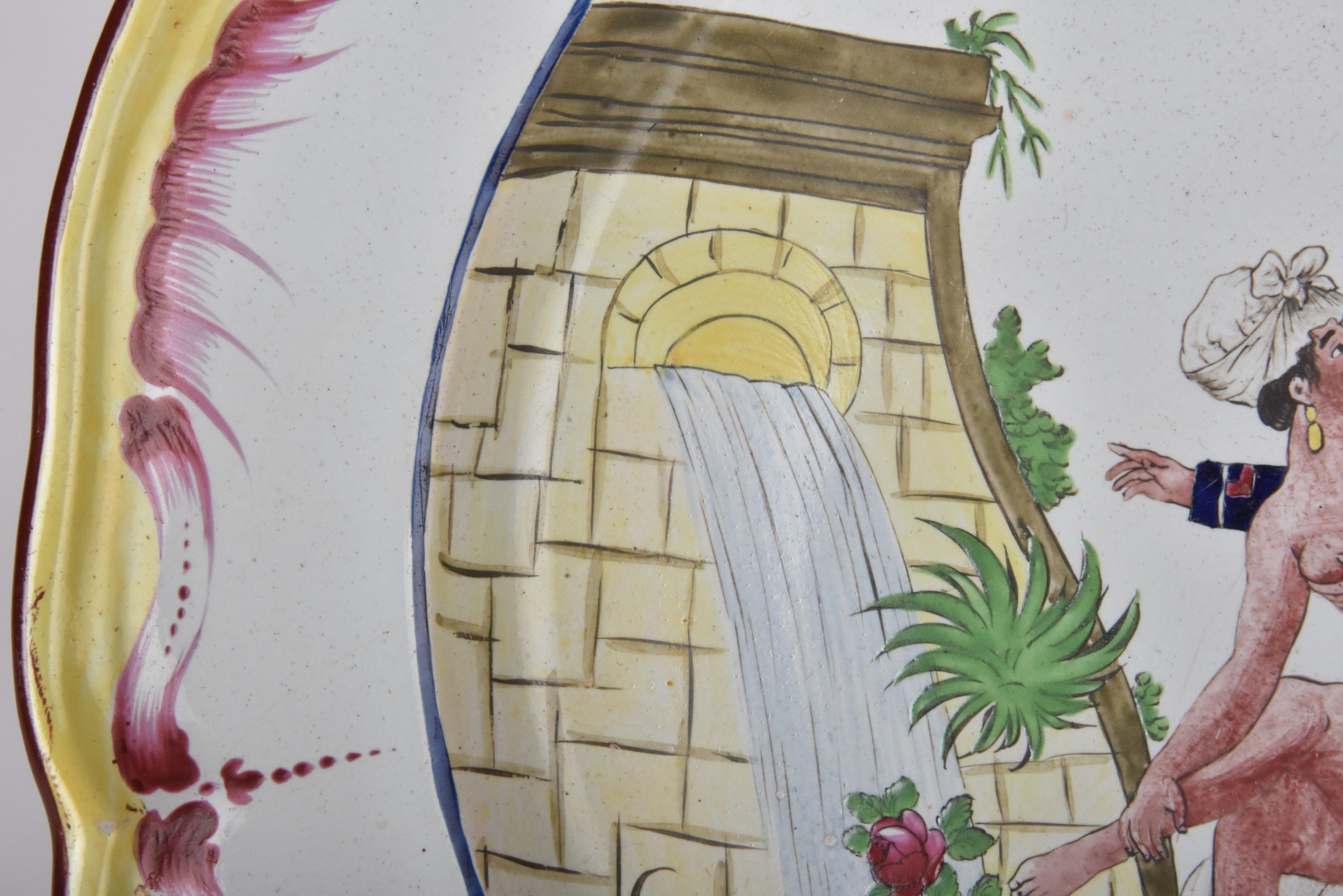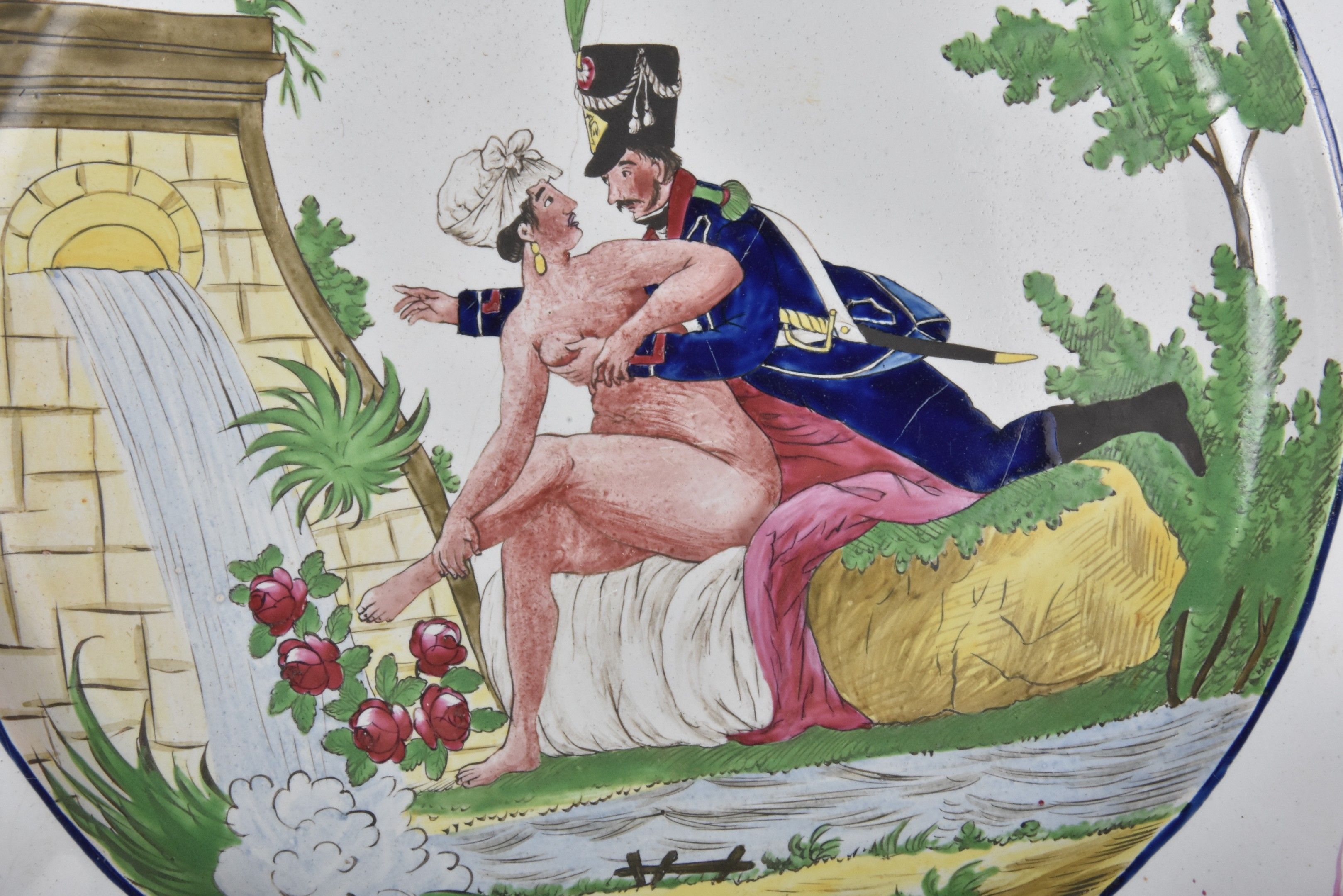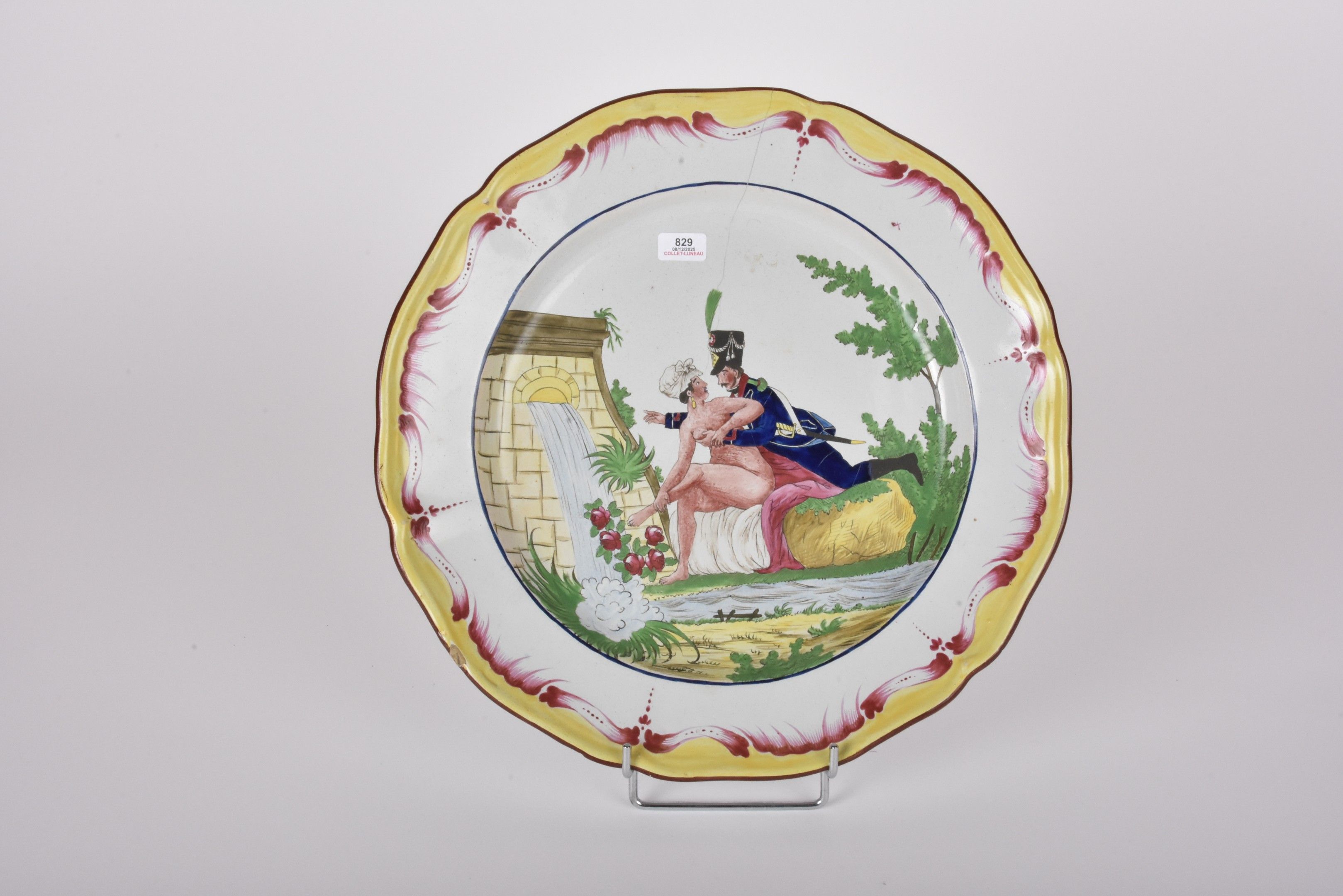 LES ISLETTES Dupré period - Earthenware dish with saucy decoration of a soldier and a naked woman near a fountain. The poly-lobed wing is decorated with asparagus, fleurons and yellow fillets (crack and chips). diam 31 cm