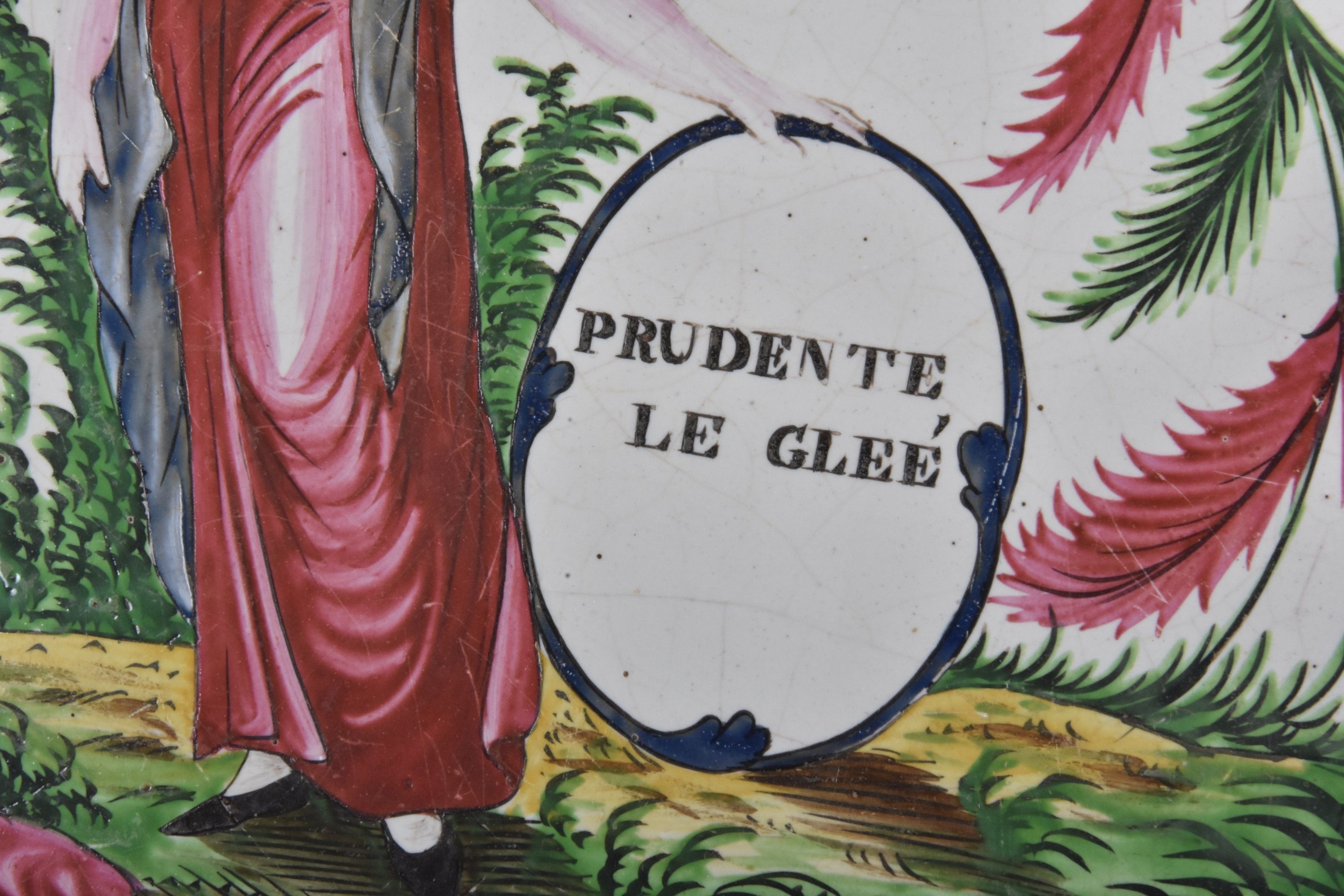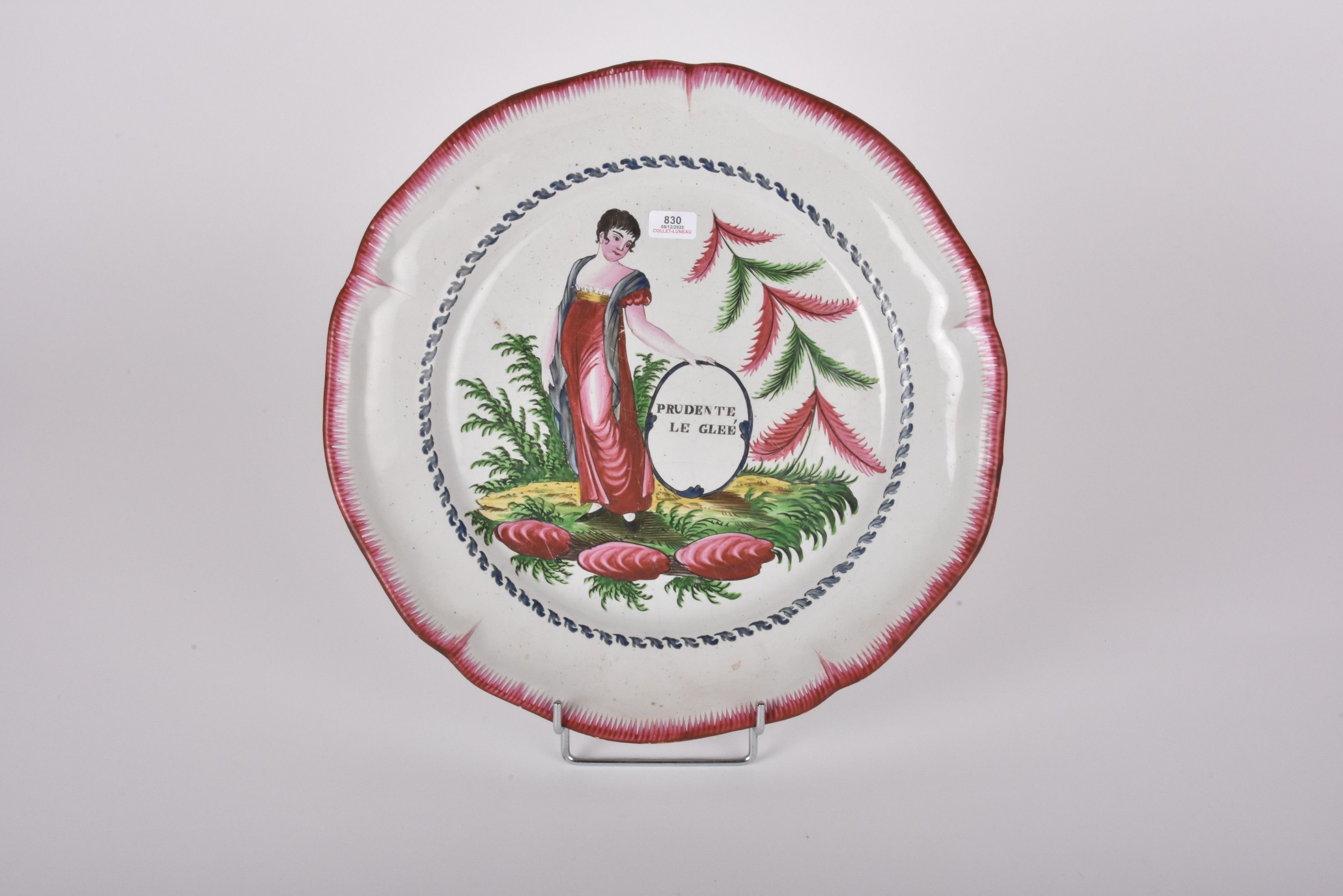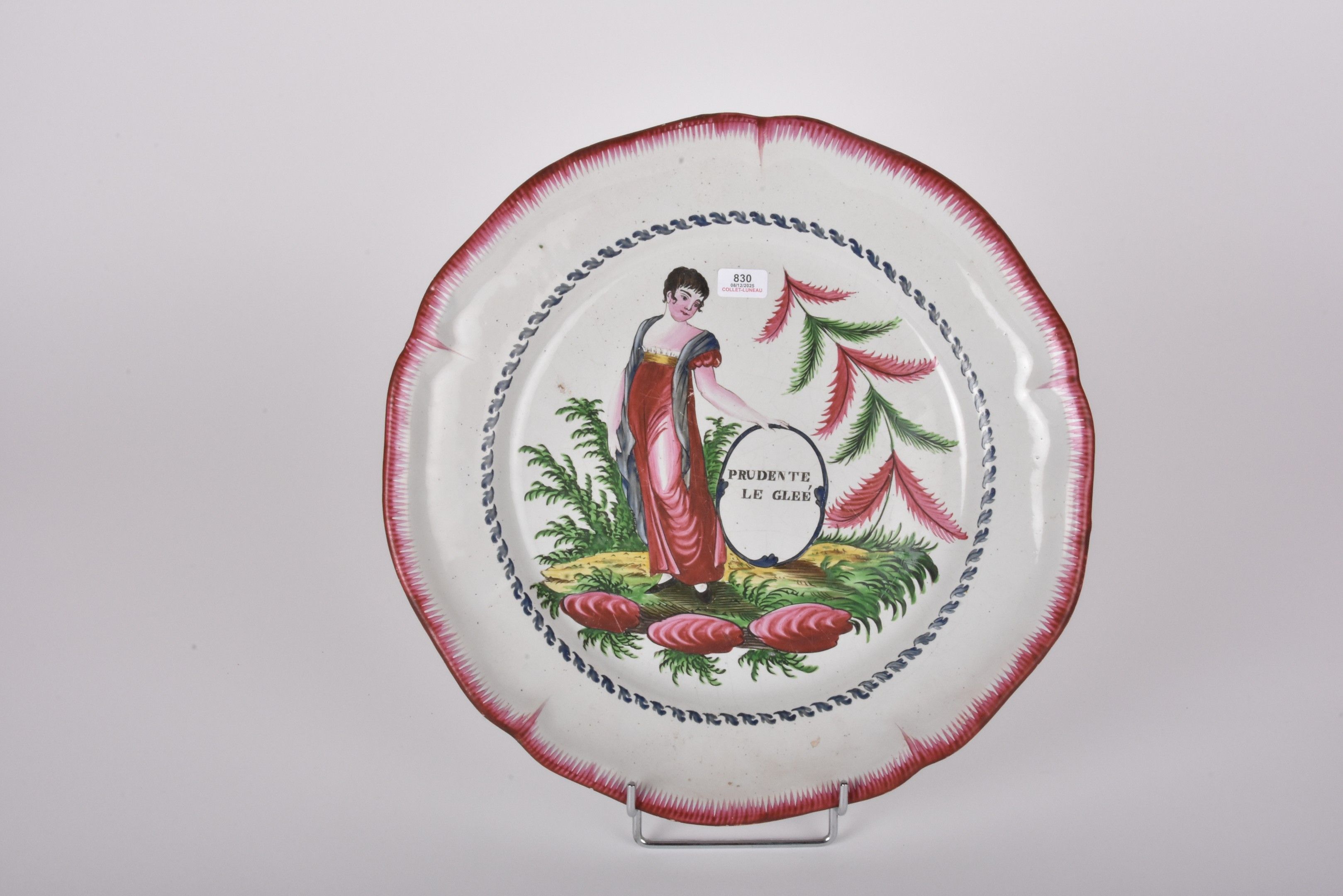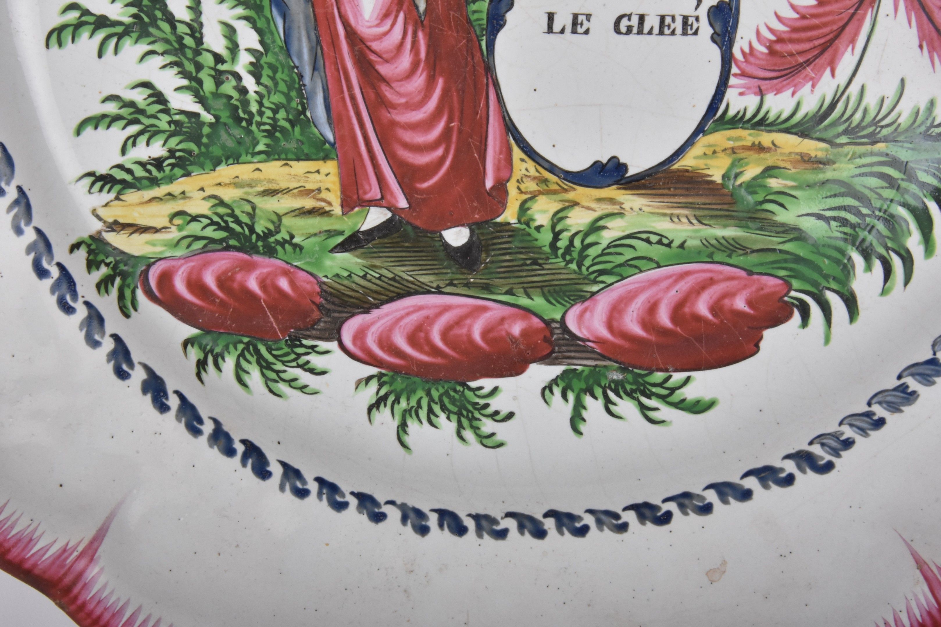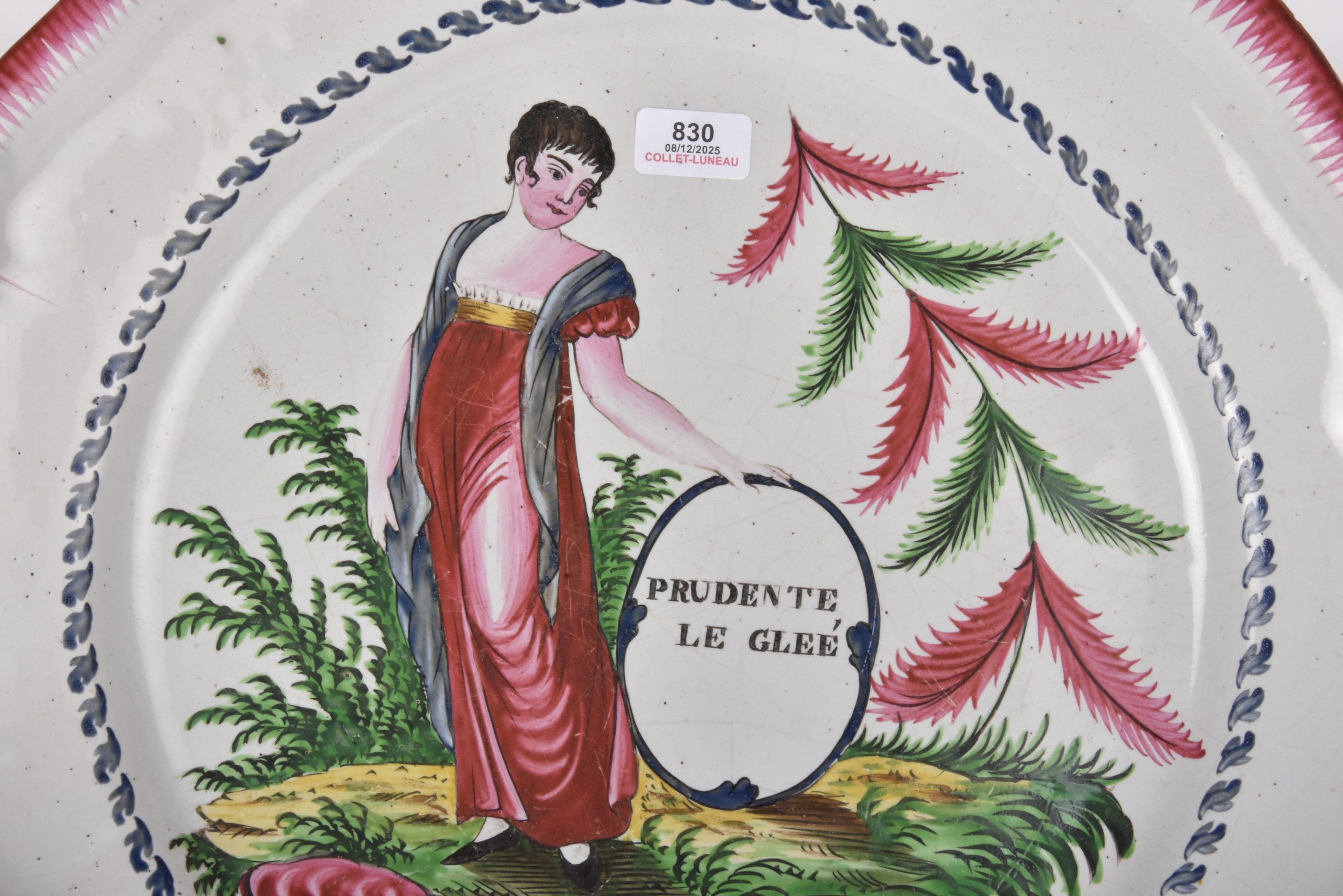 LES ISLETTES Dupré period - Earthenware dish with patronymic decoration of a young woman holding a "Prudente Le Glée" medallion. The wing has a combed poly-lobed edge and a frieze of blue cat's tongues (slight paint chips around the edge). Diameter: 30.5 cm